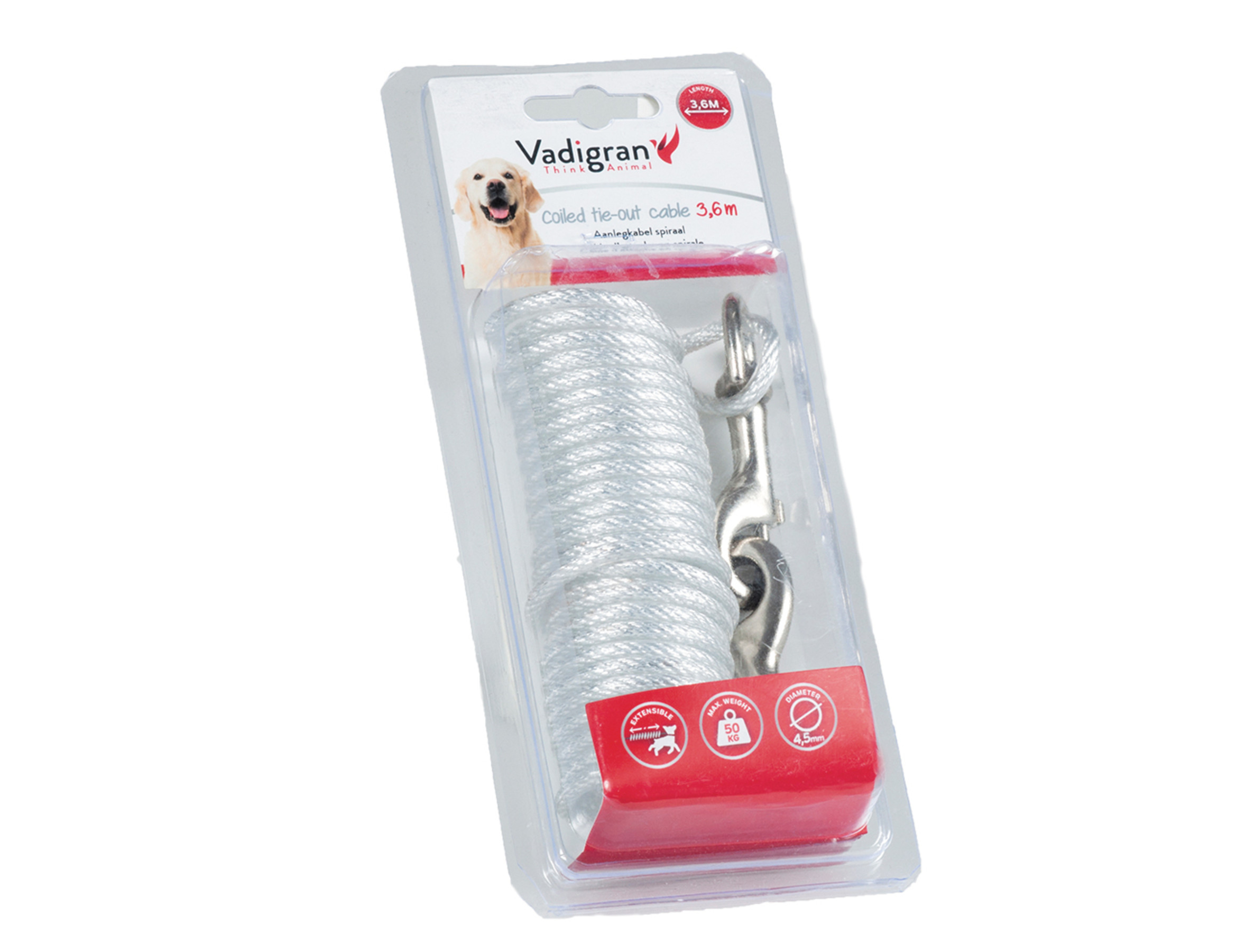 Leg uw hond veilig aan met deze spiraalvormige, gegalvaniseerde stalen kabel; de spiraalvorm zorgt ervoor dat de poten van uw hond niet verstrikt raken; de beschermende plastic laag makt deze kabel stevig; heeft een karabijnhaak aan elk uiteinde; geschikt voor honden tot 50 kg