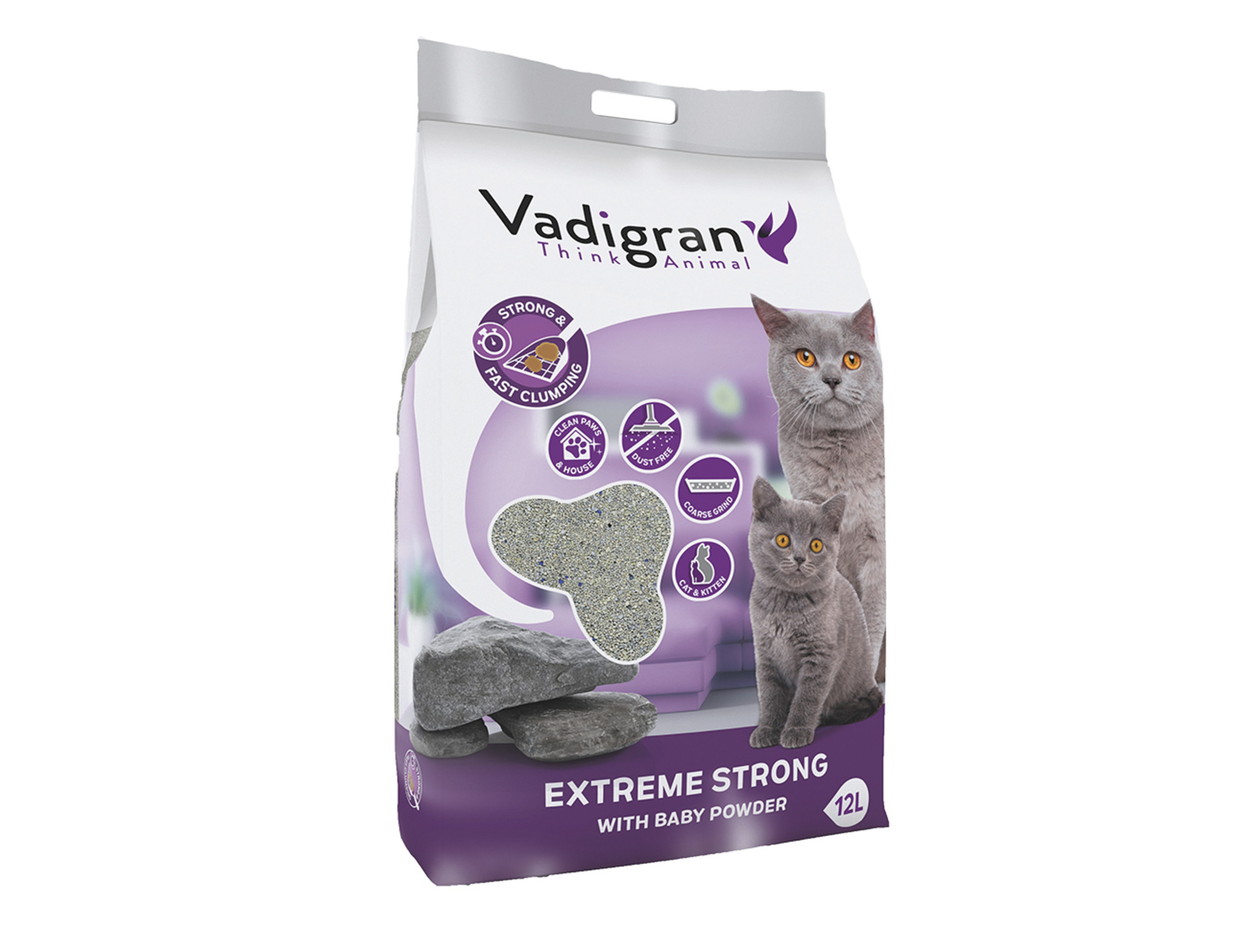 Cat Litter Clump Extreme Strong is uniek dankzij de grove structuur en de toevoeging van extra zeoliet. Hierdoor worden keiharde klonters gevormd die niet brokkelen en zeer eenvoudig te verwijderen zijn.Door de snelle absorptie van vocht en de grove structuur van de korrel, blijft de bodem van uw kattenbak proper. Clump Extreme Strong kleeft niet aan de pootjes, waardoor uw huis netjes blijft.Dankzij de toegevoegde babypoeder geniet u steeds van een aangename geur!