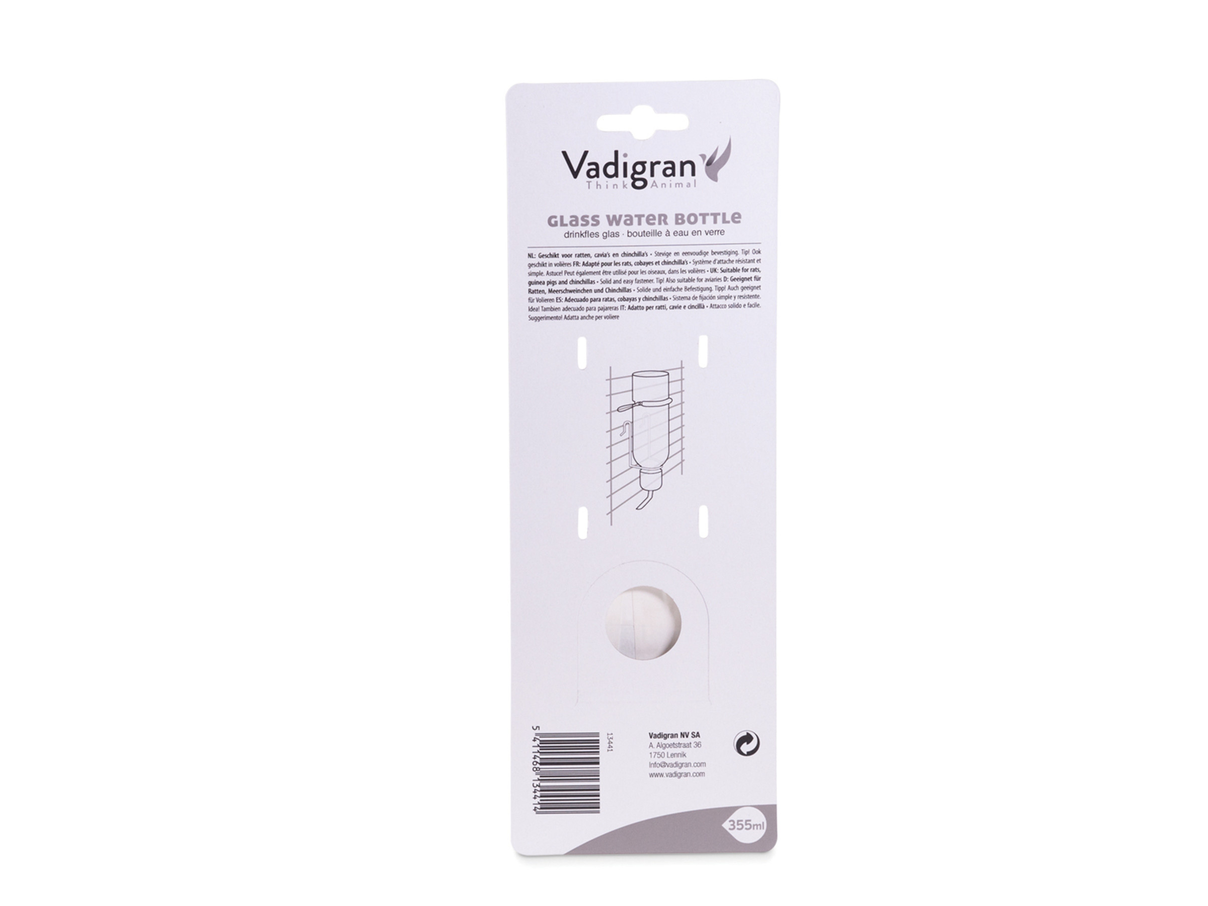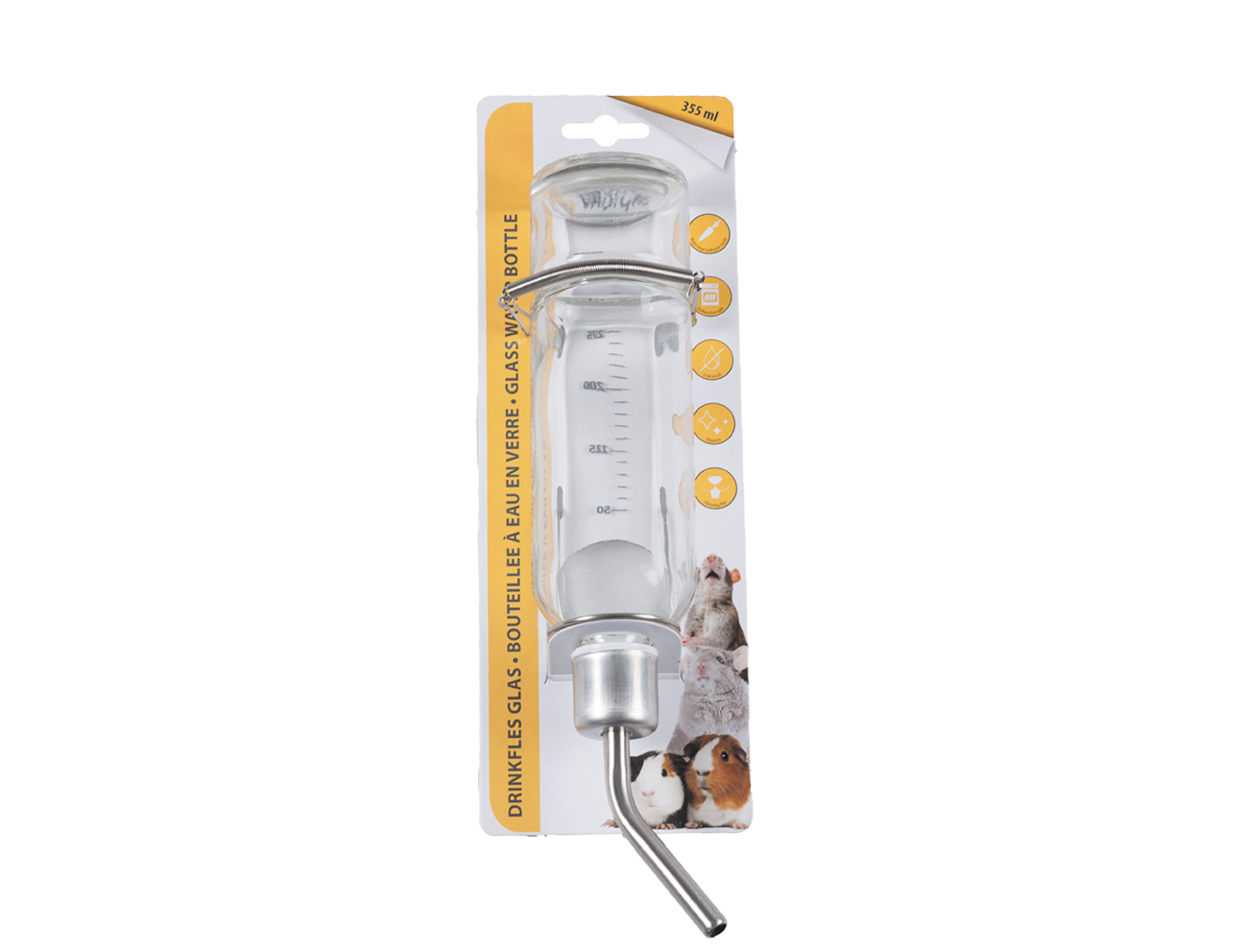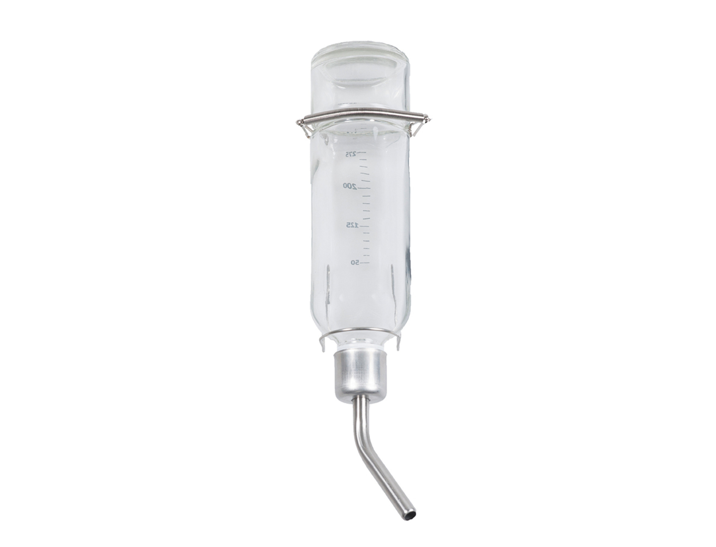 Deze glazen drinkfles met ijzeren beugel voor het stevig vastmaken aan de kooi. De kleine plastic wortel in de fles maakt het gemakkelijk om het waterniveau te zien.