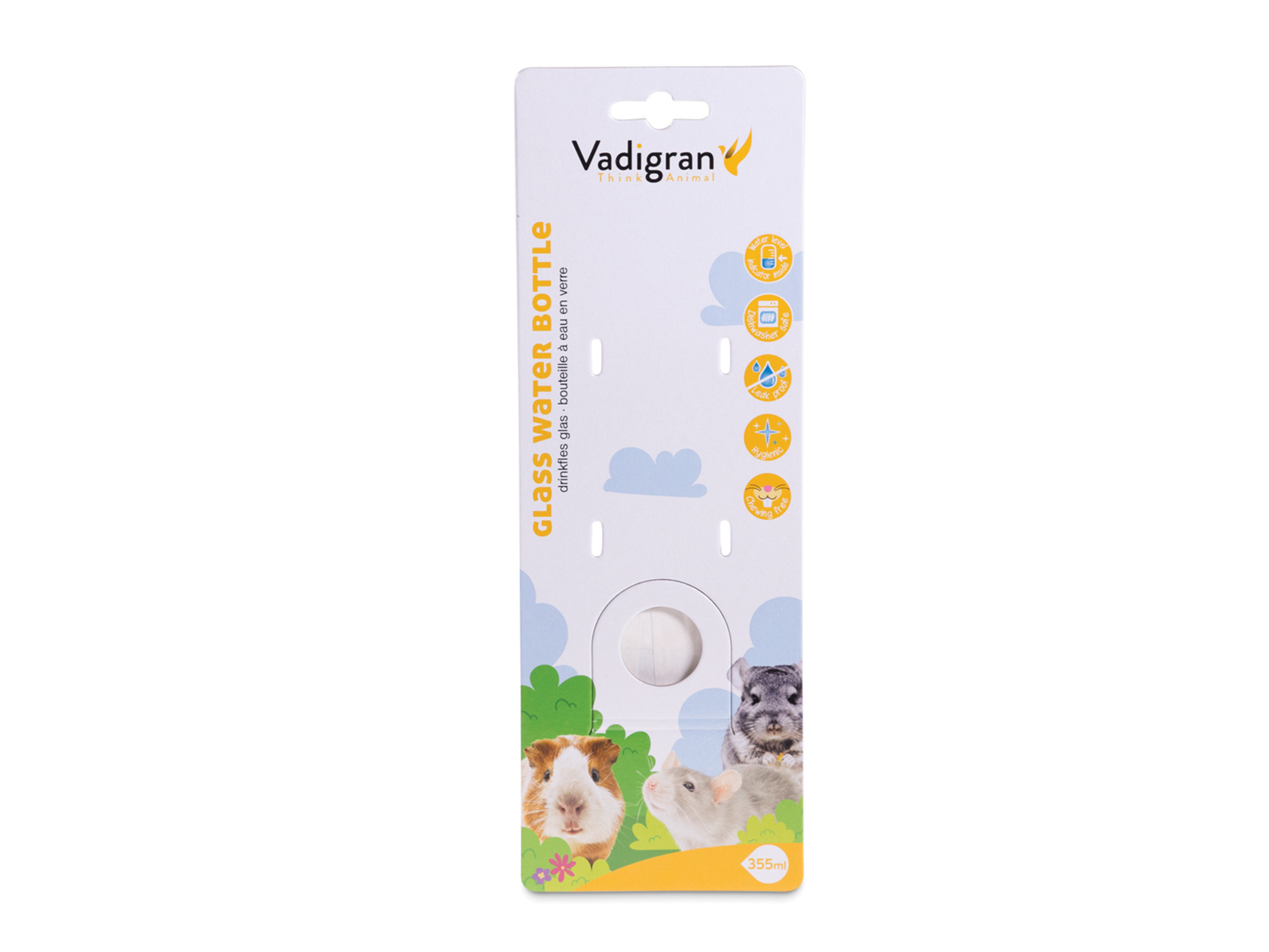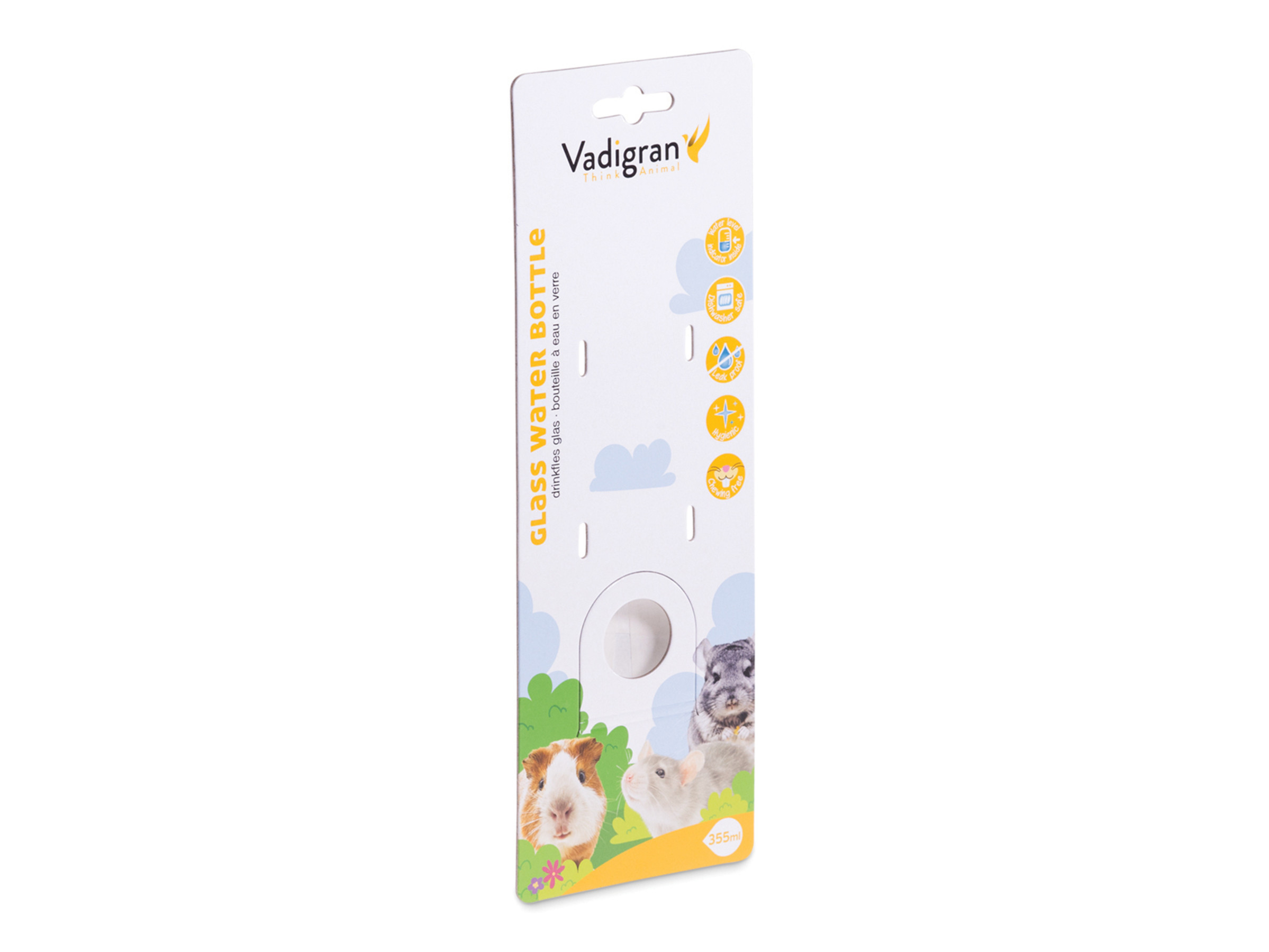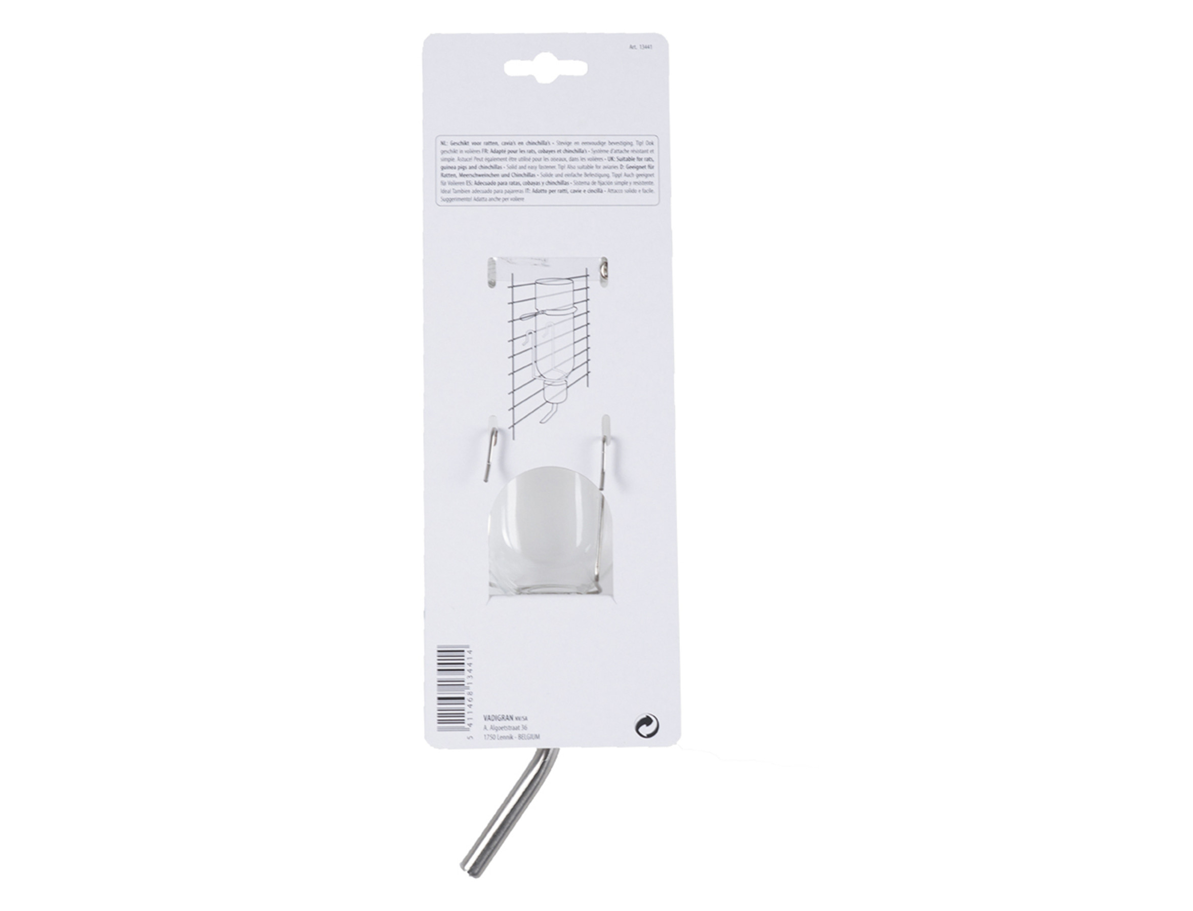 Deze glazen drinkfles met ijzeren beugel voor het stevig vastmaken aan de kooi. De kleine plastic wortel in de fles maakt het gemakkelijk om het waterniveau te zien.