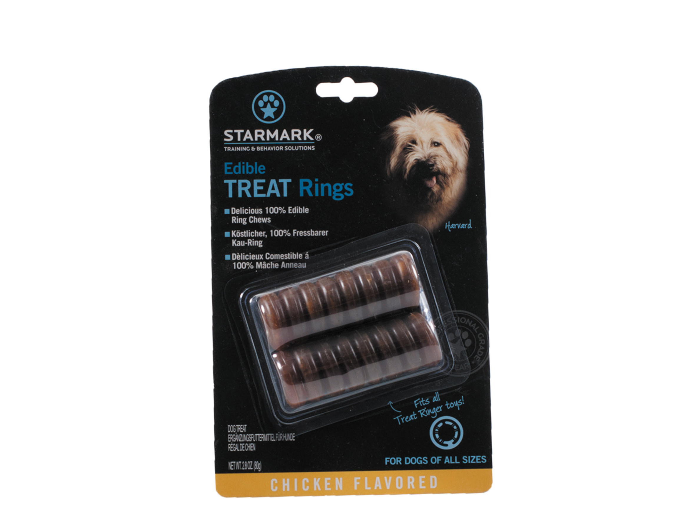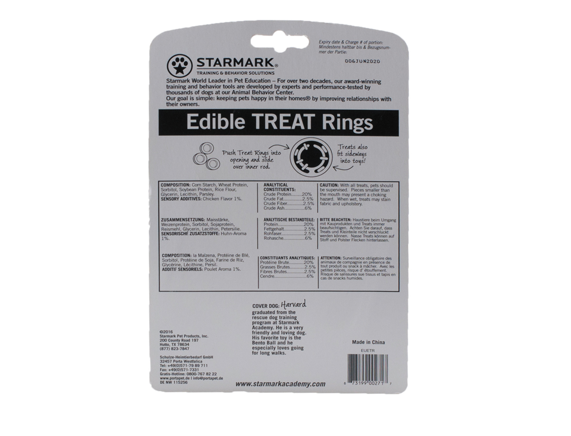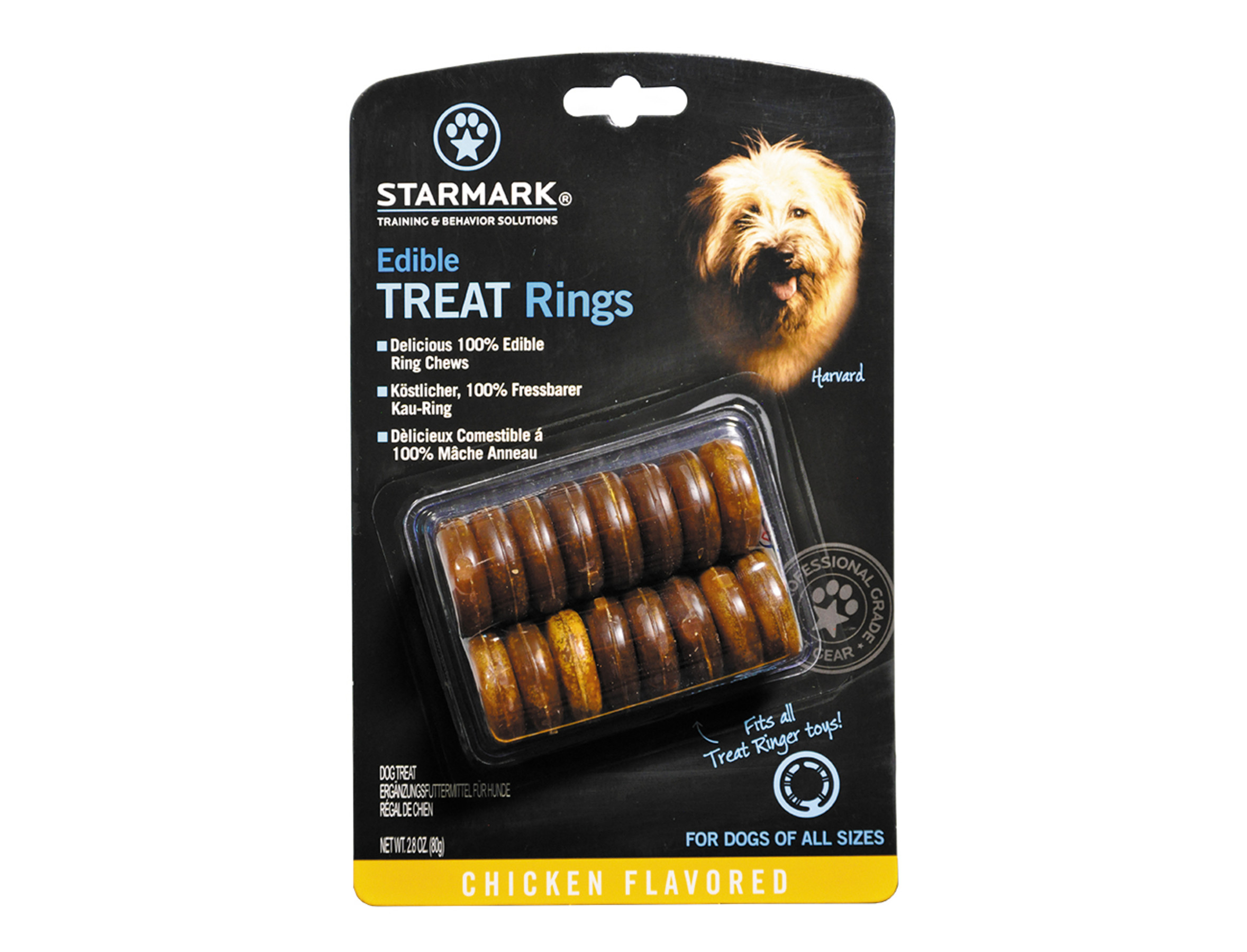 Kauwen op deze lekkere ‘Treat’ snacks is een intensieve bezigheid en helpt de tanden en het tandvlees te verzorgen. Ook helpt kauwen tandsteen te verwijderen. Ze zijn ideaal voor een goede vertering.De ‘Ring’ snack wordt op de binnenste ring gezet, zodat uw hond verplicht is erop te kauwen om hem los te maken.Op deze manier houdt de ‘Ring’ de hond lang bezig terwijl hij alleen is en focust hij zijn aandacht met een kalmerend effect.Deze ring snacks zijn geschikt voor het ”Treat Ringer Orb” speelgoed (12993).Een heerlijke en natuurlijke kippensmaak, zeer geliefd door honden.