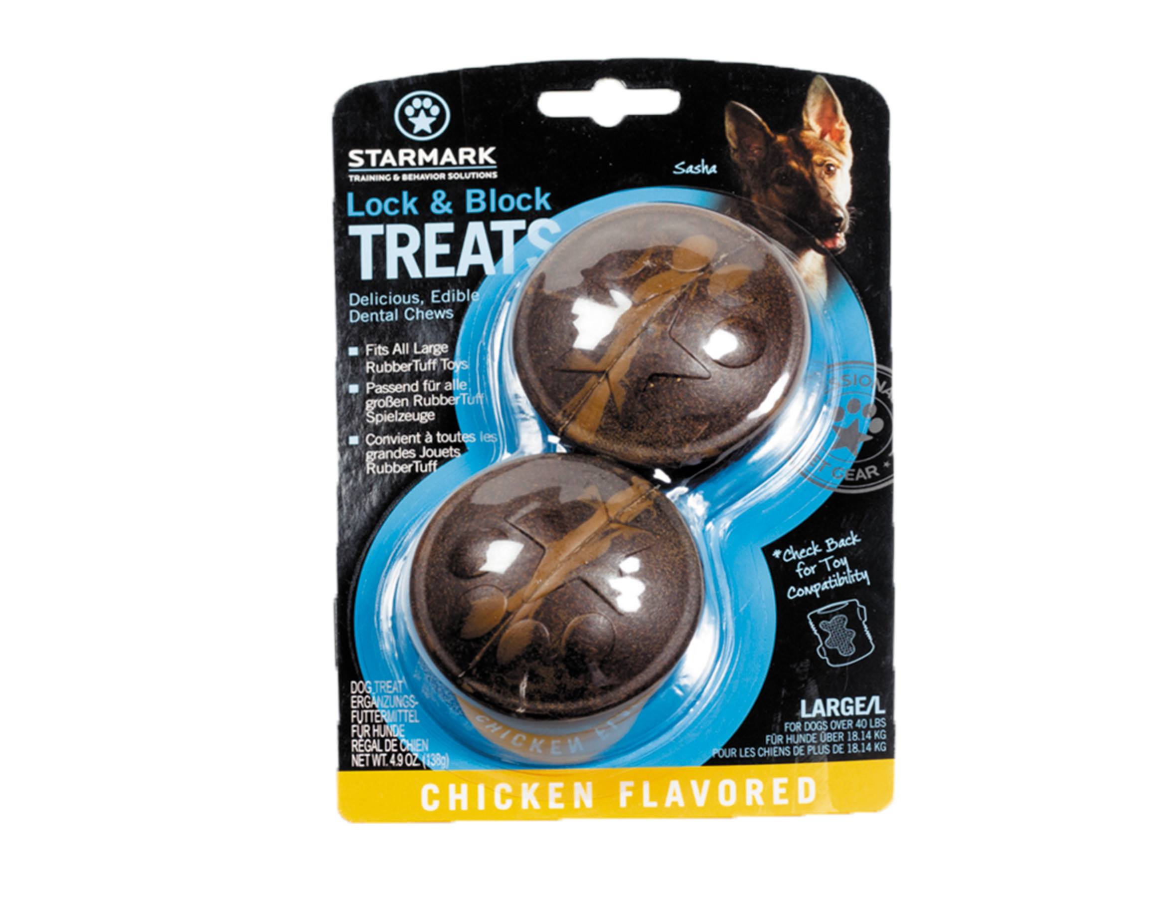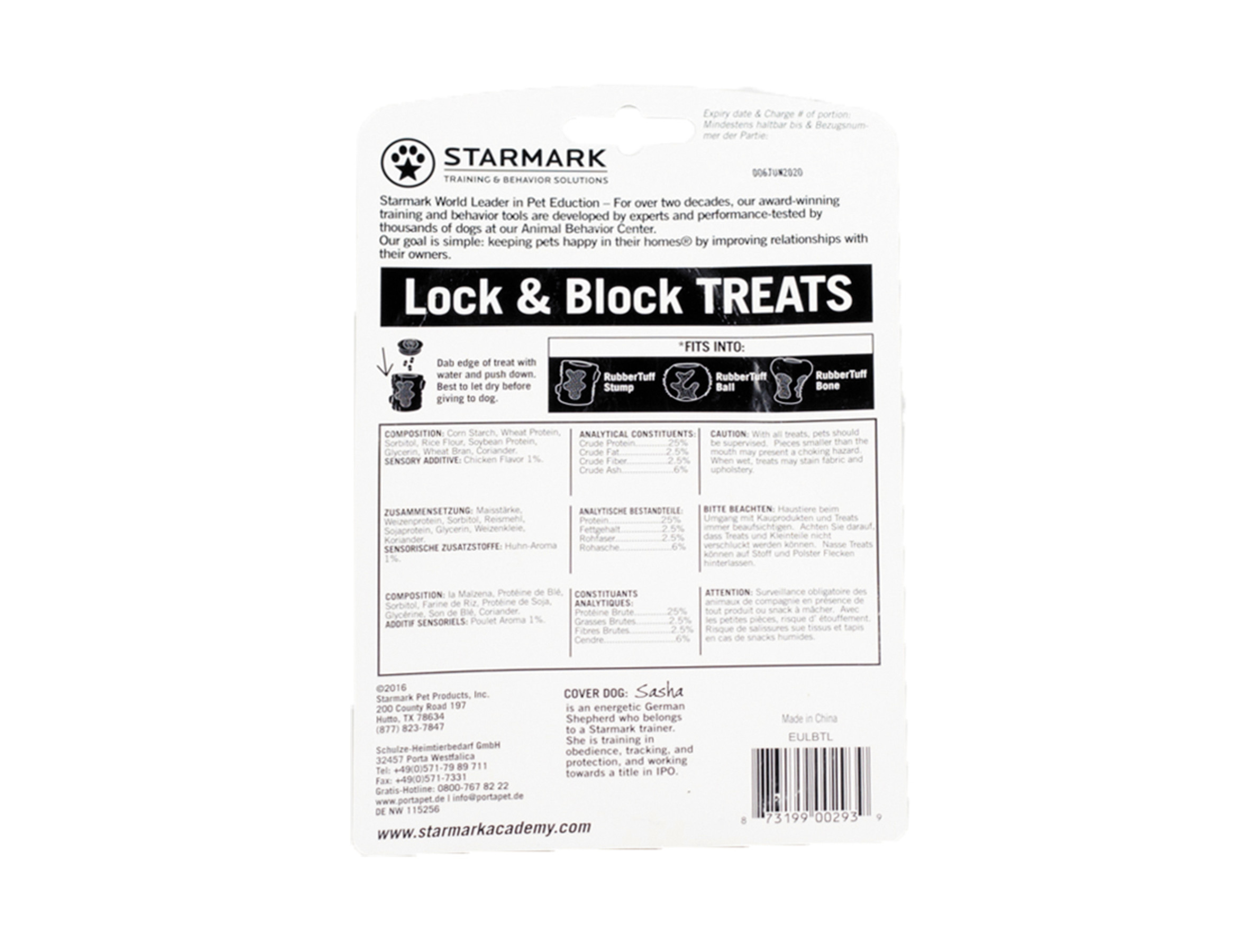 Door de verhoogde vorm en het langdurig kauwen op de snack worden de tanden en het tandvlees verzorgd en de tandsteen verwijderd. Ze zijn ideaal voor een goede vertering.De ”Lock&Block Treat S” zit vast in het speelgoed en de hond is verplicht om er zeer lang op te kauwen om de snack los te maken. Op deze manier kan je hond zich langdurig alleen bezighouden met als gevolg een kalmerend effect op je hond.De ”Lock&Block Treat S” is geschikt voor het speelgoed “RubberTuff Bone S” (12987).
