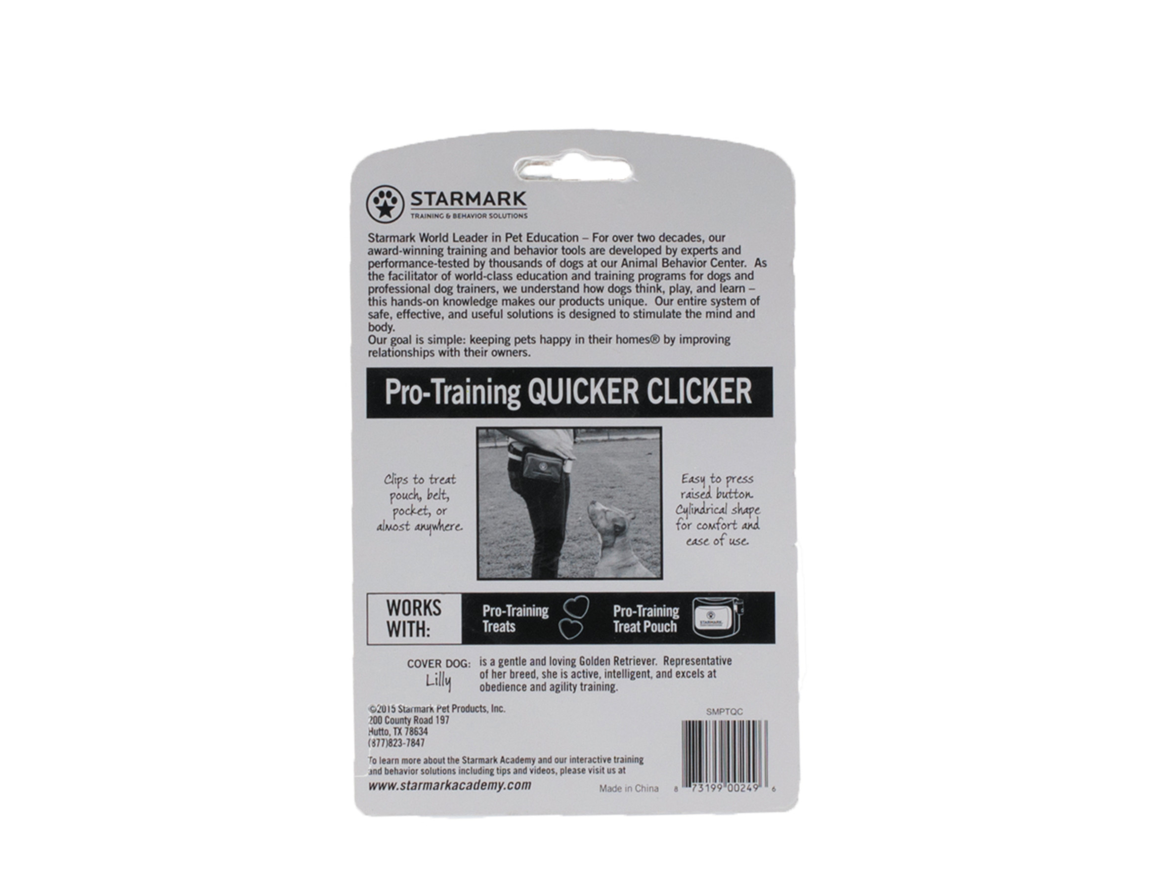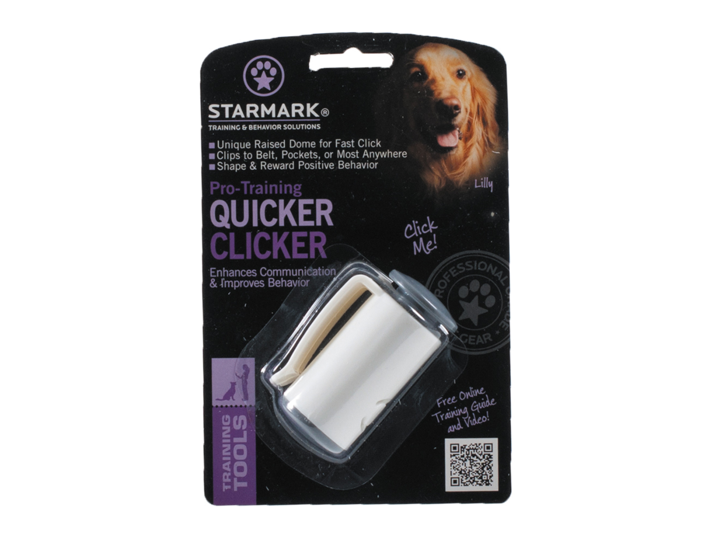 Versnel het leerproces met 50% door het precieze moment waarop goed gedrag zich voordoet te laten merken aan je hond met de Pro-Training Clicker.De wetenschappelijke methode die gebruikt wordt in de Starmark Academy kan u ook thuis toepassen door terugkomend positief gedrag te belonen. Inclusief Stap-voor-stap training gids.Comfortabel in de hand, makkelijk vast te houden. Bevat verhoogde knop om gemiste clicks te voorkomen. Roestvrije clicker.Gecombineerd met de ‘Interactive Treats’ (13000) is deze Clicker ideaal voor de training en opvoeding van uw hond.
