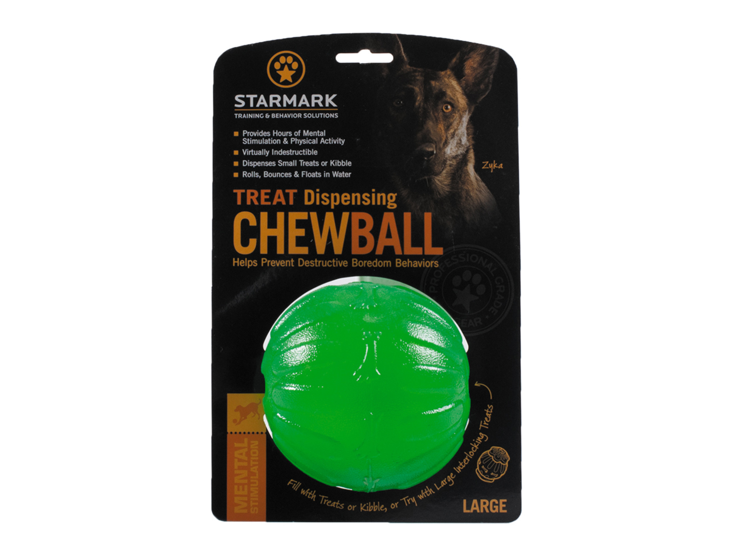 Het “Treat Chew Ball” systeem biedt urenlang uitdagingen en een uitstekende training voor de opvoeding met als resultaat positief gedrag.Dit speelgoed is bestudeerd en ontworpen door professionele trainers. Hun doel is om de hond gelukkig te maken en de relatie met zijn meester te verbeteren.Uiterst duurzaam maar zacht in de mond van uw hond. De “Treat Chew Ball” is ideaal om je hond te voeden, trainen of om te spelen. Het rolt, springt en drijft op het water. Uitstekend voor de mondhygiëne.Gemaakt van vrijwel onverwoestbaar materiaal, sterker dan rubber! Zeer geschikt voor krachtige kauwers. Bevat geen latex, vinyl en ftalaten.Verkrijgbaar in twee maten. Inclusief “Everlasting Treat Original S” (1887) met kipsmaak.