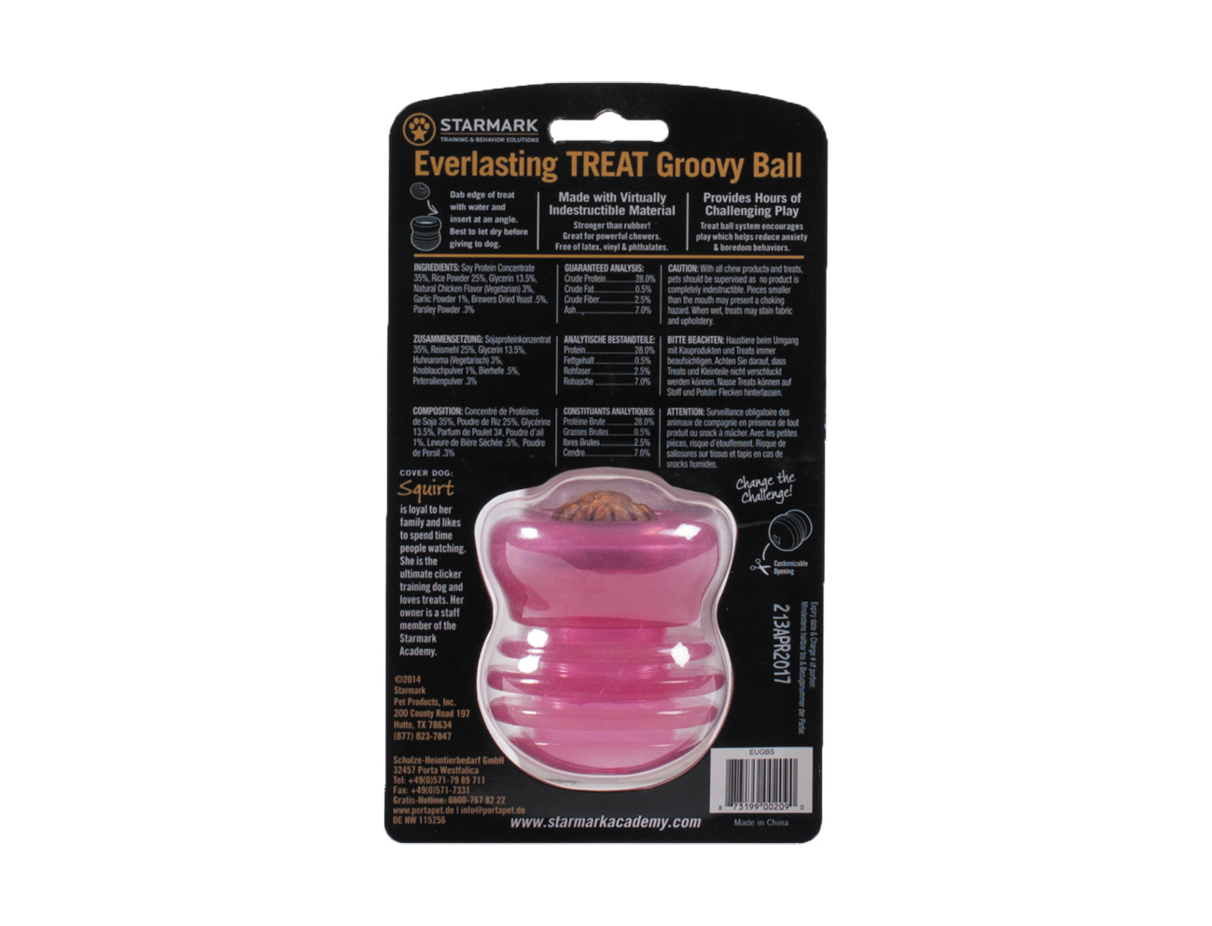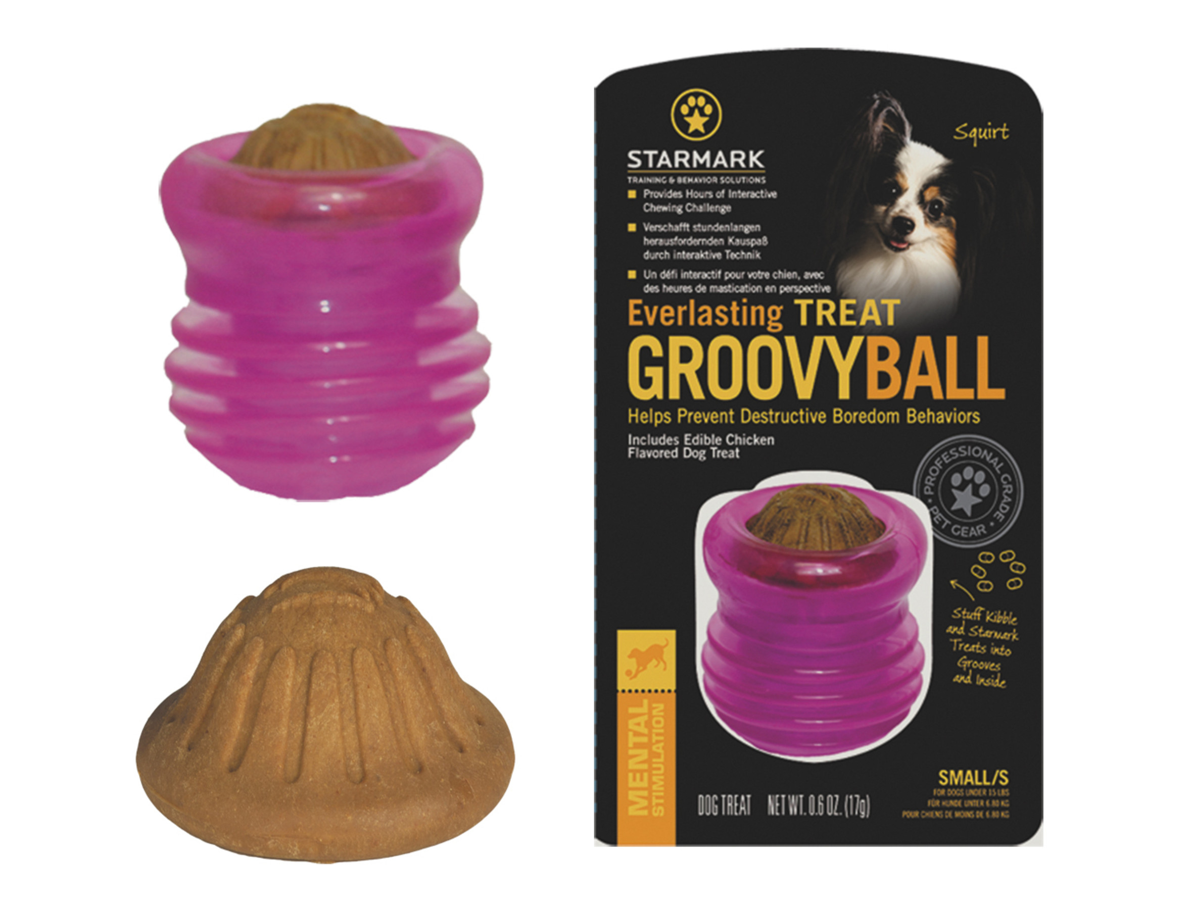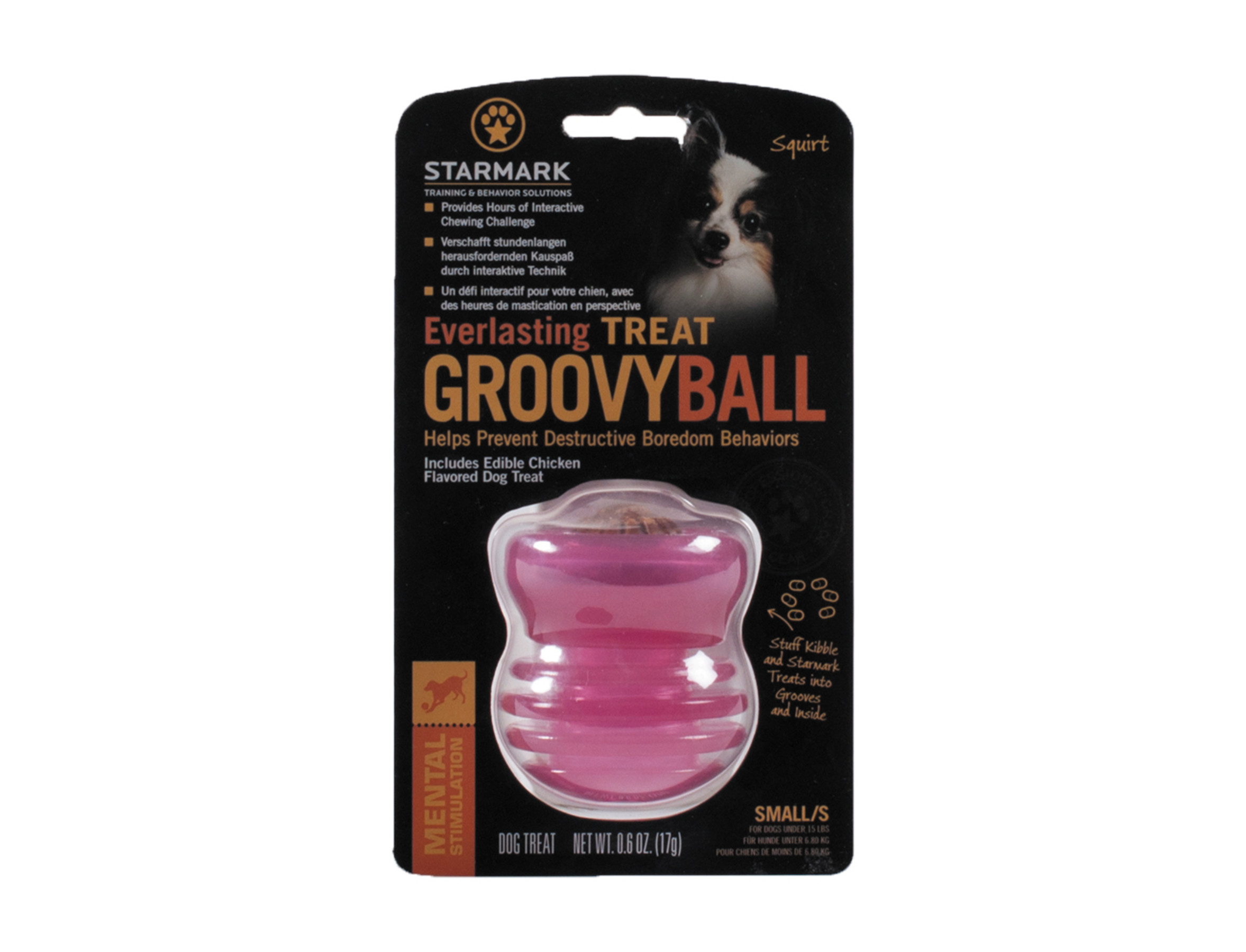 Het “Treat Groovy Ball” systeem biedt urenlang uitdagingen en een uitstekende training voor de opvoeding met als resultaat positief gedrag.Dit speelgoed is bestudeerd en ontworpen door professionele trainers. Hun doel is om de hond gelukkig te maken en de relatie met zijn meester te verbeteren.Uiterst duurzaam maar zacht in de mond van uw hond. De “Treat Groovy Ball” is ideaal om je hond bezig te houden. Uitstekend voor de mondhygiëne.Gemaakt van vrijwel onverwoestbaar materiaal, sterker dan rubber! Zeer geschikt voor krachtige kauwers. Bevat geen latex, vinyl en ftalaten.Verkrijgbaar in small, medium en large. Inclusief “Everlasting Treat Original S” (1887) met kipsmaak.