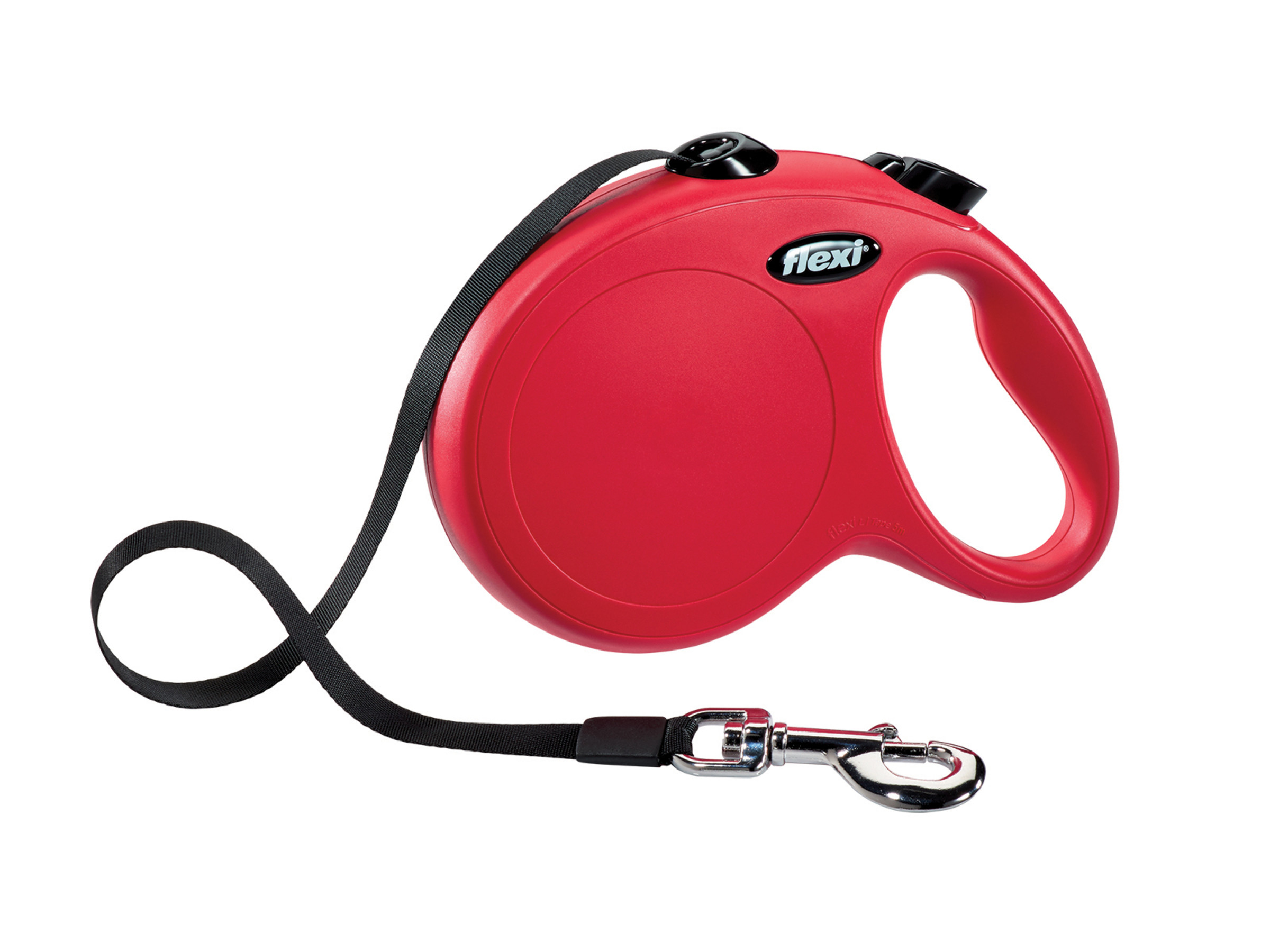 Alle Flexi’s zijn uitgerust met een kortslagremsysteem. Reageert quasi onmiddellijk. Door de remknop in te drukken en een lichte trek te geven, kan je je hond kort bevelen of terug naar jou leiden.