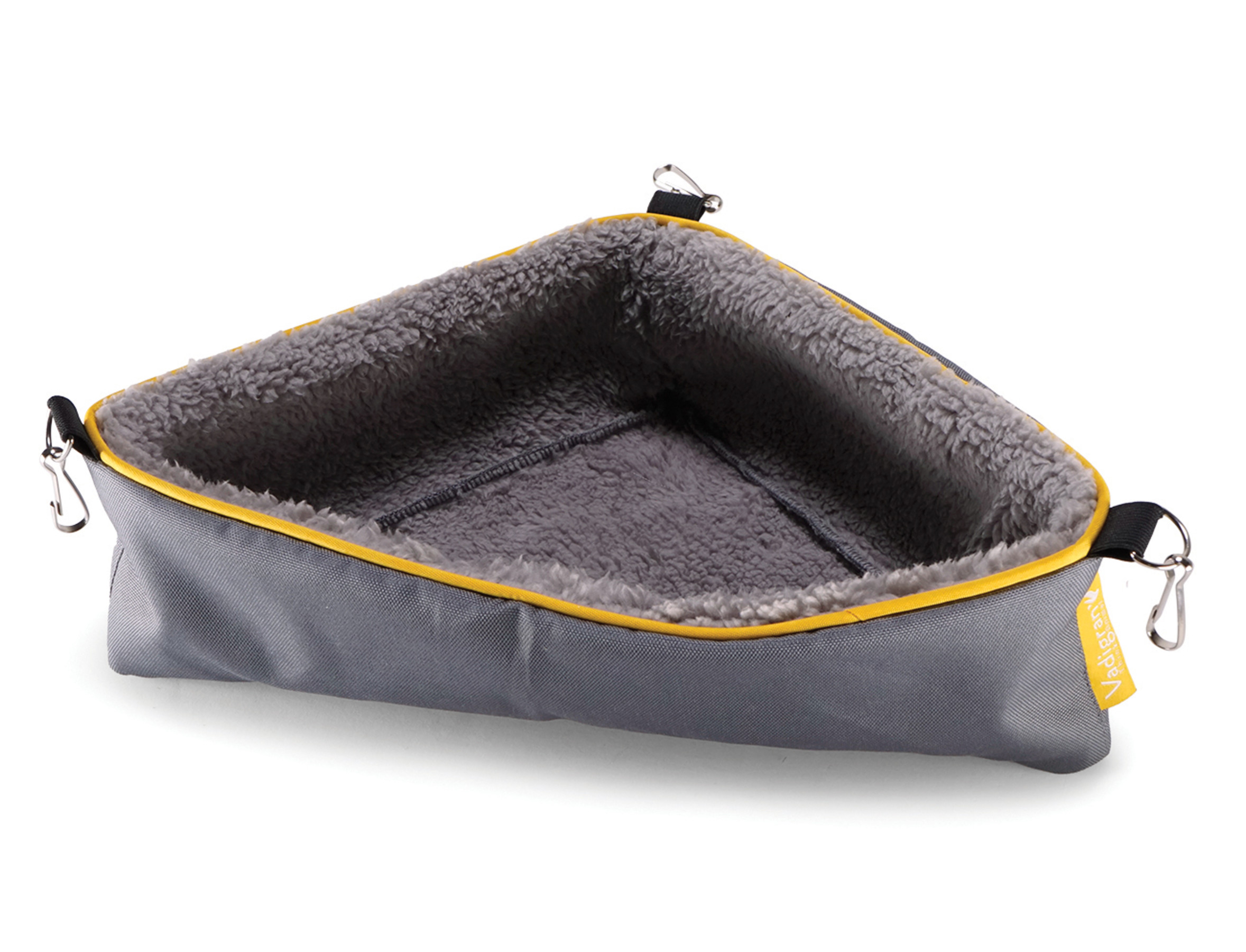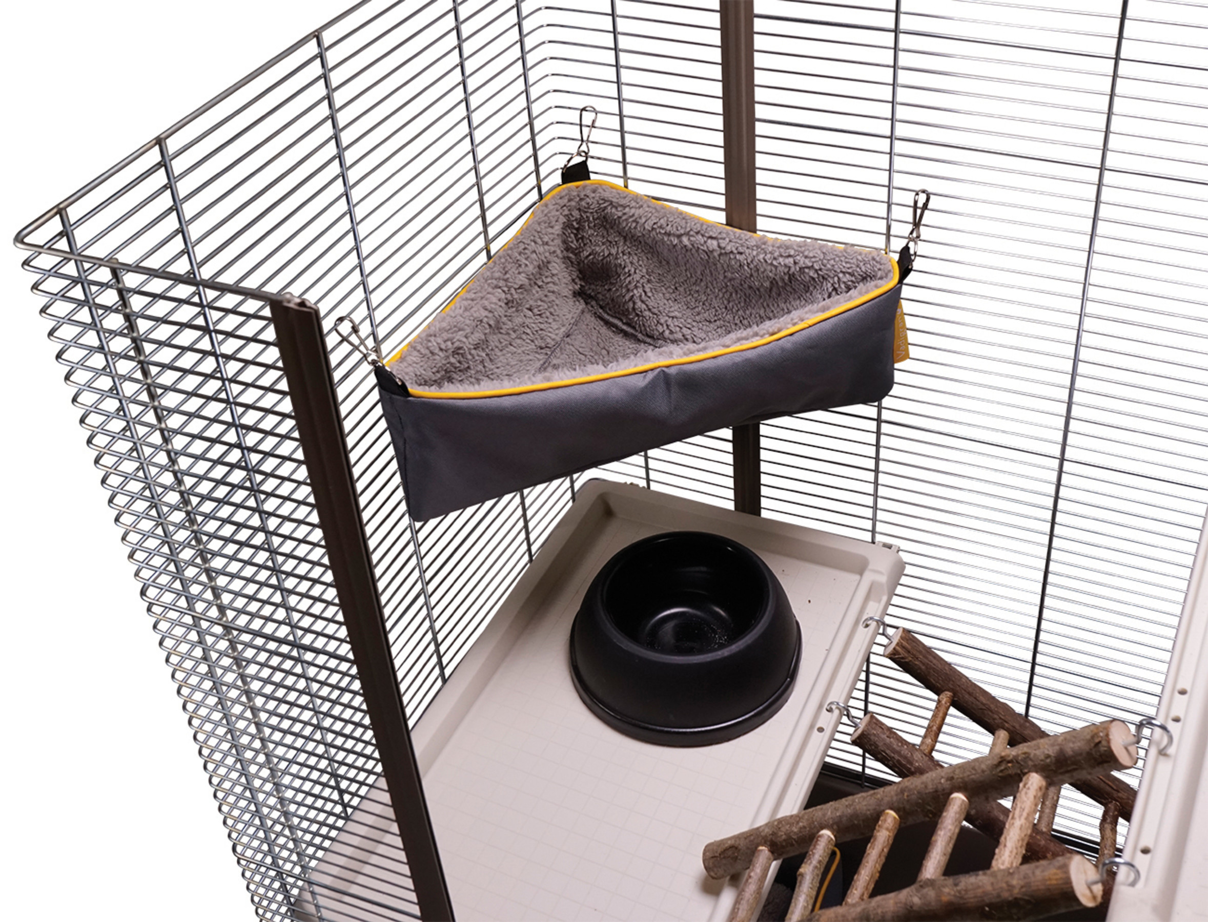 Kan met 3 metalen clips opgehangen worden aan de kooi