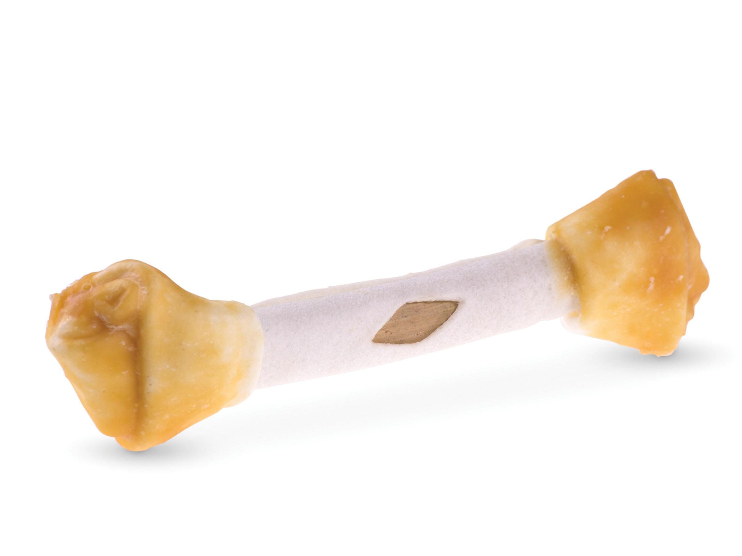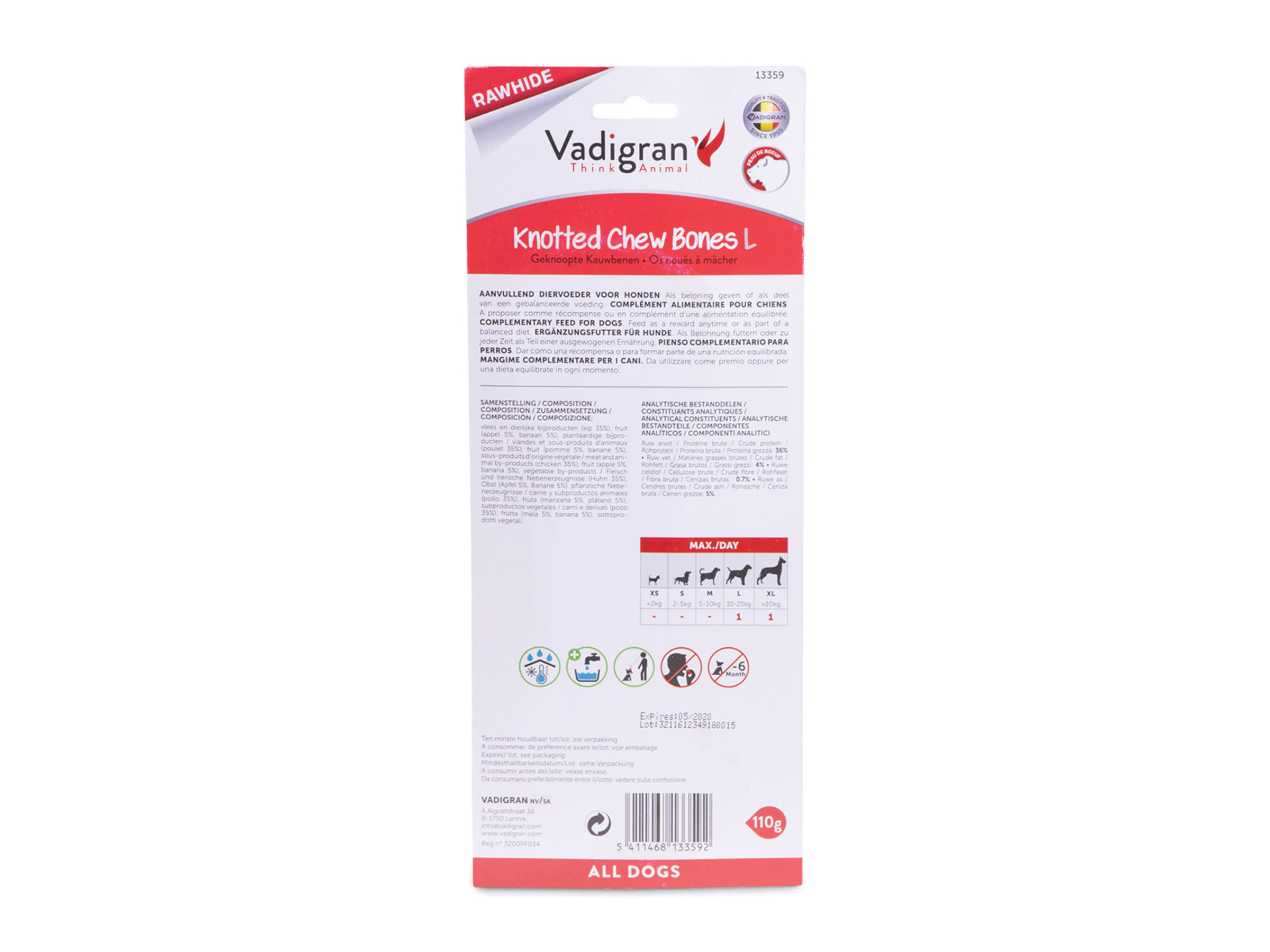 De Vadigran kauwbotten zijn de ideale snacks voor uw hond. Ze zijn samengesteld uit stevig geperste runderhuid, 35% kippenvlees en 10% fruit, dat het kauwbot een geur en smaak geeft die het natuurlijke kauwinstinct van uw hond zullen wakker maken.Deze snacks bevatten geen gluten, zijn caloriearm en heel goed verteerbaar.Deze smaakvolle snacks stimuleren je hond om te spelen en te kauwen. Het is belangrijk om de hond veel plezier te bezorgen, het houdt hem bezig en vermijdt dat hij zich zal gaan vervelen.