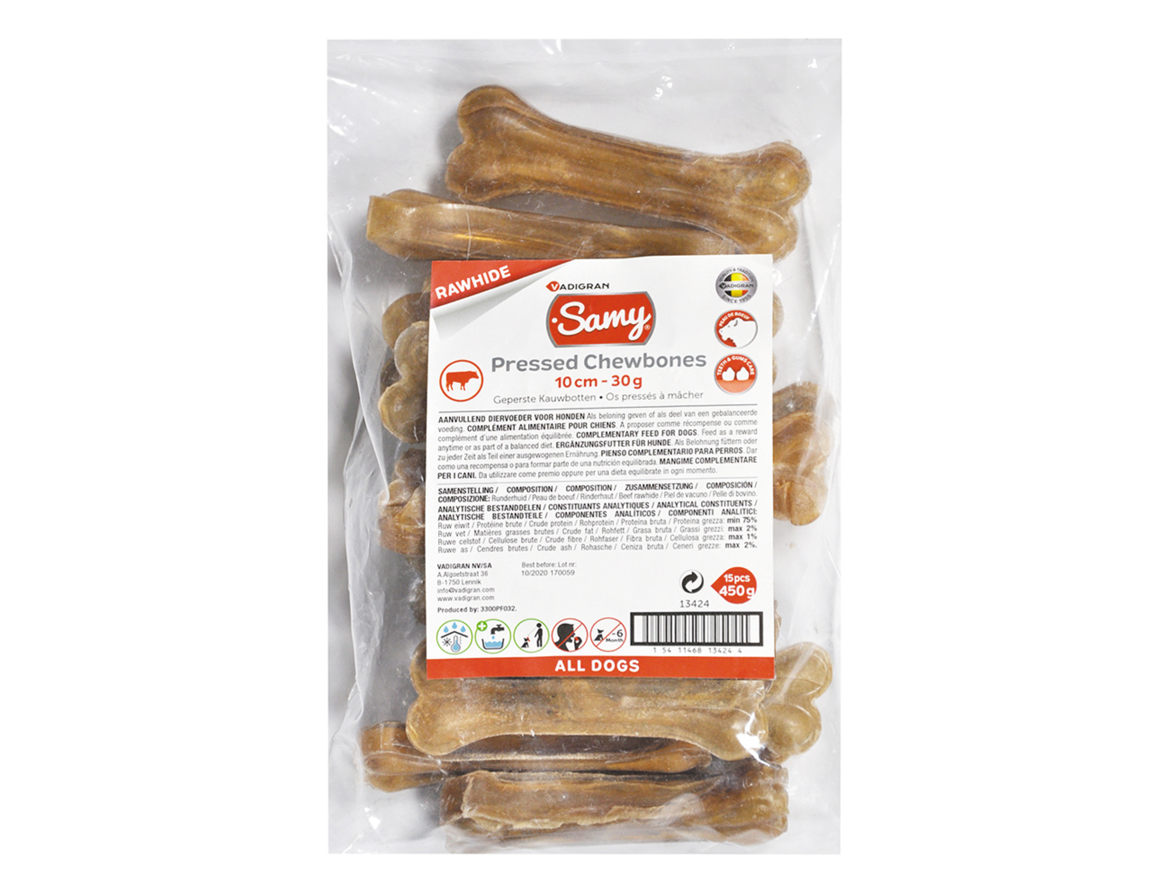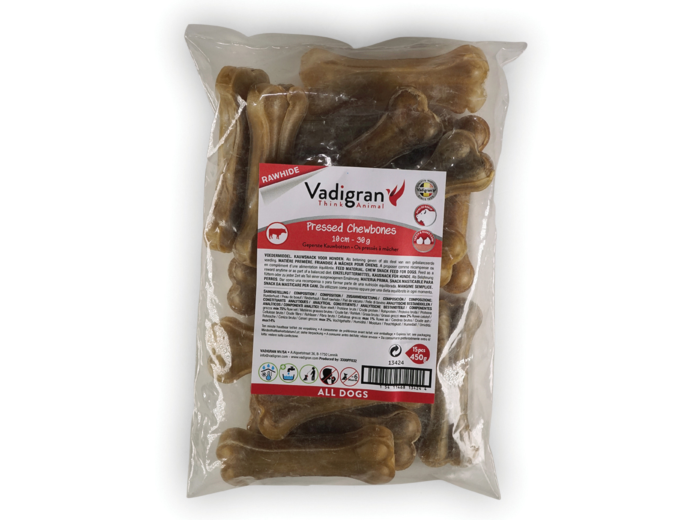 De geperste kauwbotten voor honden bestaan uit 100% runderhuid. Het is een vetarme snack voor honden, rijk aan eiwitten en heel natuurlijk – zonder toevoeging van bewaarmiddelen, aroma’s of kleurstoffen.Deze beloningen blijken zeer bevorderlijk te zijn voor de mondhygiëne en versterken de kaken van uw hond.Het is niet enkel een leuke beloning maar het moedigt je hond ook aan om te spelen en te kauwen. Hierdoor kan hij zich voor een lange tijd bezighouden en dit vermijdt dat de hond zich gaat vervelen.