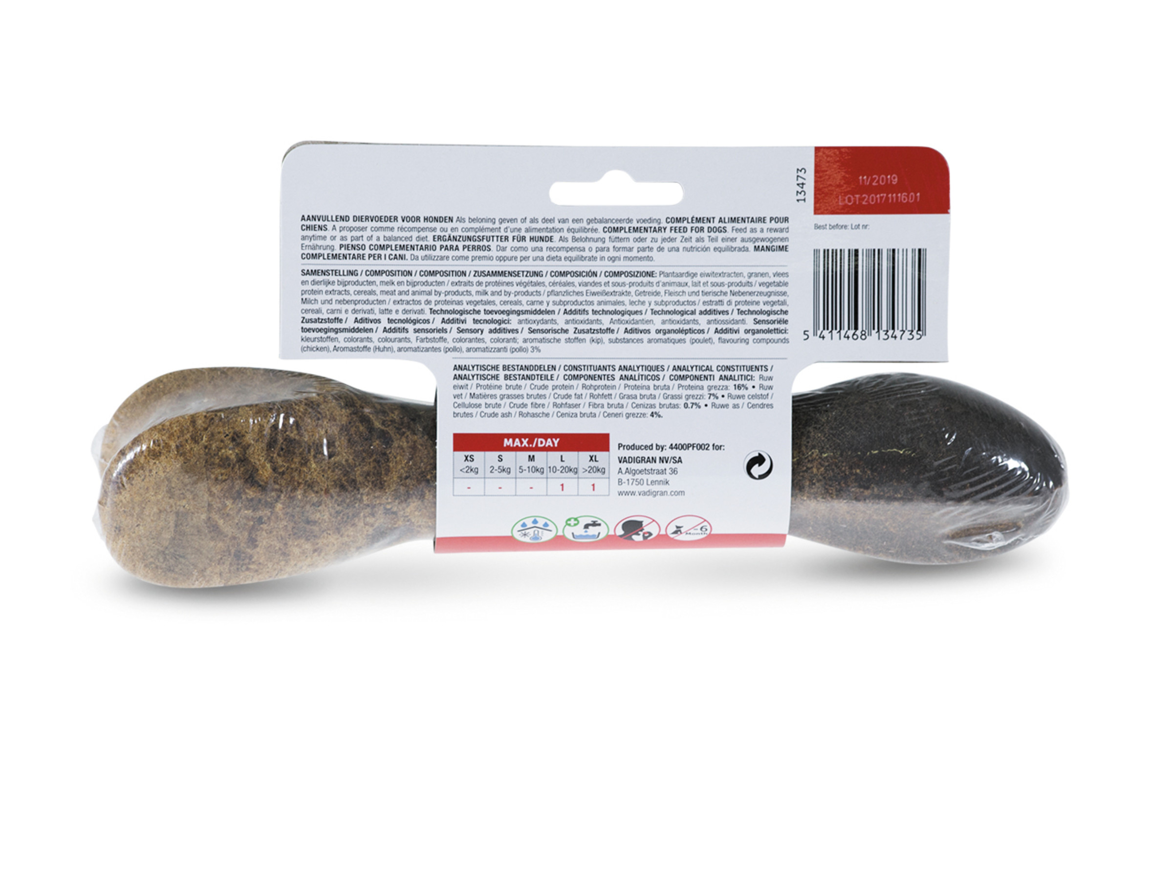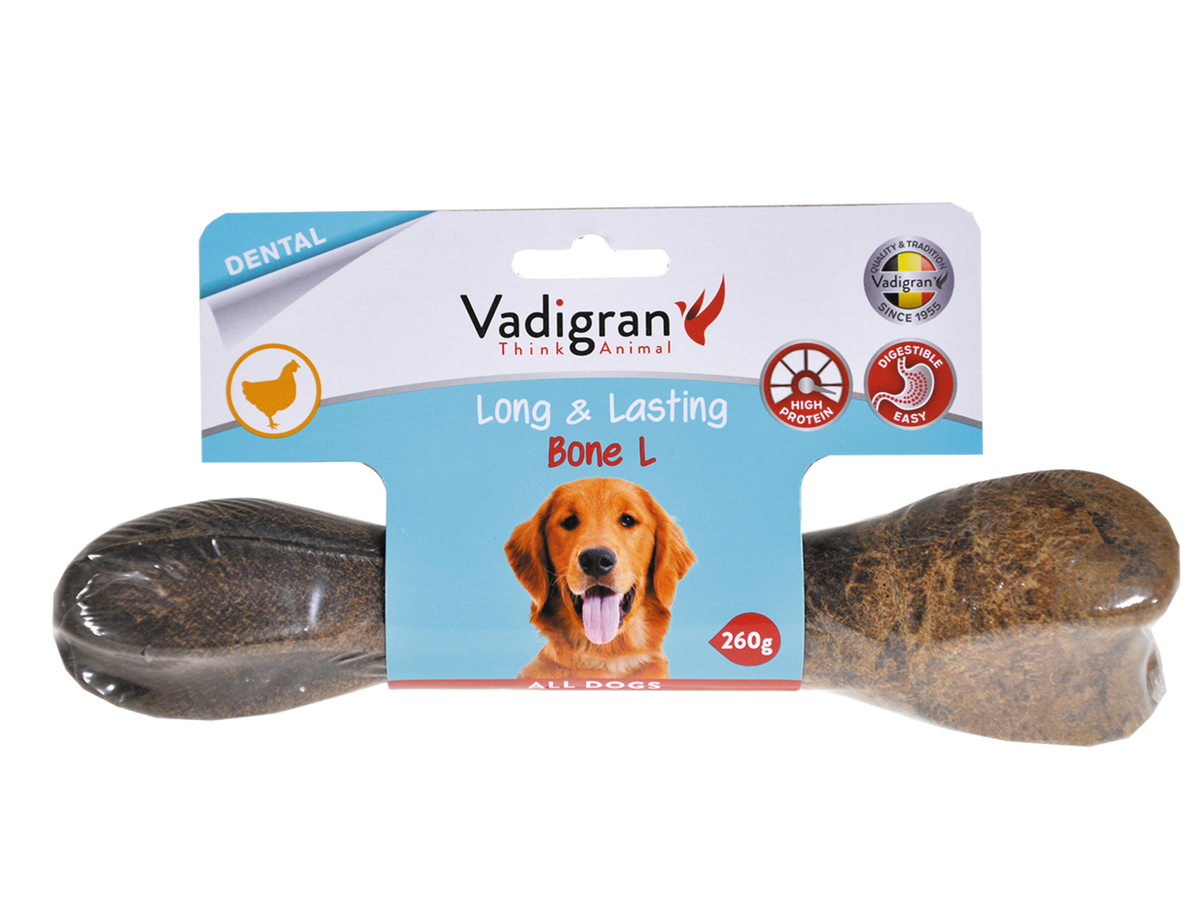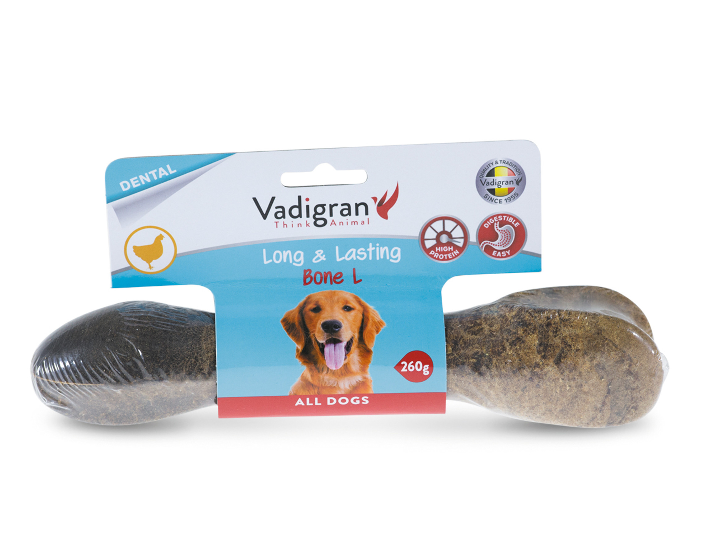 De geperste kauwbotten van Vadigran Long & Lasting zijn heerlijke en gezonde snacks met kippensmaak. Ze bevatten een hoger eiwittengehalte, waar de hond behoefte aan heeft.Het gepest bot is licht verteerbaar en is ook uitstekend voor de mondhygiëne. Het helpt om tandsteen te voorkomen, verstevigt de kaak en draagt bij tot de reiniging van de tanden en het tandvlees.Deze smaakvolle snacks stimuleren je hond om te spelen en te kauwen. Het is belangrijk om de hond veel plezier te bezorgen, het houdt hem bezig en vermijdt dat hij zich zal gaan vervelen.