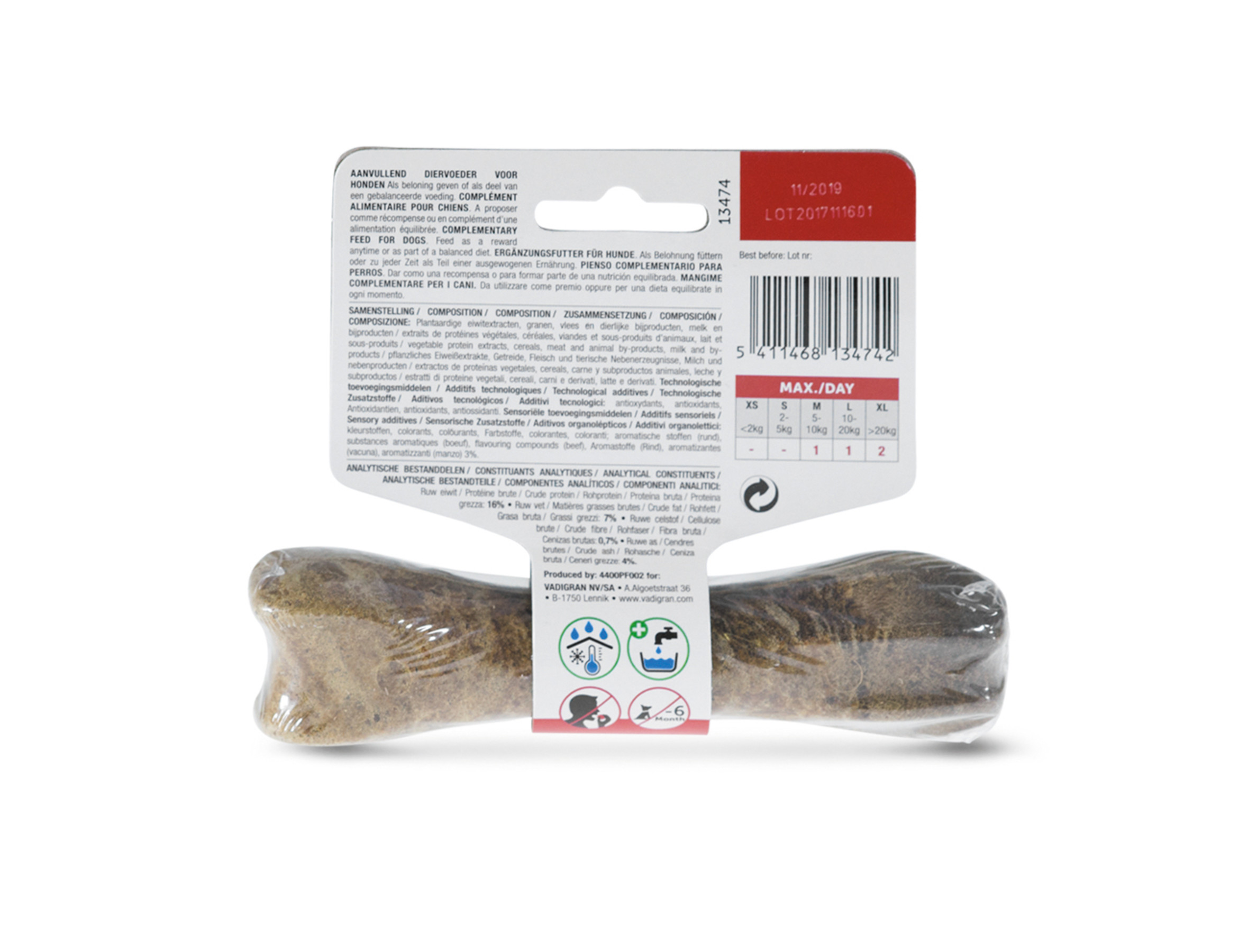 De geperste kauwbotten van Vadigran Long & Lasting zijn heerlijke en gezonde snacks met rundsmaak. Ze bevatten een hoger eiwittengehalte, waar de hond behoefte aan heeft.Het gepest bot is licht verteerbaar en is ook uitstekend voor de mondhygiëne. Het helpt om tandsteen te voorkomen, verstevigt de kaak en draagt bij tot de reiniging van de tanden en het tandvlees.Deze smaakvolle snacks stimuleren je hond om te spelen en te kauwen. Het is belangrijk om de hond veel plezier te bezorgen, het houdt hem bezig en vermijdt dat hij zich zal gaan vervelen.