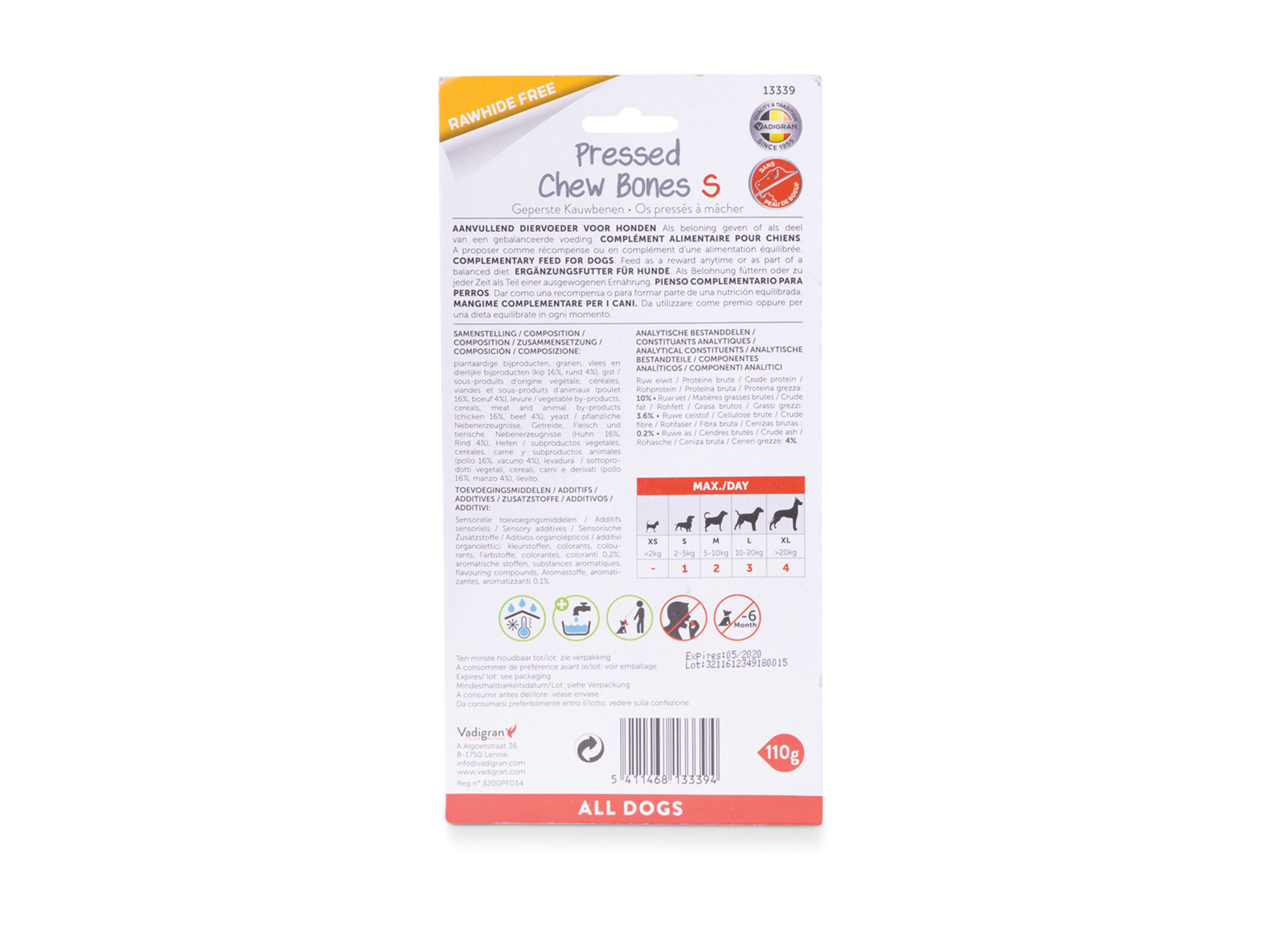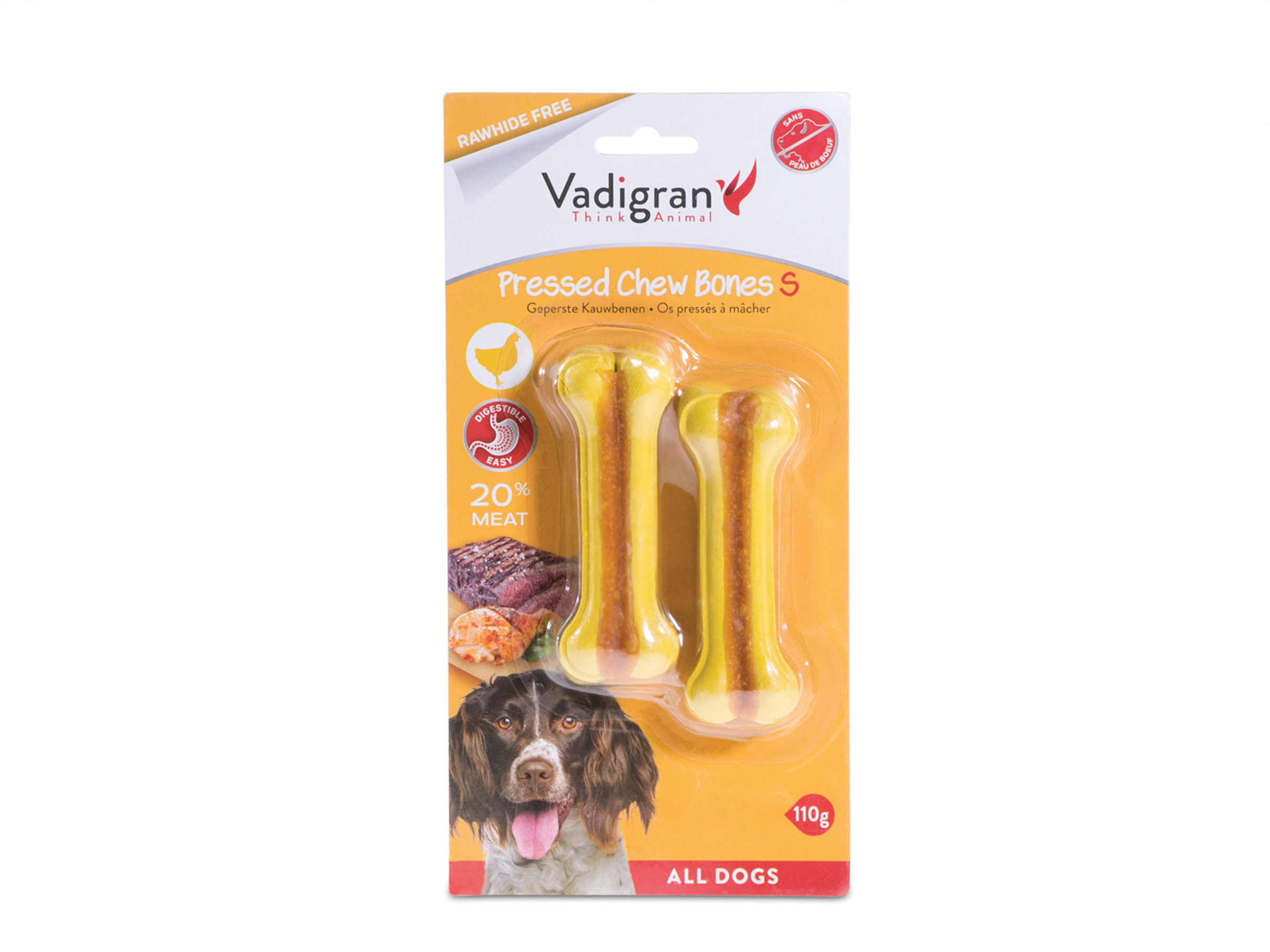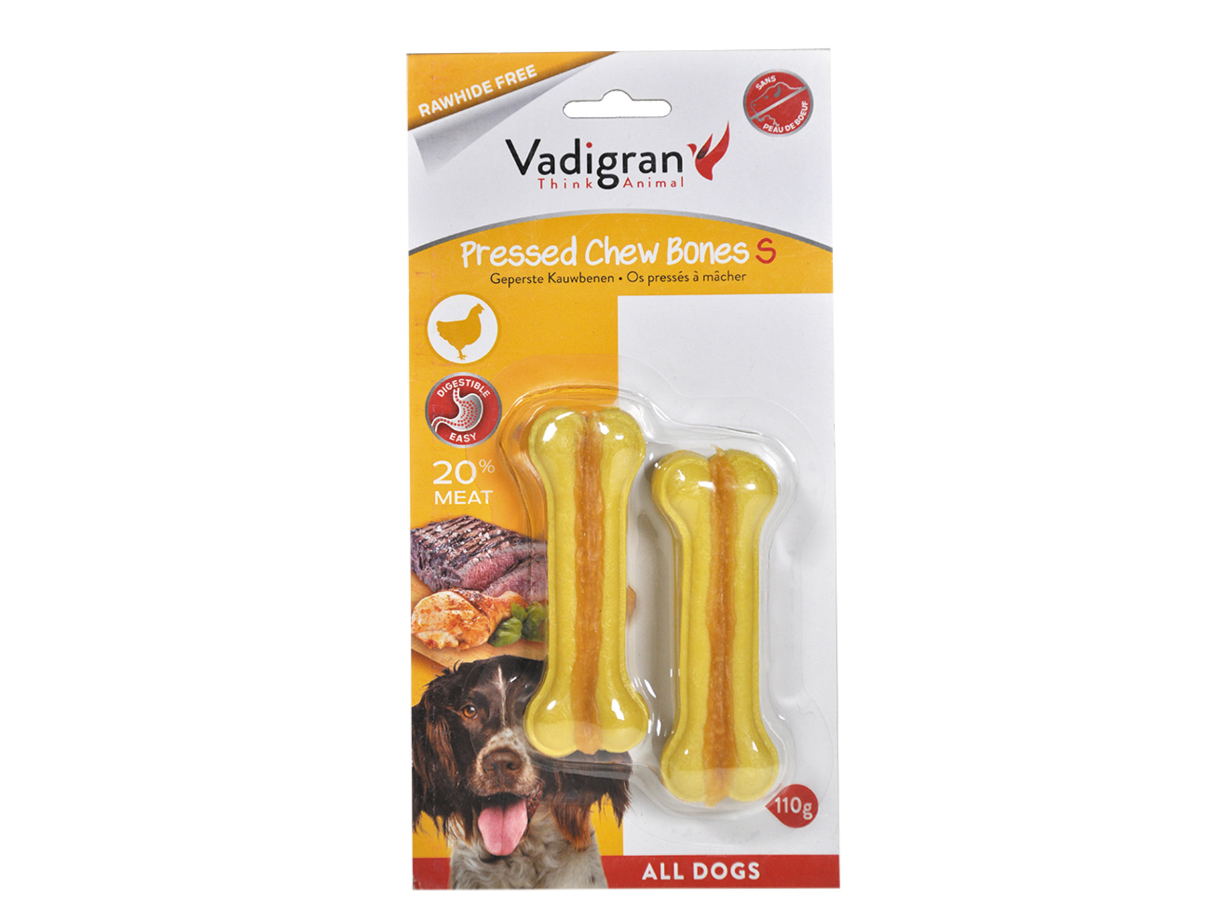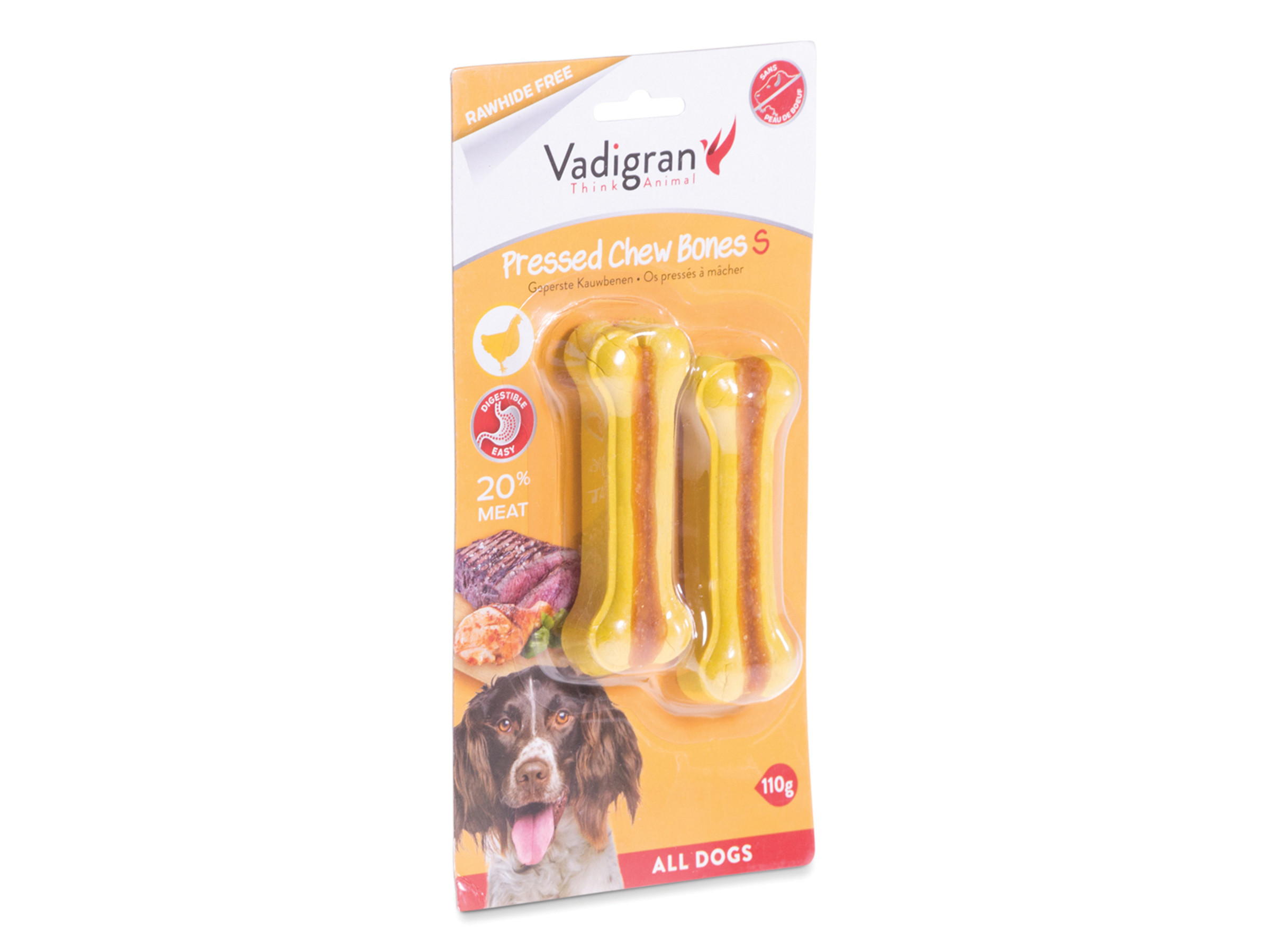 De Vadigran kauwbotten zijn de ideale snacks voor uw hond. Ze zijn samengesteld uit stevig geperste runderhuid en uit vlees dat het kauwbot een geur en smaak geeft die het natuurlijke kauwinstinct van uw hond zullen wakker maken. Ze bevatten geen kunstmatige kleurstoffen of smaken.Deze snack biedt je hond niet alleen plezier, maar is ook zeer bevorderlijk voor zijn mondgezondheid. Het kauwen zal namelijk de spieren van zijn kaken versterken, de snack zal uw hond helpen om zich te ontdoen van etensresten die zich tussen zijn tanden bevinden maar het zal ook op aangename wijze zijn tandvlees masseren.Omdat het arm aan vetstoffen is, kan je het met een gerust hart vaak aan je puppy of hond geven.