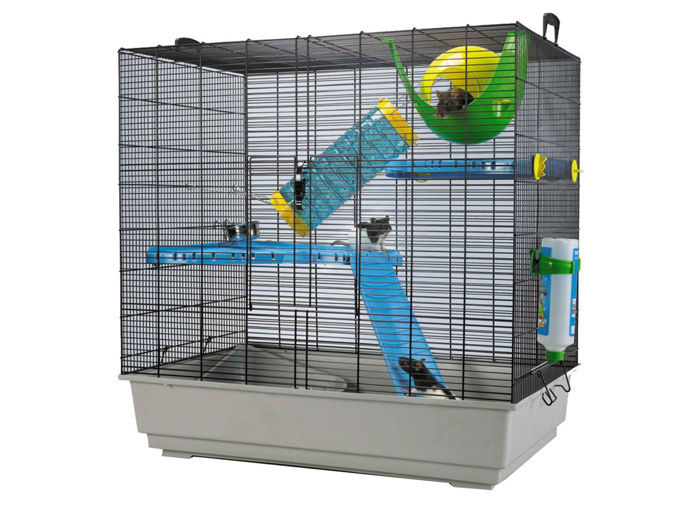 De Freddy 2 kooi is voorzien van een platform, ladder, hangmat, drinkfles, hoek toilet en voerbak.