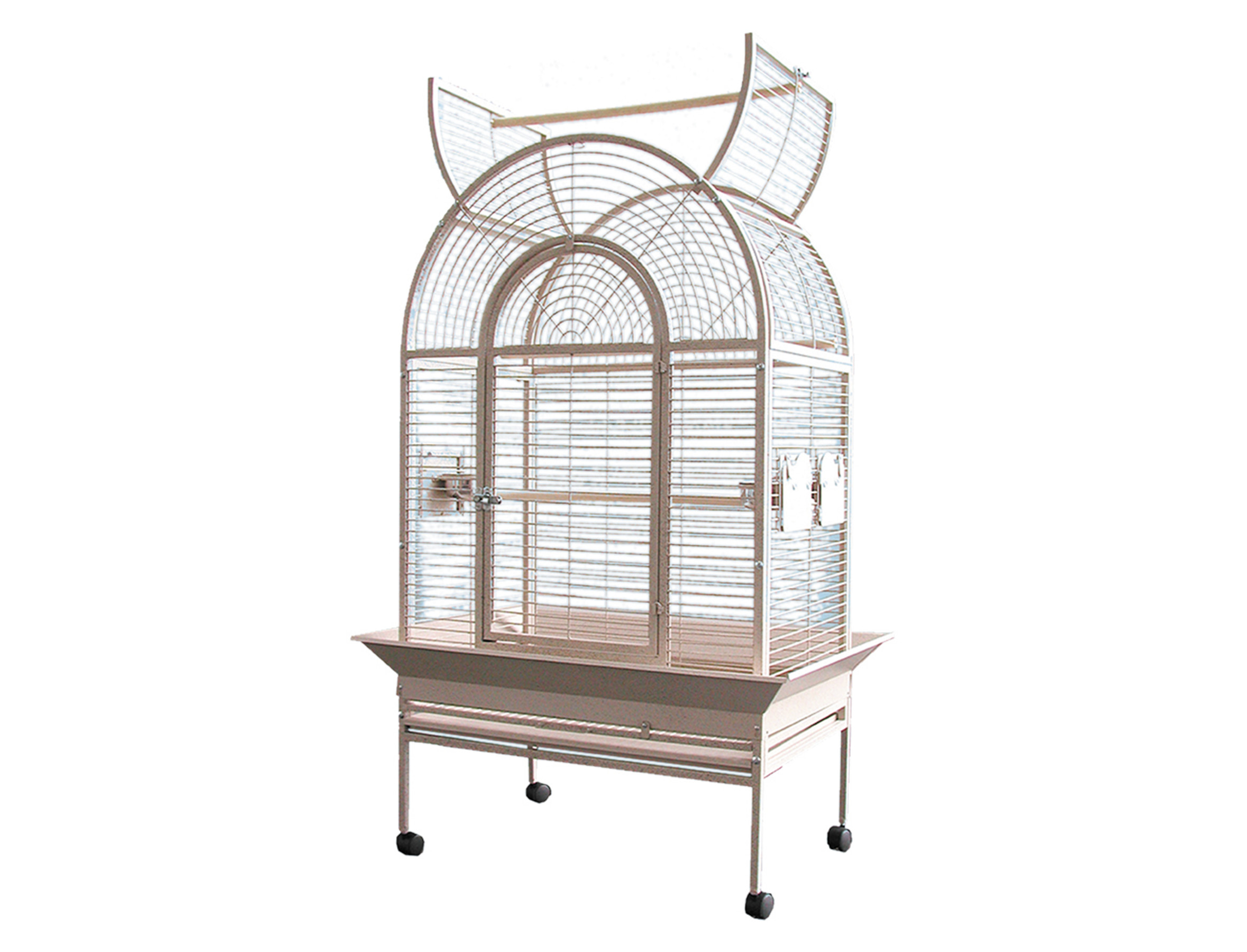 Kooi met opendak, zitstokken en 3 roestvrij staal kommen.Ruime en sterke kooi op wielen voor gemakkelijke verplaatsing.De randen beschermen de bodem van spatten en vuilnis.