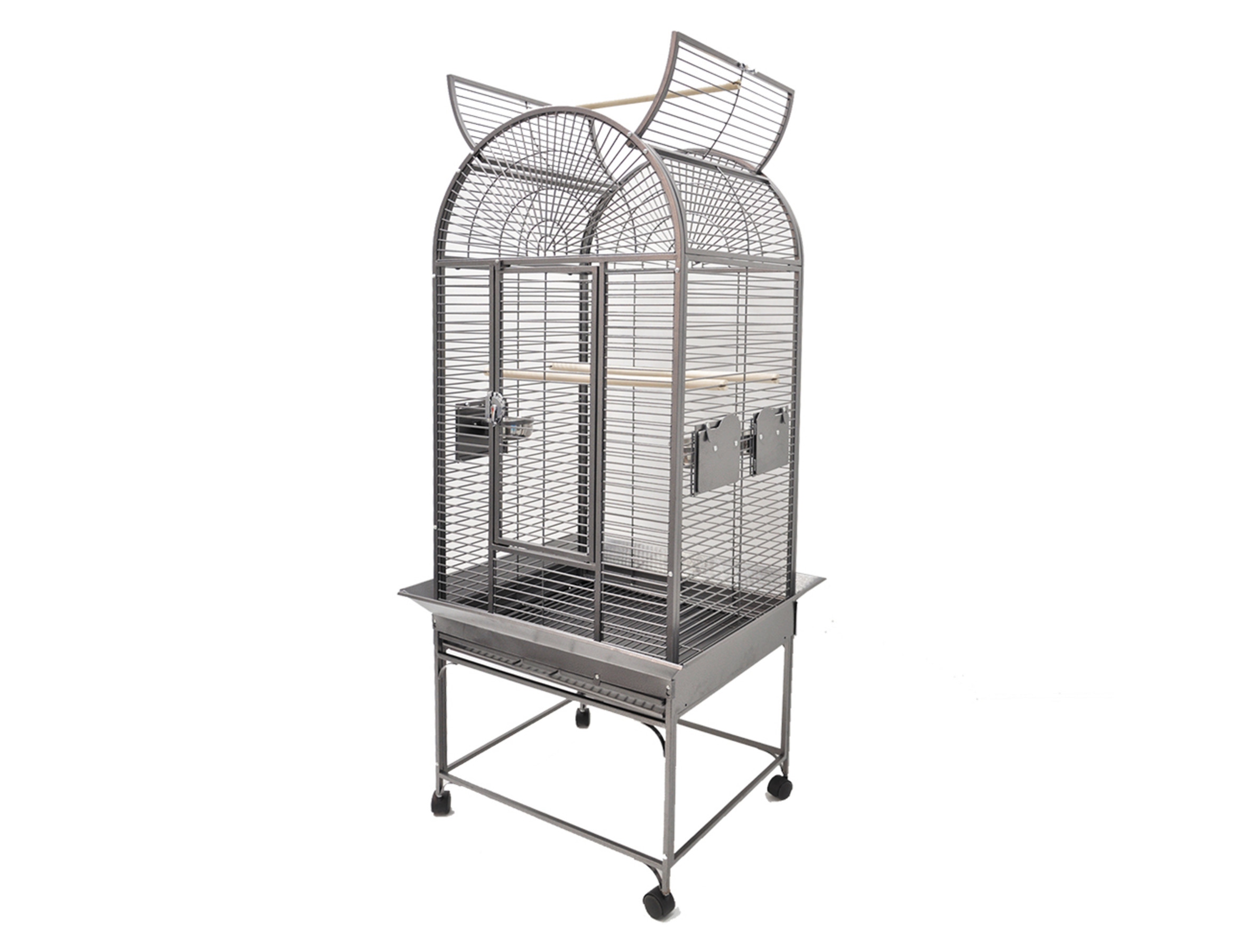 Kooi met opendak, zitstokken en 3 roestvrij staal kommen.Ruime en sterke kooi op wielen voor gemakkelijke beweging.De randen beschermen de bodem van spatten en vuilnis.