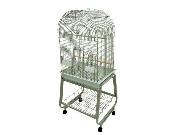 Kooi met opendak, zitstokken en 4 roestvrij staal kommen. Ruime en sterke kooi Op wielen voor gemakkelijke beweging gemonteerdDe randen beschermen de bodem van spatten en vuilnis.