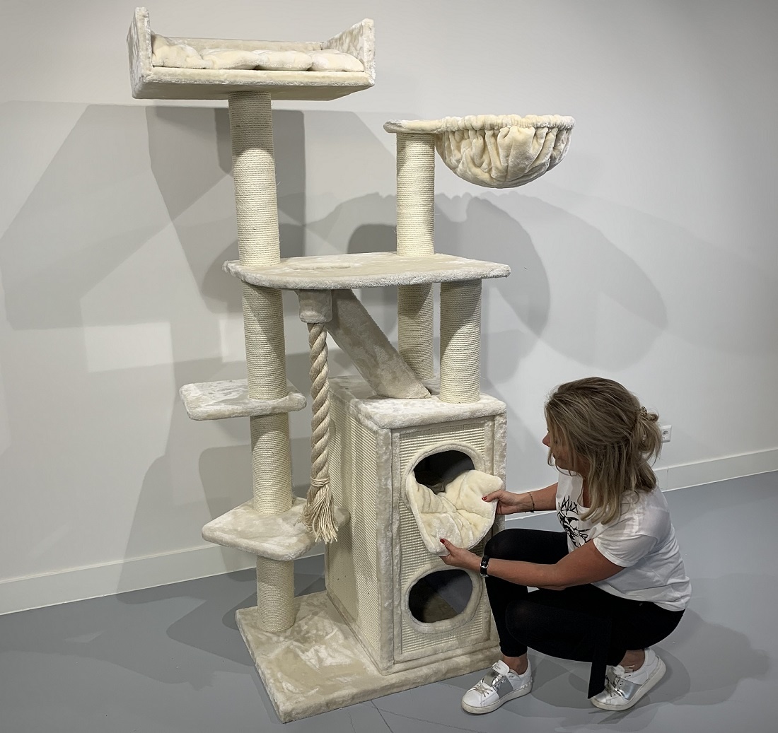 – Deze krabpaal is ruim 50 KG totaal en mega stevig.
