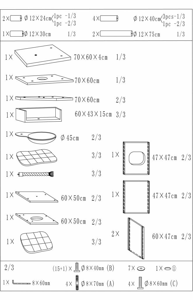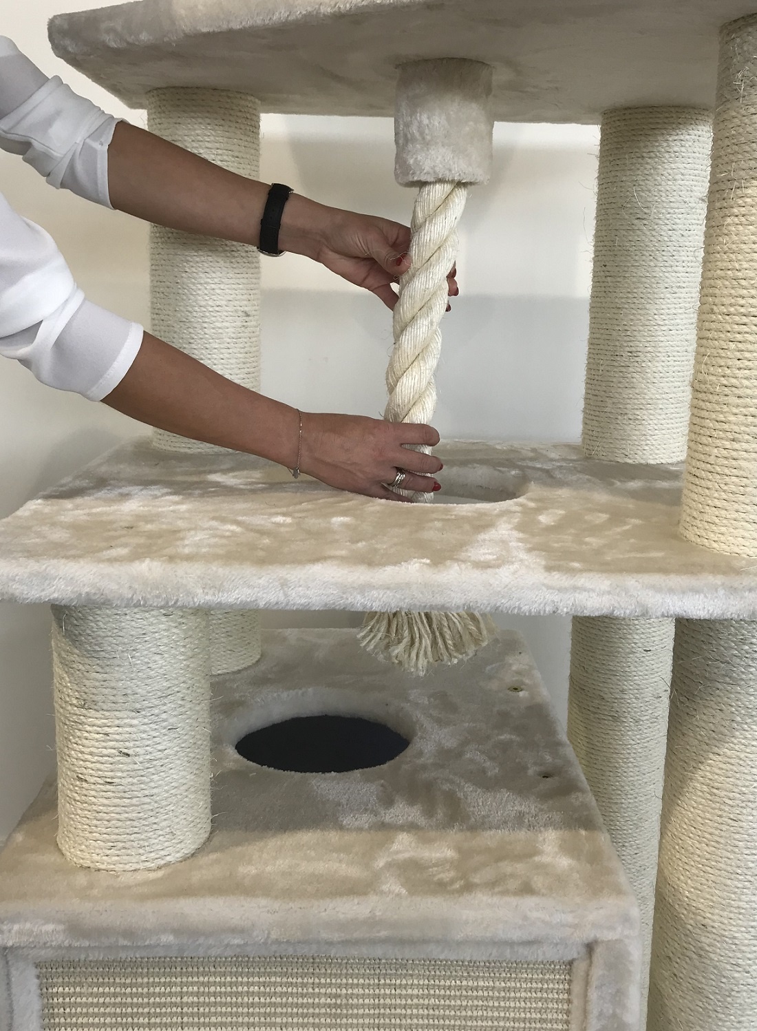– Sisalpalen zijn Ø 12 cm en het 6 mm dikke natuursisal is verlijmd aan de palen. (Mocht uw kat het sisaltouw doorkrabben “rolt” het touw niet naar beneden).