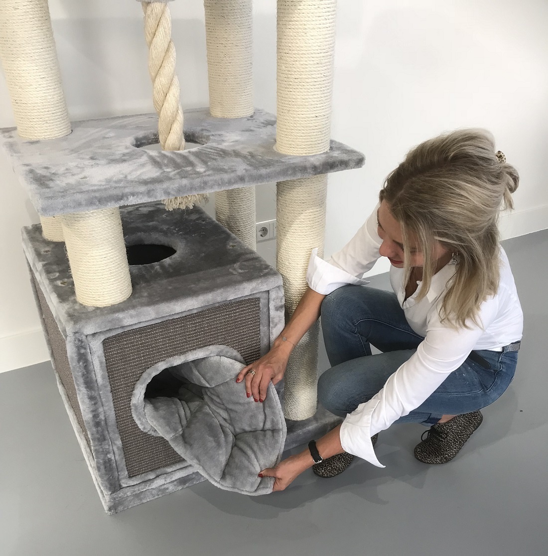 – Deze krabpaal is ruim 60kg totaal en mega stevig.