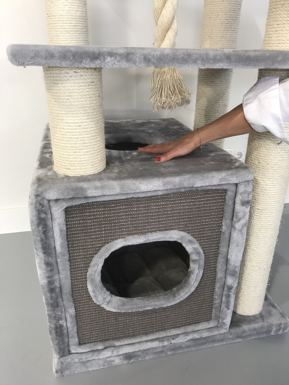 – Speelhuis: 50 x 60 x 50 cm . Buitenzijde bekleed met sisalkleed. Gaten voorzijde 25 x 18 cm ovaal.