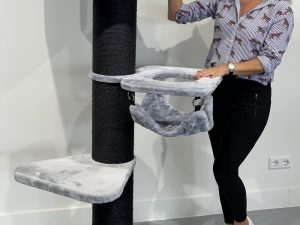 Krabpaal Corner Coon Blackline Light Grey is met ca 40KG een zeer stevige RHRQuality krabpaal met extra dikke 12cm diameter sisalpalen met alles wat een kat zich kan wensen. Zeer stabiel met heerlijke hoge enorme (60×49,5cm) directiezetel met uitneembaar en wasbaar kussen en 2 x hangmat de Luxe ( combinatie tussen kussen en hangmat) met ligplek van 45cm diameter. Hangmat heeft dikke metalen rand en kan eenvoudig tot 20 KG draaggewicht aan.