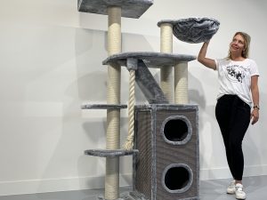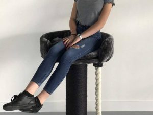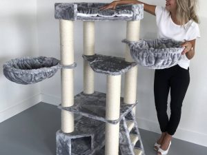 Met een grote dikke bodemplaat en onderin een gecurvde trap bekleed met sisalkleed om aan te krabben. Het verstophuis (53x38x31cm) heeft een grote ingang en via de bovenkant kan uw kat via een half ronde pijp naar de volgende verdieping komen. Ook eventueel eenvoudig via de opstap aan de linkerzijde. Ook hangt er een leuk 5cm dik speeltouw aan de krabpaal. Op de 2e verdieping is tevens een grote ligplek. Geheel bovenin zijn nog eens 2 hoge directiezetels. Waarvan een grote directiezetel van 60×43 cm met 5 cm dik kussen en 1 hangmat de Luxe ( Draaibaar) met wel 45 cm diameter ligplek.
