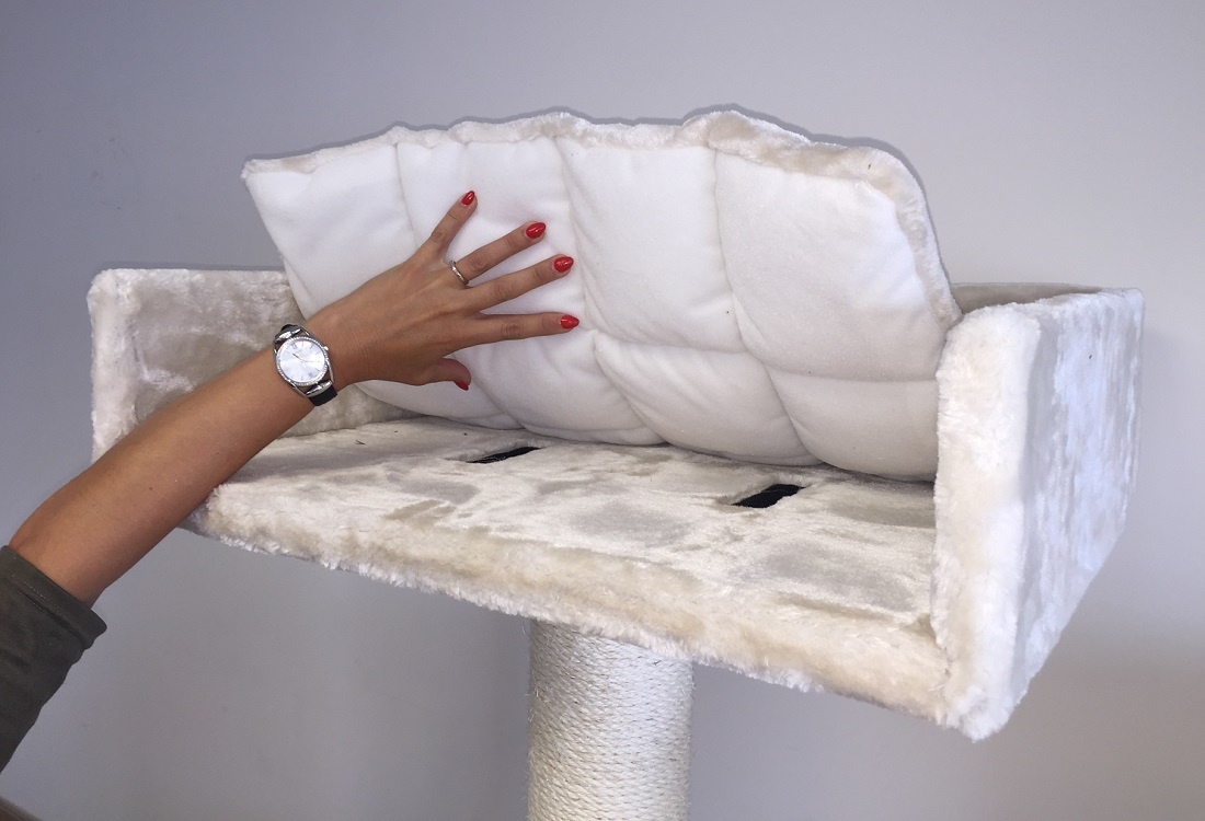 Met een grote dikke bodemplaat en onderin een gecurvde trap bekleed met sisalkleed om aan te krabben. Het verstophuis (53x38x31cm) heeft een grote ingang en via de bovenkant kan uw kat via een half ronde pijp naar de volgende verdieping komen. Ook eventueel eenvoudig via de opstap aan de linkerzijde. Ook hangt er een leuk 5cm dik speeltouw aan de krabpaal. Op de 2e verdieping is tevens een grote ligplek. Geheel bovenin zijn nog eens 2 grote ligplekken. Waarvan een grote directiezetel van 60×43 cm met 5 cm dik kussen en een hangmat de Luxe ( draaibaar) met wel 45 cm diameter ligplek.