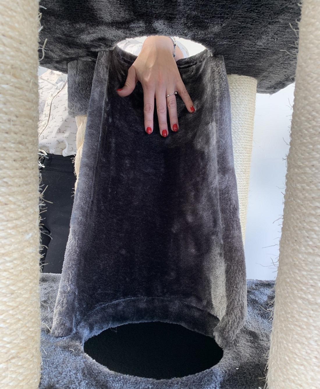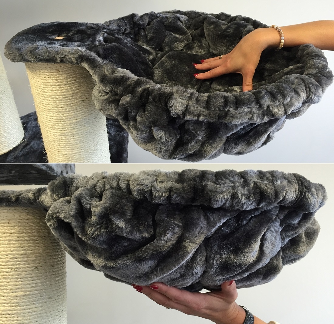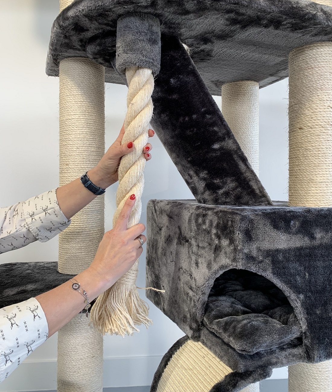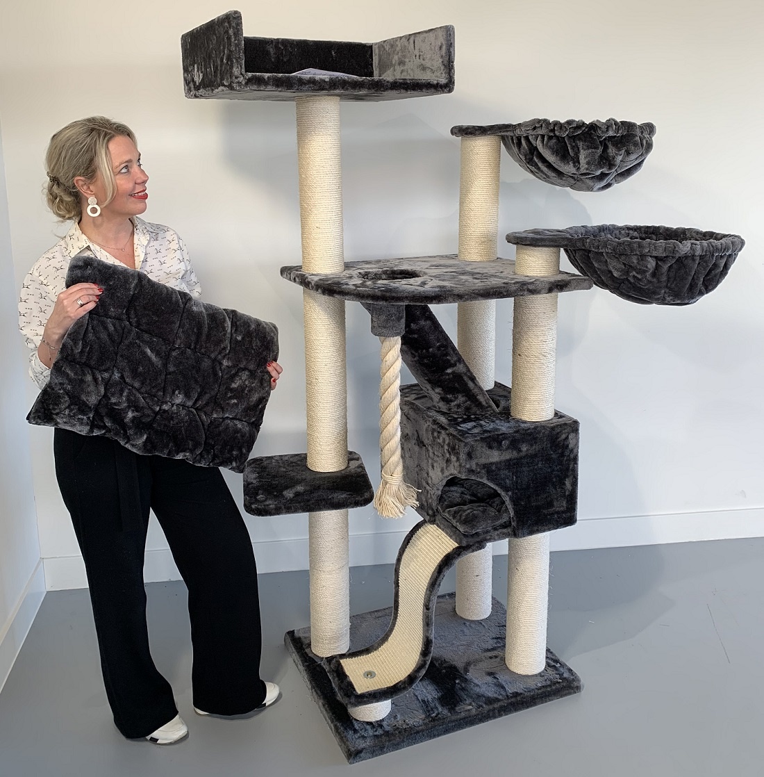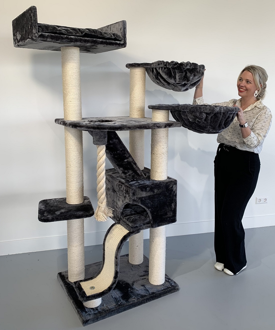 Met een grote dikke bodemplaat en onderin een gecurvde trap bekleed met sisalkleed om aan te krabben. Het verstophuis (53x38x31cm) heeft een grote ingang en via de bovenkant kan uw kat via een half ronde pijp naar de volgende verdieping komen. Ook eventueel eenvoudig via de opstap aan de linkerzijde. Ook hangt er een leuk 5cm dik speeltouw aan de krabpaal. Op de 2e verdieping is tevens een grote ligplek. Geheel bovenin zijn nog eens 3 grote ligplekken. Waarvan een grote directiezetel van 60×43 cm met 5 cm dik kussen en 2 x hangmat de Luxe ( Draaibaar) met wel 45 cm diameter ligplek.