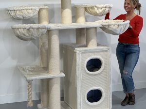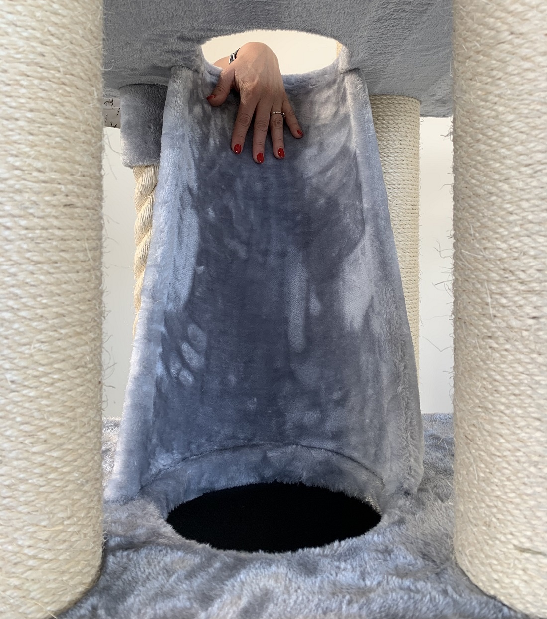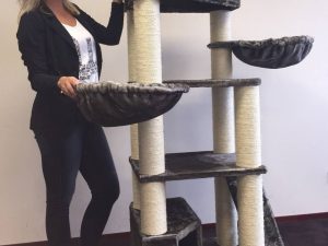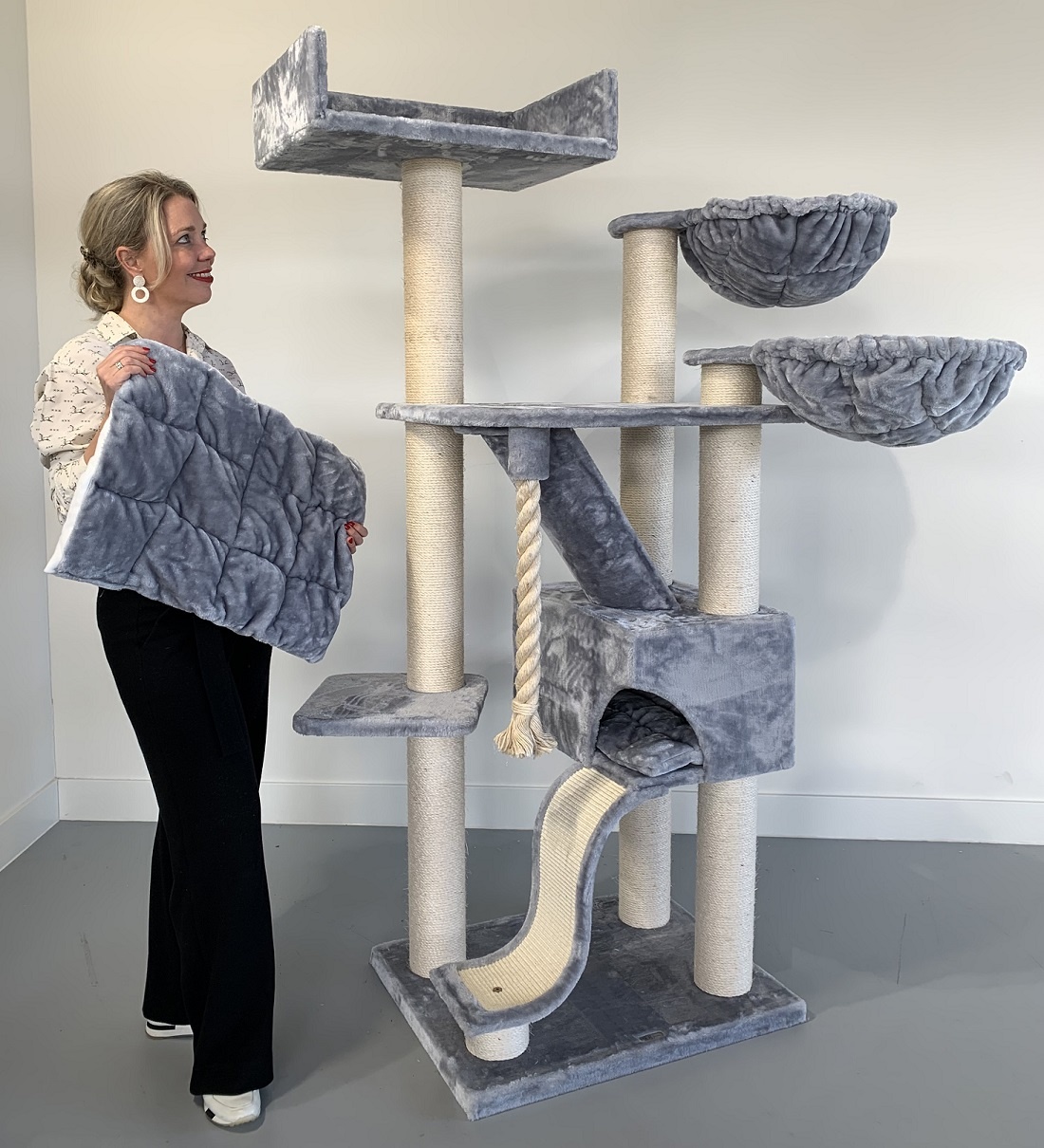 Met een grote dikke bodemplaat en onderin een gecurvde trap bekleed met sisalkleed om aan te krabben. Het verstophuis (53x38x31cm) heeft een grote ingang en via de bovenkant kan uw kat via een half ronde pijp naar de volgende verdieping komen. Ook eventueel eenvoudig via de opstap aan de linkerzijde. Ook hangt er een leuk 5cm dik speeltouw aan de krabpaal. Op de 2e verdieping is tevens een grote ligplek. Geheel bovenin zijn nog eens 3 grote ligplekken. Waarvan een grote directiezetel van 60×43 cm met 5 cm dik kussen en 2 x hangmat de Luxe ( Draaibaar) met wel 45 cm diameter ligplek.