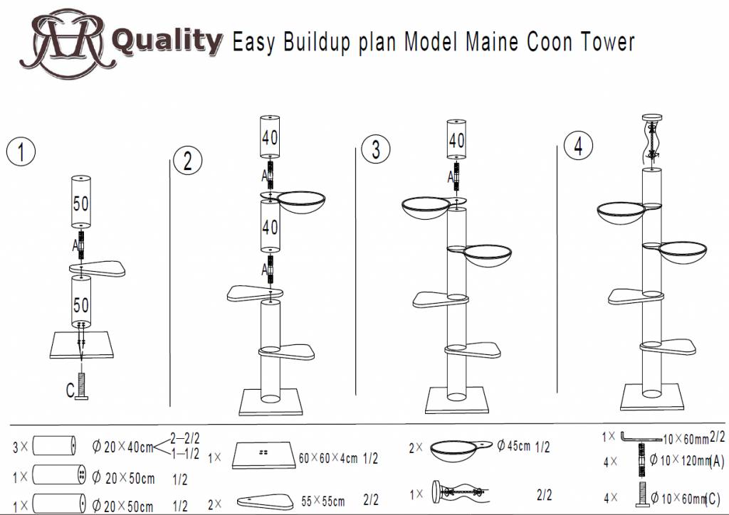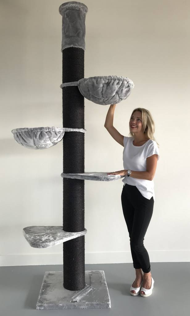 De krabpaal Maine Coon Tower Blackline Light Grey van topmerk RHRQuality is een plafondhoge krabpaal (Van 240 tot 265cm verstelbaar tegen uw plafond en hoger op aanvraag) met 20cm dikke sisalpalen en grote hangmatten van 45cm ligplek, die eenvoudig 20KG kunnen dragen. Ideaal voor zware katten als Maine Coon en Ragdoll. Met een bodemplaat die verzwaard is en 60 x 60 cm en 4,5 cm dik is zeer stabiel. U kunt deze krabpaal Maine Coon Tower op meerdere manieren opbouwen en u bepaald dus zelf waar de grote steps en de hangmatten komen. De steps en de hangmatten zijn beide ook draaibaar.