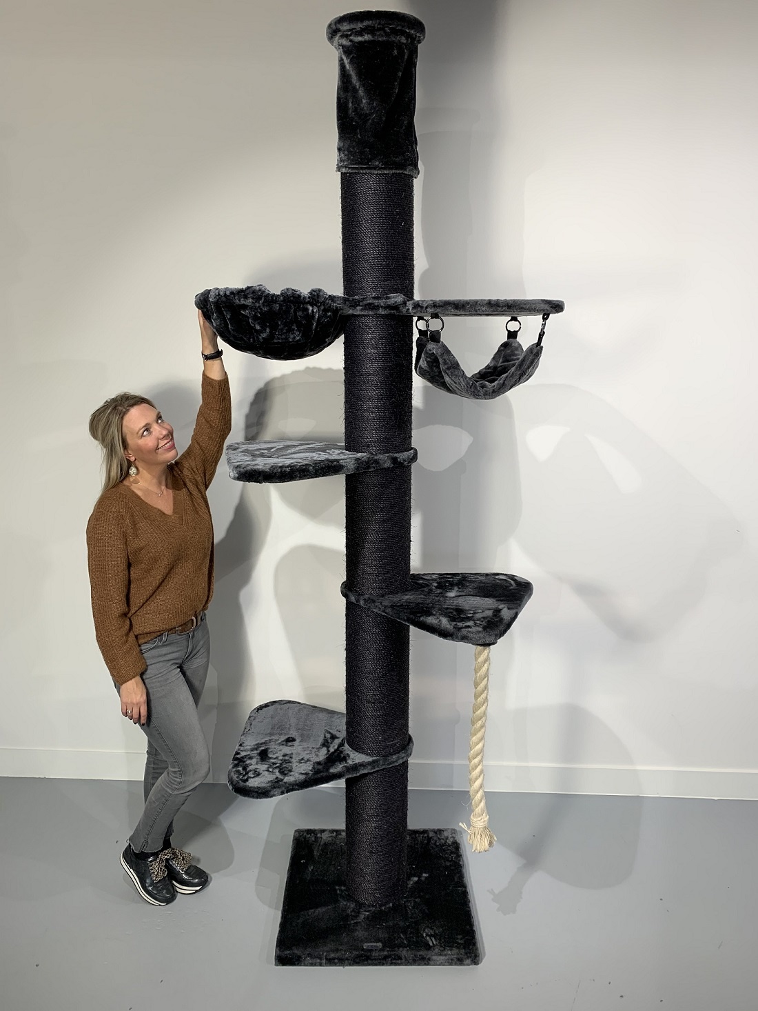 Deze uitdagende plafond krabpaal heeft een variatie aan draaibare hangmatten (45cmØ) en grote (55x55cm) ligplateaus met een stevig extra dik (5cm) speeltouw. U kunt zelf de indeling van de krabpaal bij opbouw bepalen. De krabpaal heeft maar liefst 20cmØ dikke sisalpalen en de onderste sisalpaal zit gemonteerd met 4 schroeven in de bodemplaat voor maximale stabiliteit, waardoor deze zeer stevig en stabiel is dus ook geschikt voor meerdere katten tegelijkertijd.