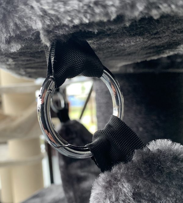 De nieuwe ligplek Crown met hangmat is met 4 metalen ringen bevestigd aan een plateau (60x50cm) met een grote doorgang van 25cmØ. Dit draaibare plateau heeft een afneembare en wasbare hangmat (handwas) en is getest tot een draagkracht van wel 15kg. Ook dit is een gewatteerde hangmat dus super zacht.