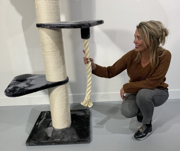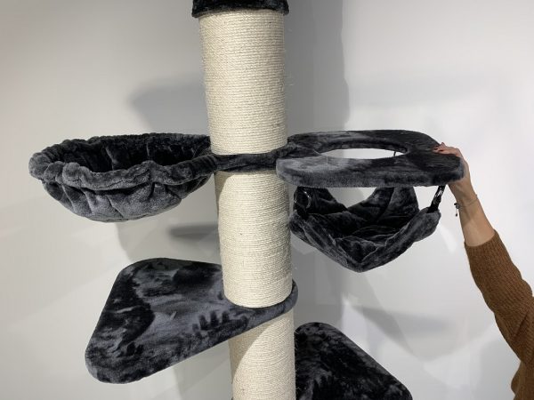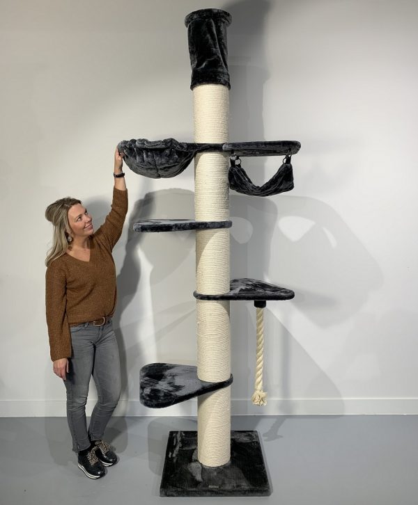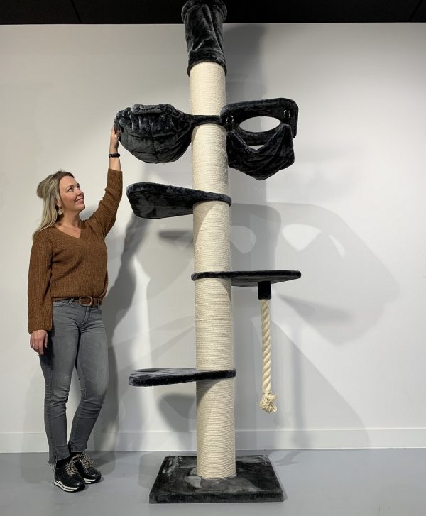 Deze uitdagende plafond krabpaal heeft een variatie aan draaibare hangmatten (45cmØ) en grote (55x55cm) ligplateaus met een stevig extra dik (5cm) speeltouw. U kunt zelf de indeling van de krabpaal bij opbouw bepalen. De krabpaal heeft maar liefst 20cmØ dikke sisalpalen en de onderste sisalpaal zit gemonteerd met 4 schroeven in de bodemplaat voor maximale stabiliteit, waardoor deze zeer stevig en stabiel is dus ook geschikt voor meerdere katten tegelijkertijd.