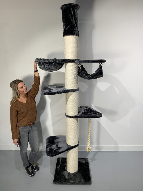 Een plafondhoge krabpaal verstelbaar van 245 tot 265cm (hoger of lager op aanvraag mogelijk). De draaibare hangmat is een unieke combinatie van een hangmat en een kussen. De droom van ieder kat. Deze hangmat is bevestigd met een stevig metalen frame en is getest tot een draagkracht van wel 20kg! De doorgestikte en gewatteerde hangmat is bekleed met extra dikke superzachte pluche.