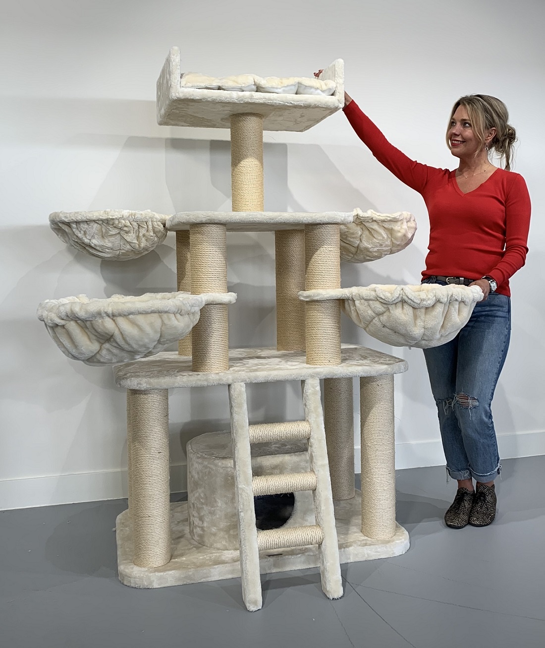 Krabpaal Panther Cream is een mega stevige krabpaal. De Panther Cream heeft 12cm dikke en grote 45cmØ hangmatten en een mega grote directiezetel van 60x43x15cm met uitneembaar kussen.