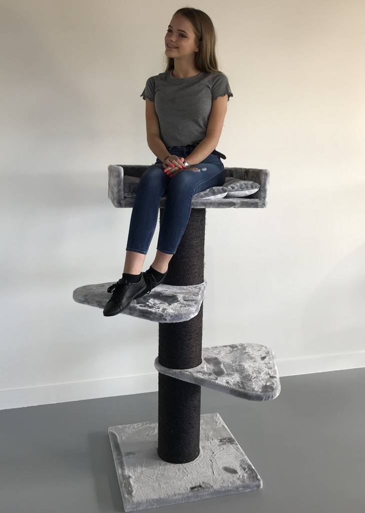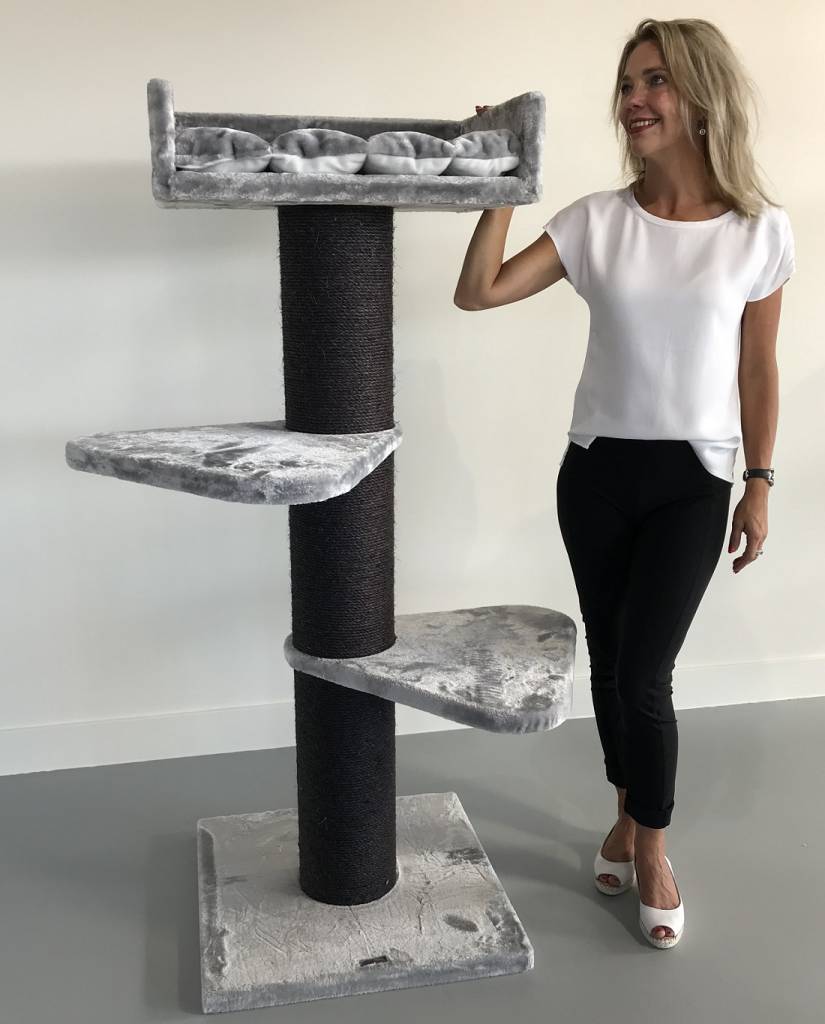 Krabpaal Royalty Blackline Light Grey is zeer stevig met zijn 20cm diameter dikke sisalpalen en verzwaarde bodemplaat van 60×60 en 4,5cm dik. Krabpaal Royalty is een krabpaal voor zware katten als Ragdoll of Maine coon of voor de klant die echt een stevige krabpaal wenst. De krabpaal Royalty heeft 2 grote (55×55) draaibare plateau’s en daarboven een enorme directiezetel van 62×42 cm met een 15cm hoge opstaande rand. Hierop ligt een 5 cm dik en heerlijk zacht kussen, welke uitneembaar is. Door zijn hoogte van 155 cm een ideale krabpaal voor in uw woonkamer en een ideale uitkijk en relaxplek voor uw kat.