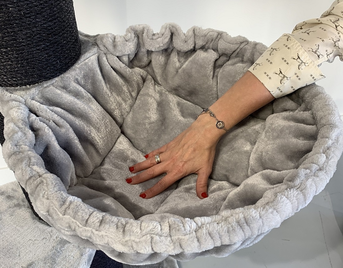 Hangmat: draaibaar en 45cmØ diameter. Getest tot een draagkracht van 20kg. Model 2019. Doorgestikt en gewatteerd.