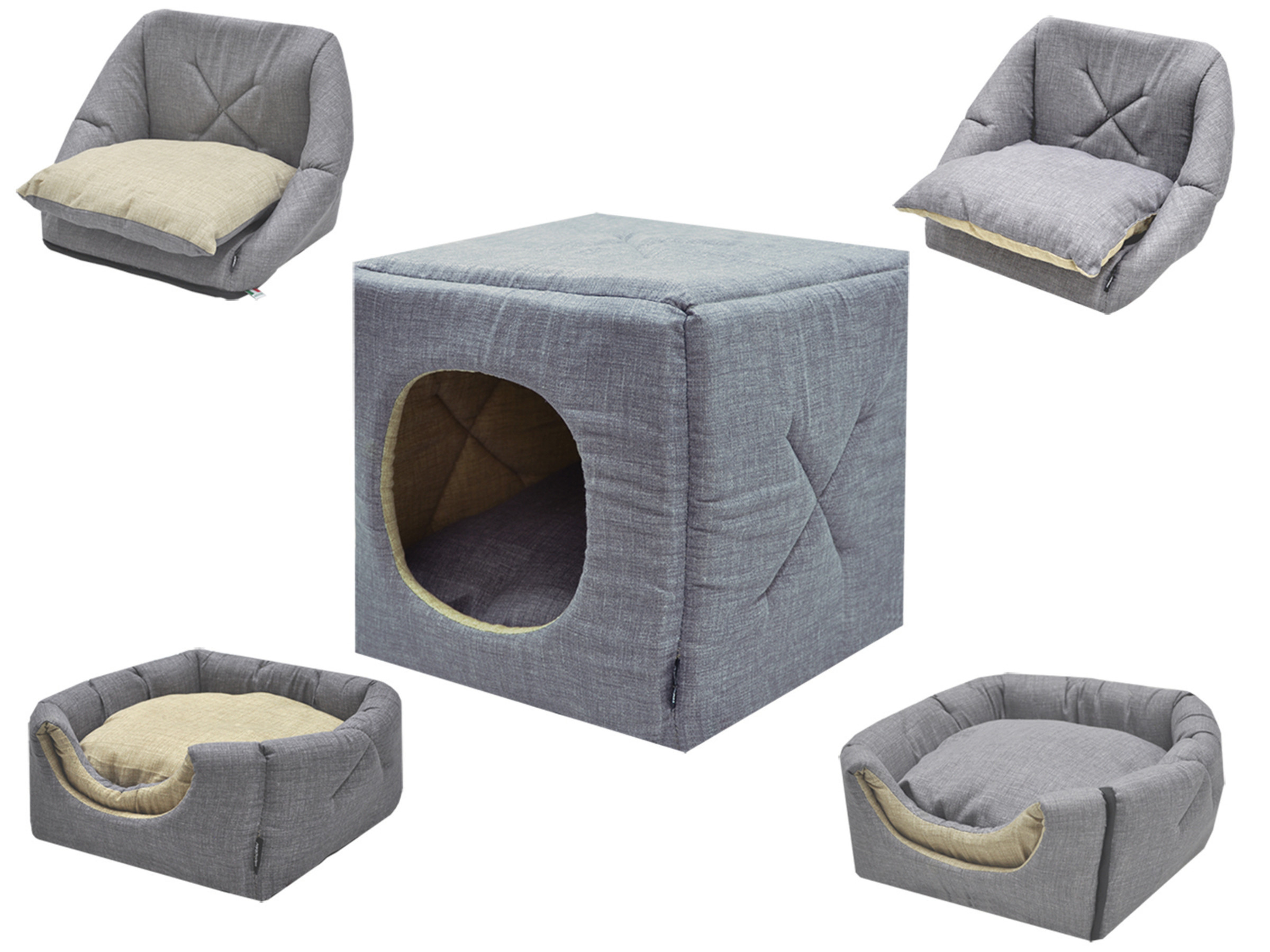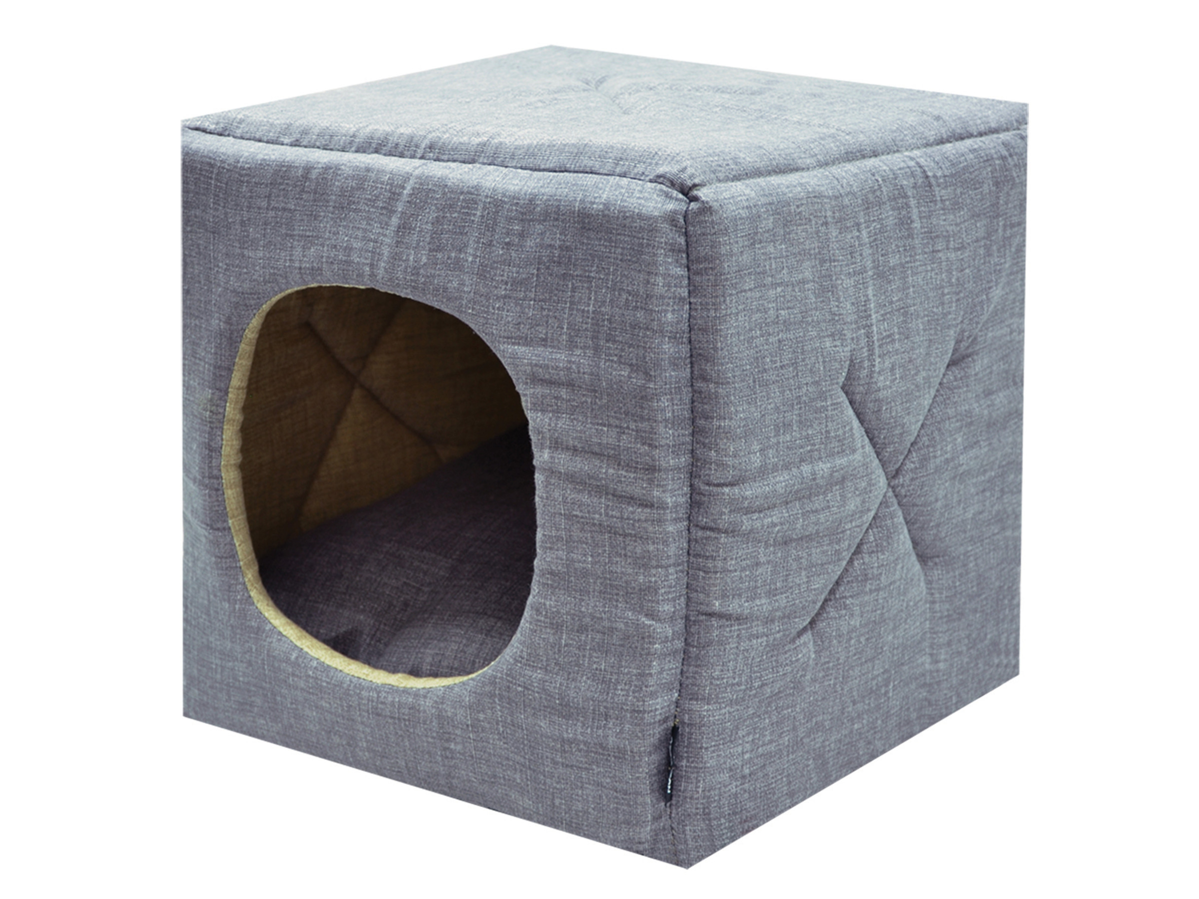 Kubus met uitneembaar kussen voor hond of kat.Fonction 3 en 1: peut servir de cachette, fauteuil ou panier.Polyester stof/sterke katoen 110g/m².