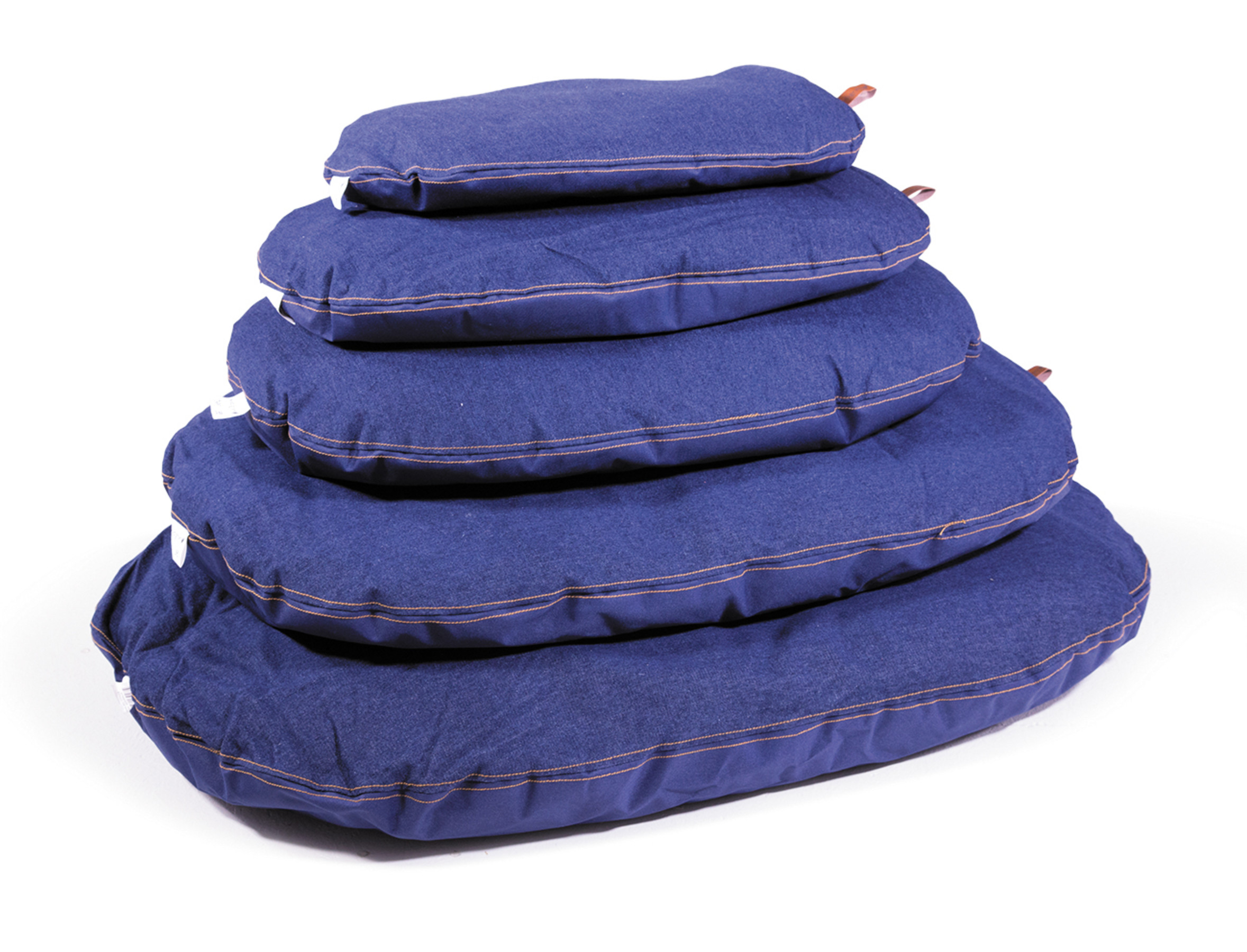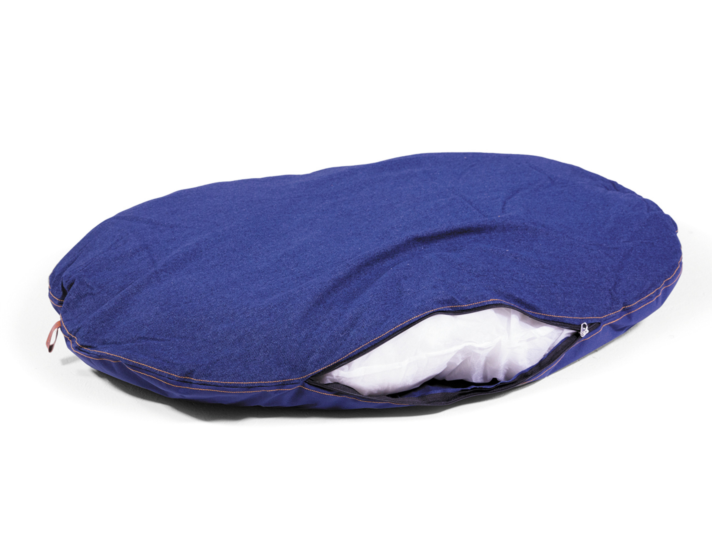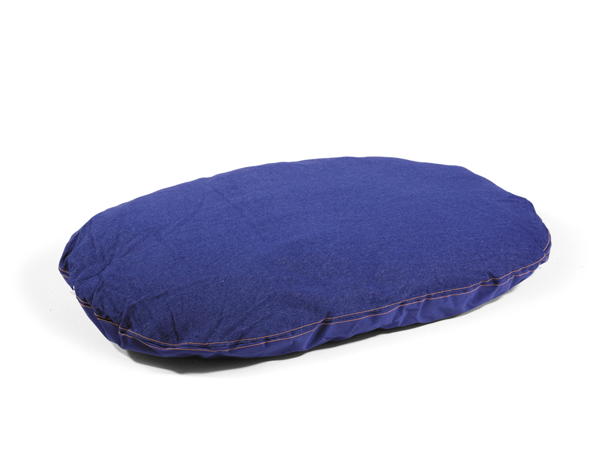 Het ovale hondenkussen Bluedenim is in bi-materiaal vervaardigd: de ene kant in jeans, de andere in oxford. De bruine overdruk contrasteert mooi met de blauwe kleur van de jeans en het oxford materiaal.Dankzij de kwaliteit van de afwerkingen kan het kussen langs beide zijden worden gebruikt.