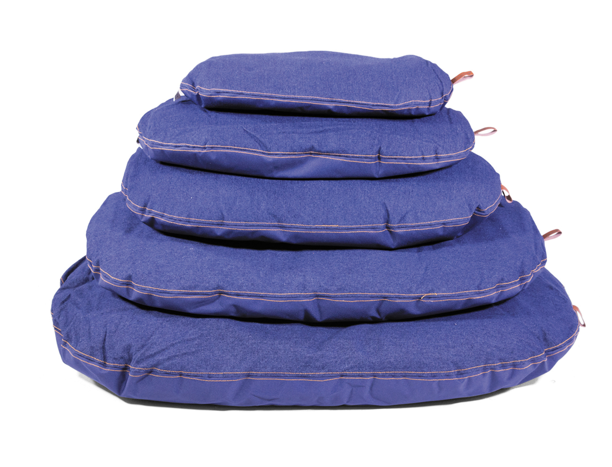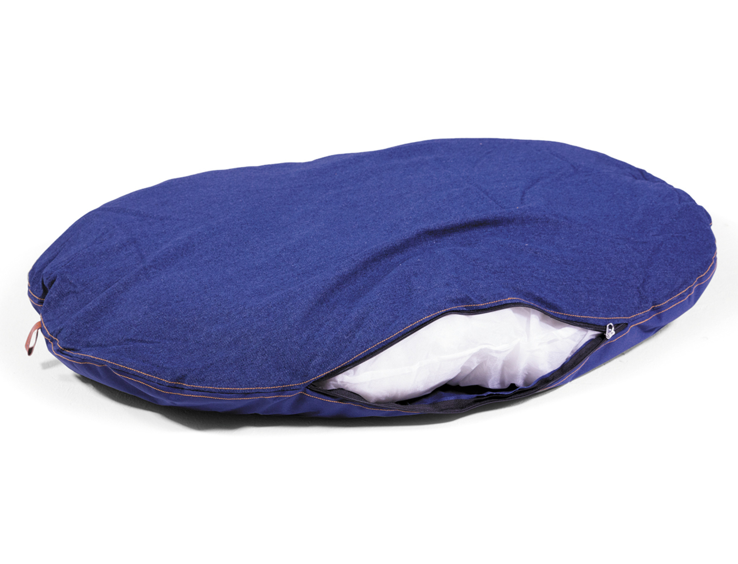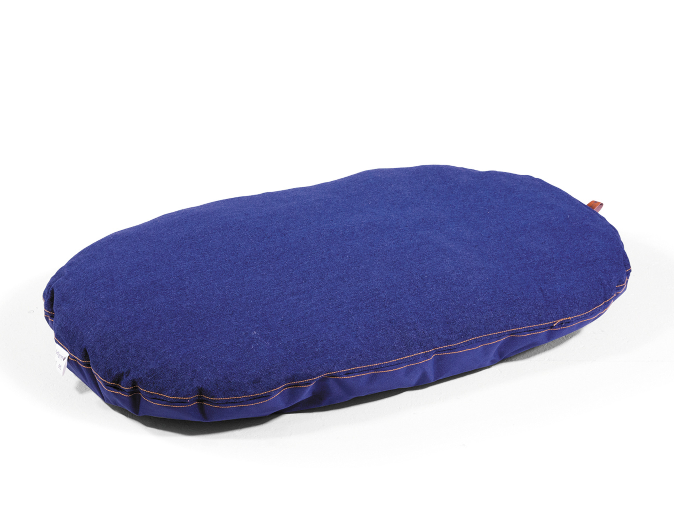 Het ovale hondenkussen Bluedenim is in bi-materiaal vervaardigd: de ene kant in jeans, de andere in oxford. De bruine overdruk contrasteert mooi met de blauwe kleur van de jeans en het oxford materiaal.Dankzij de kwaliteit van de afwerkingen kan het kussen langs beide zijden worden gebruikt.