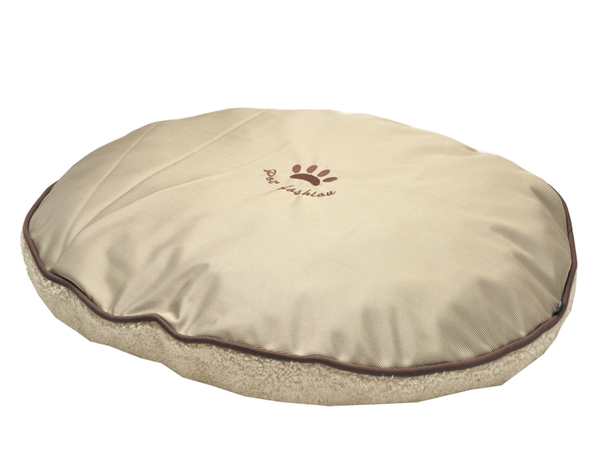 Zeer goed gevuld kussen, afgewerkt met boord.Twee stoffen: Oxford, resistent en waterproof en hoogwaardige teddy fleece. Lekker warm.100% polyester.Pluche is zacht en warm.Omkeerbaar, 2 bruikbare kanten.Met rits op de buitenhoes.