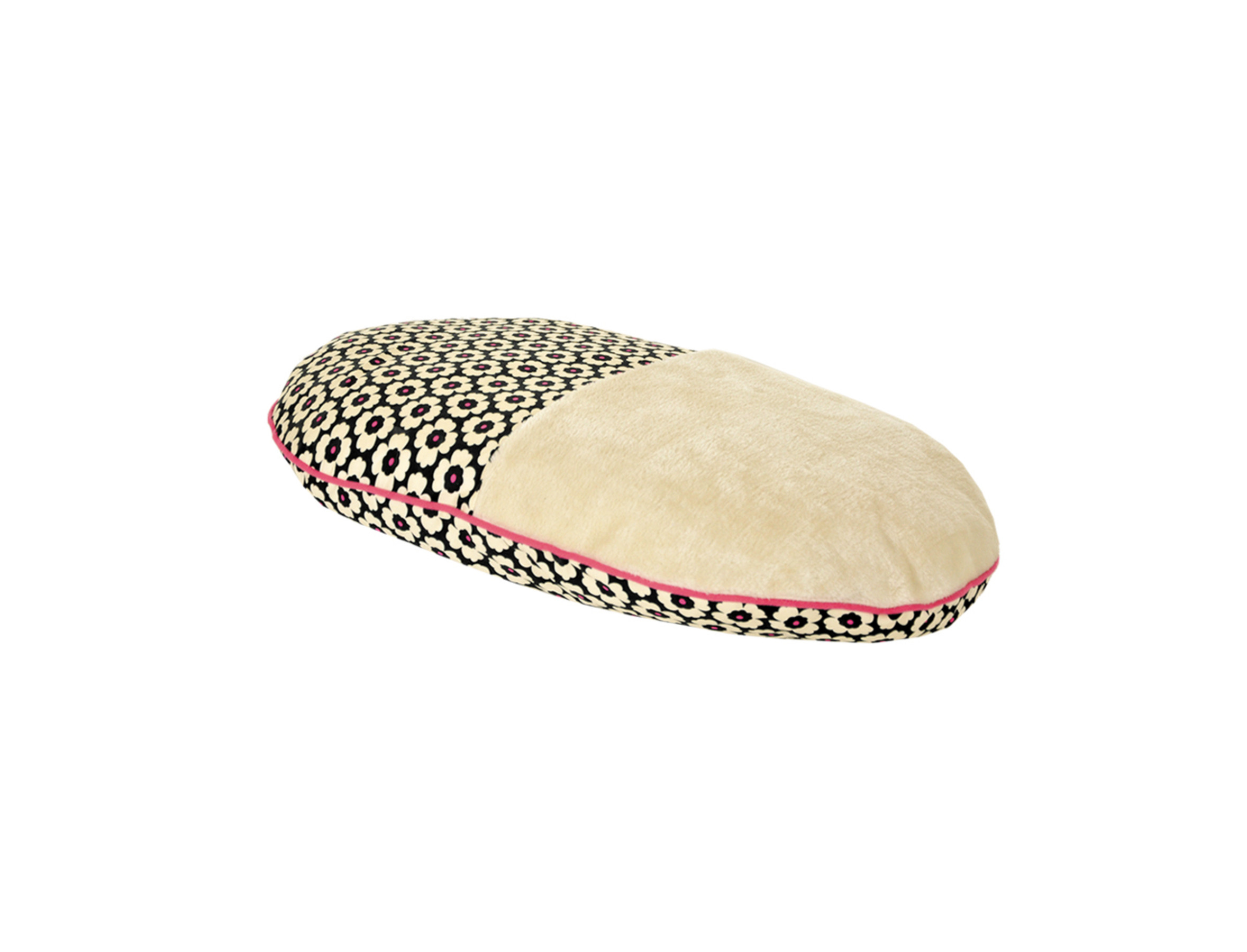 Mooi kussen bestaande uit 2 stoffen: lekker warme pluche en katoen met bloemenmotif.Bestaat uit twee verschillende materialen die afgewerkt zijn met een roze rand.