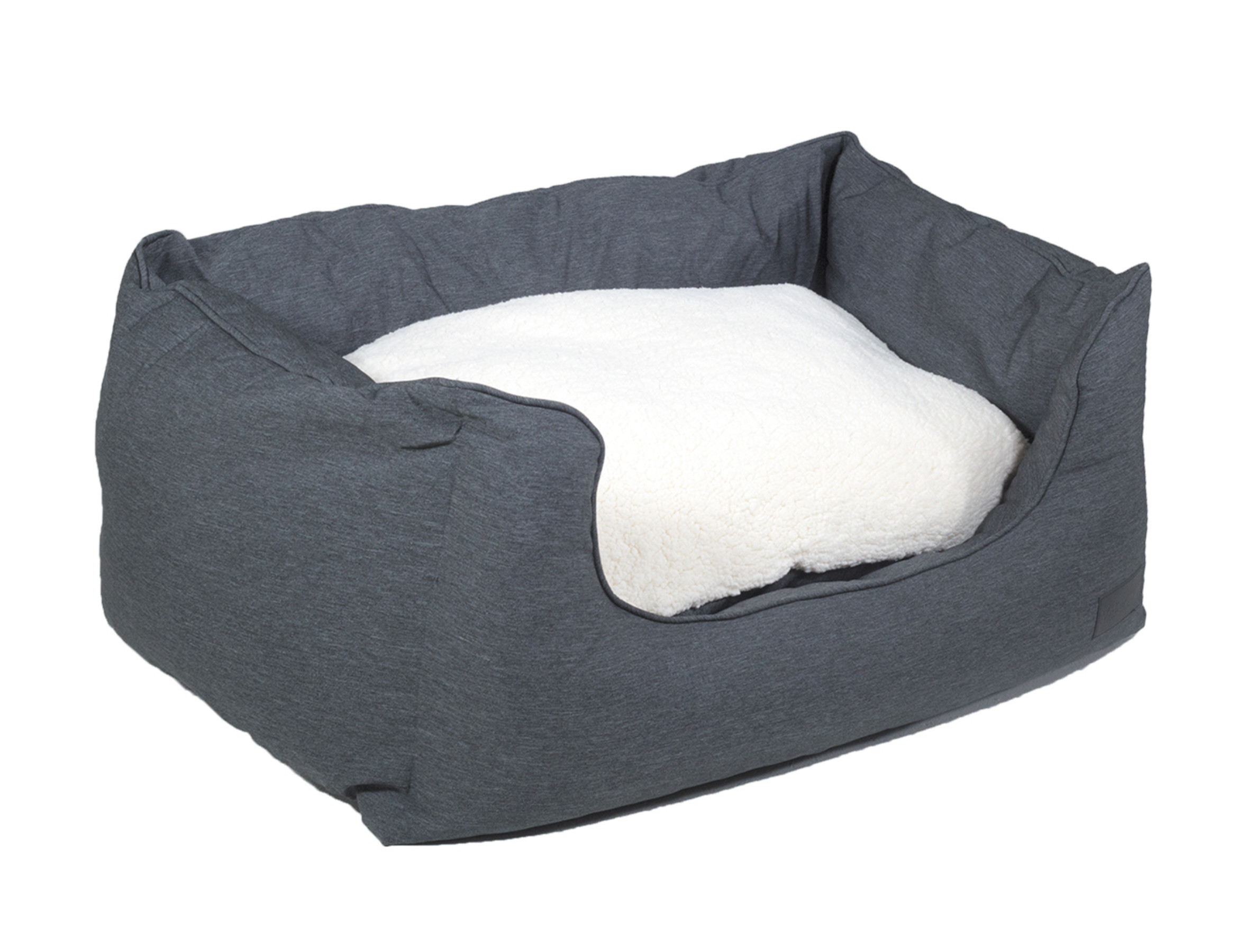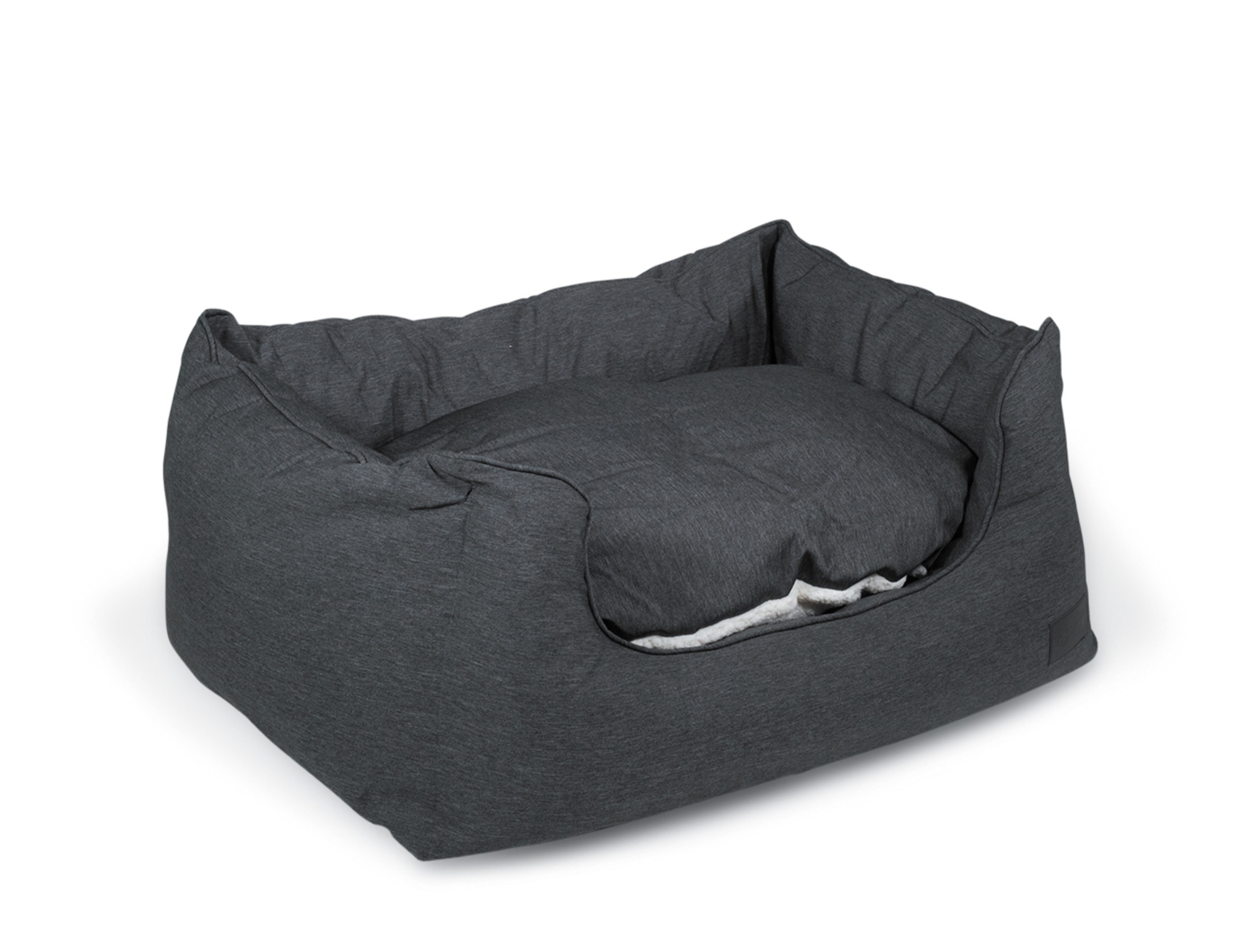 De Himalaya hondenmand is voorzien van een stevige vulling die de hond goed ondersteunt.De mand is bekleed met een volledig verwijderbaar kussen, met op elke zijde een stof in een andere kleur en materiaal: een zachte witte fleece aan de ene kant en een robuuste en vuilafstotende antraciet stof aan de andere kant.De hoes is afneembaar en kan machinaal gewassen worden op 30°C.
