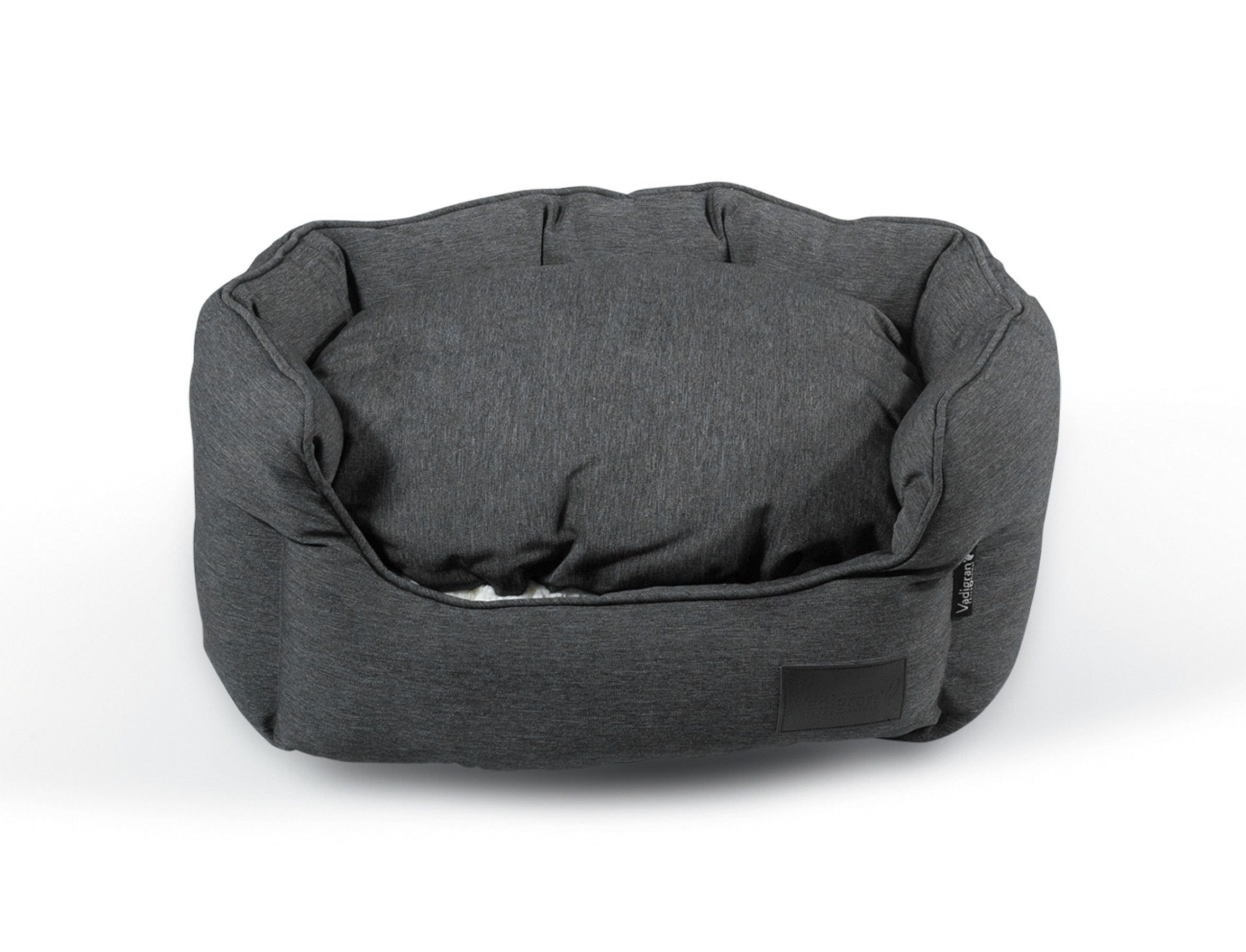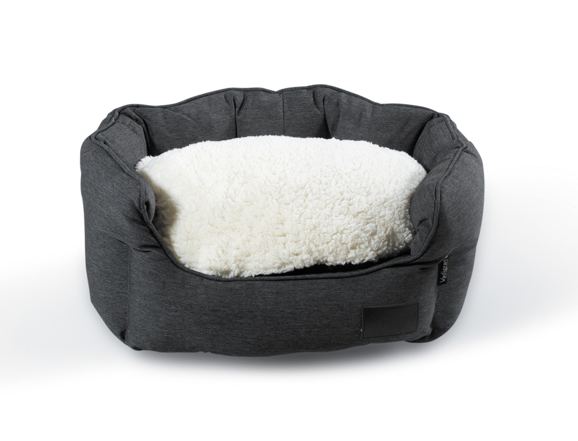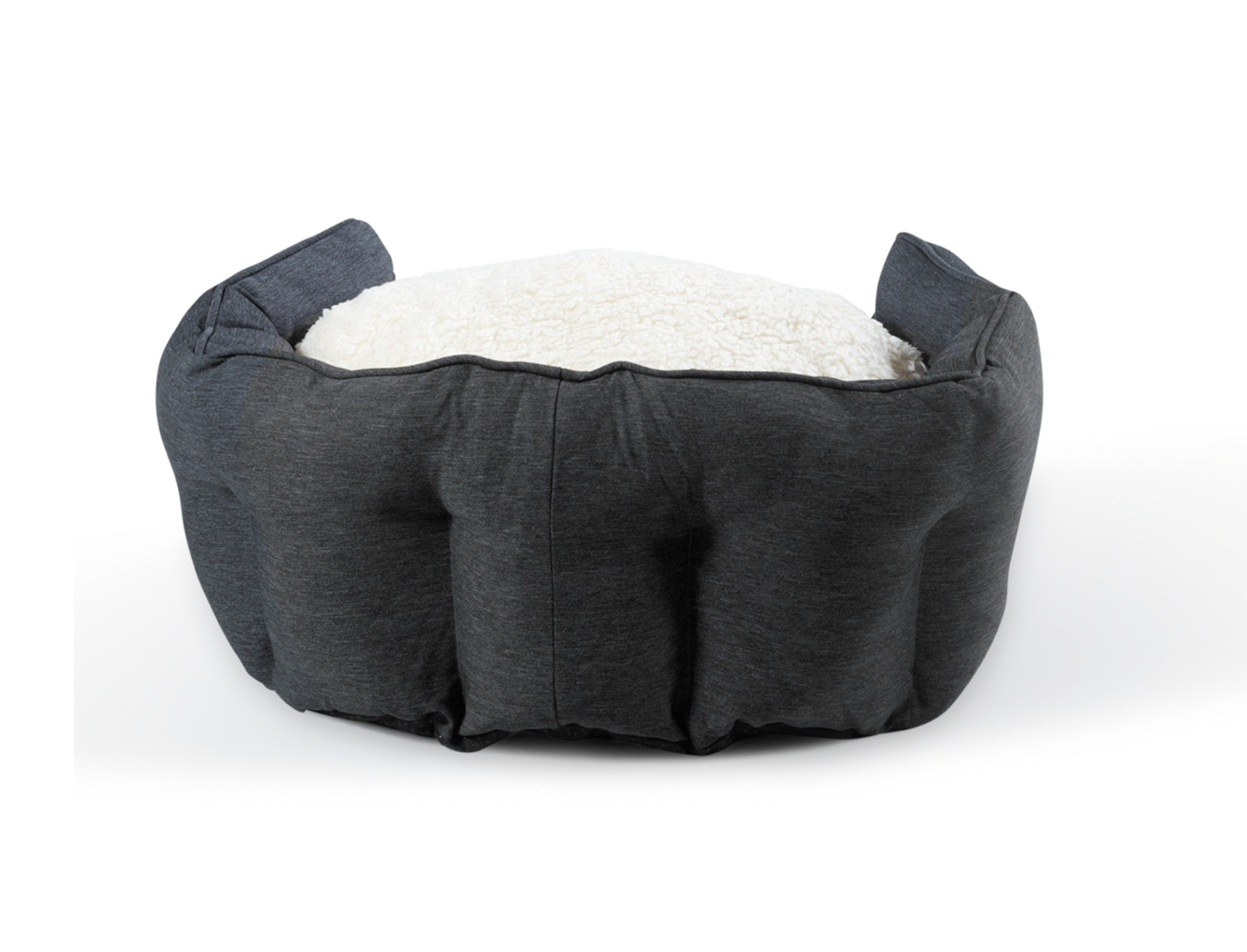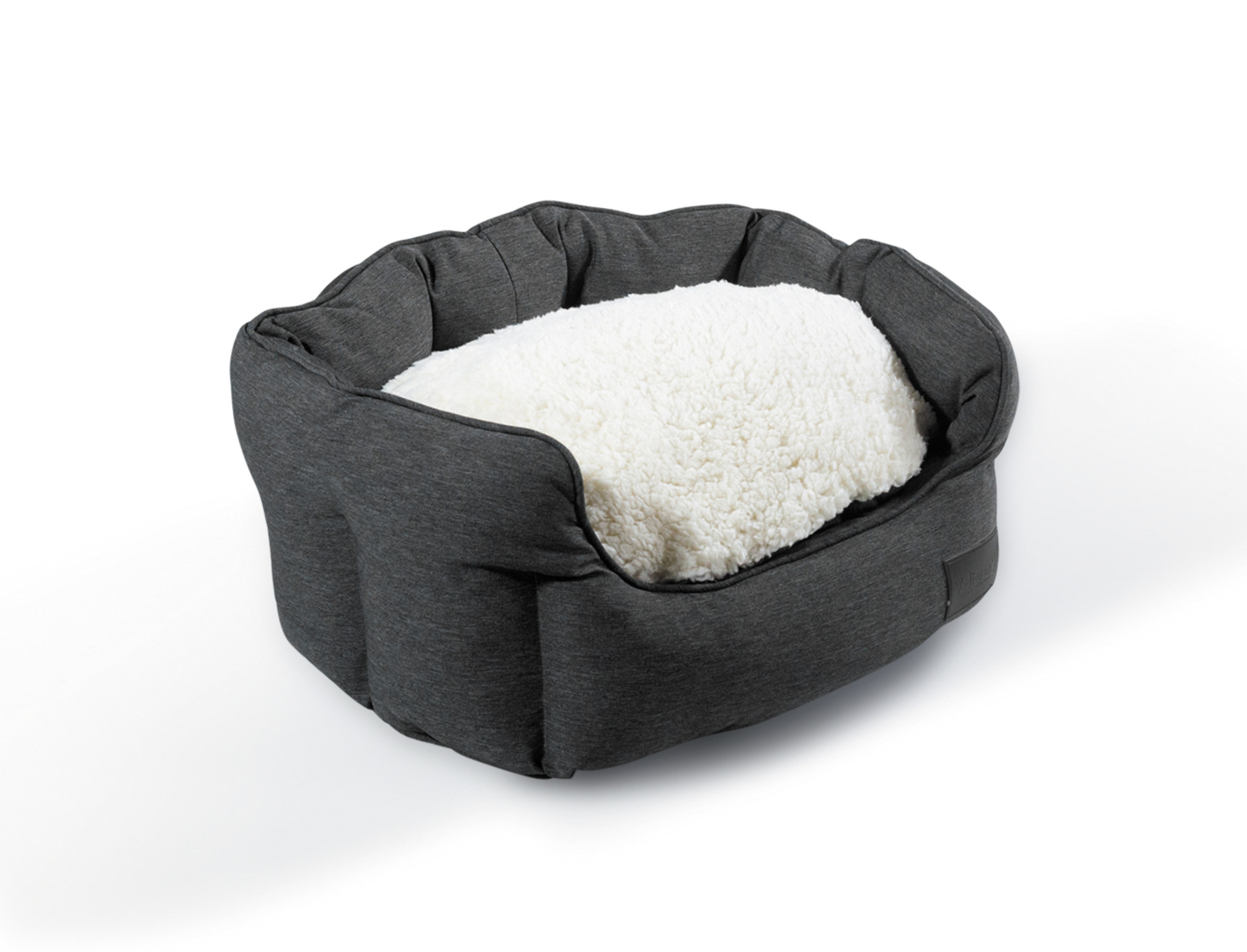 De mand is bekleed met een volledig verwijderbaar kussen, met op elke zijde een stof in een andere kleur en materiaal: een zachte witte fleece aan de ene kant en een robuuste en vuilafstotende antraciet stof aan de andere kant.