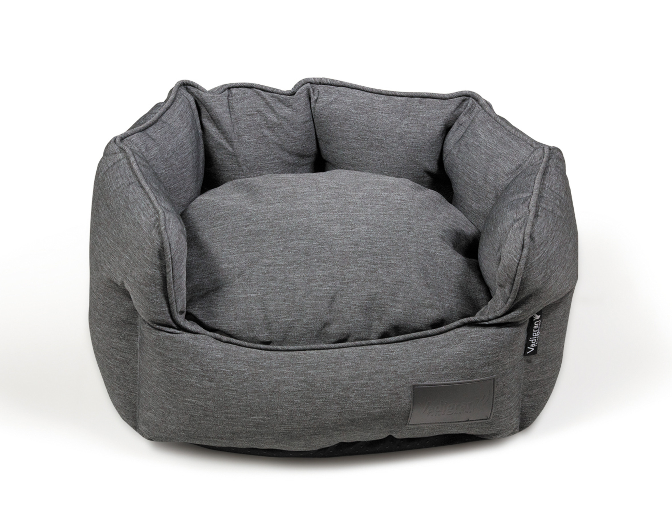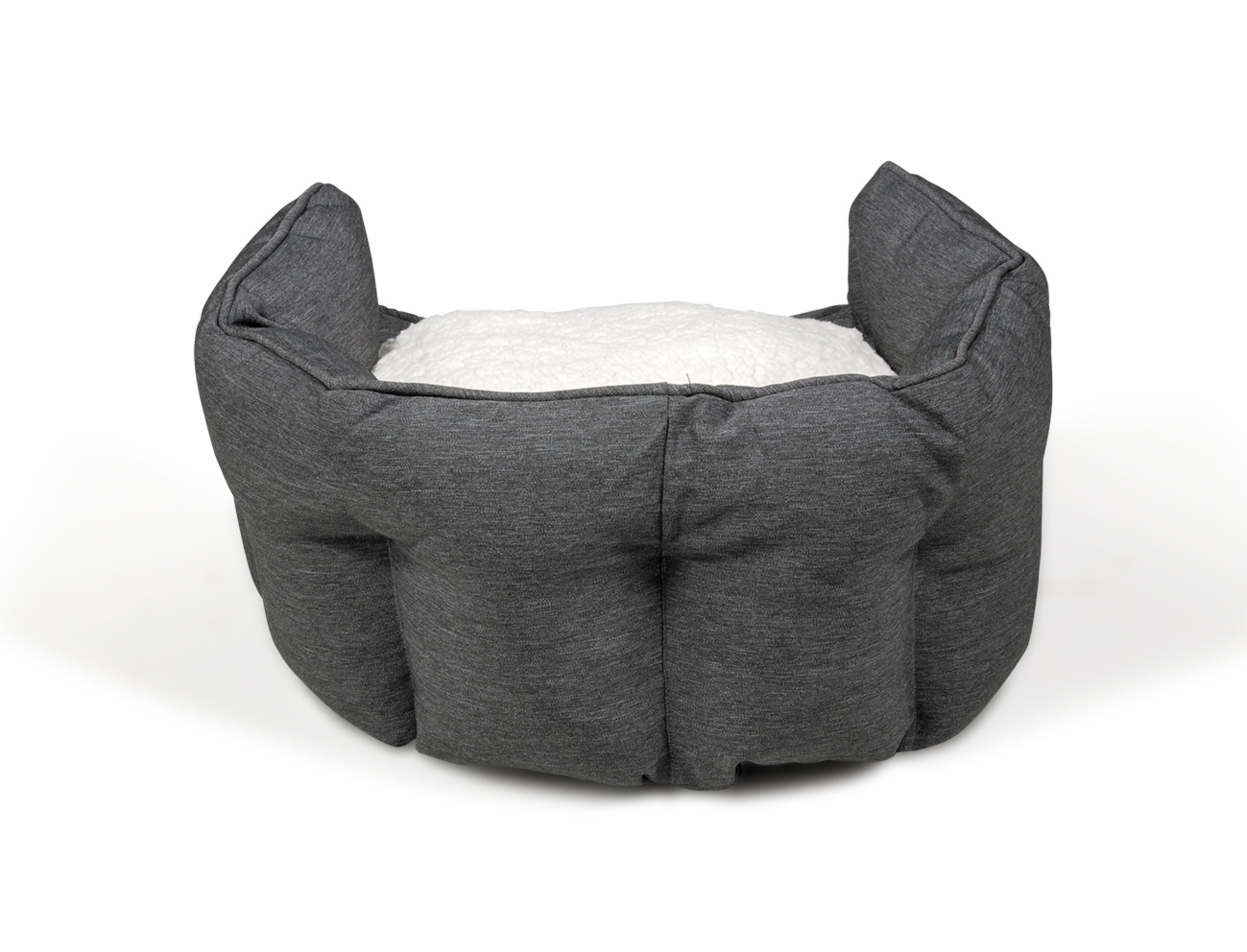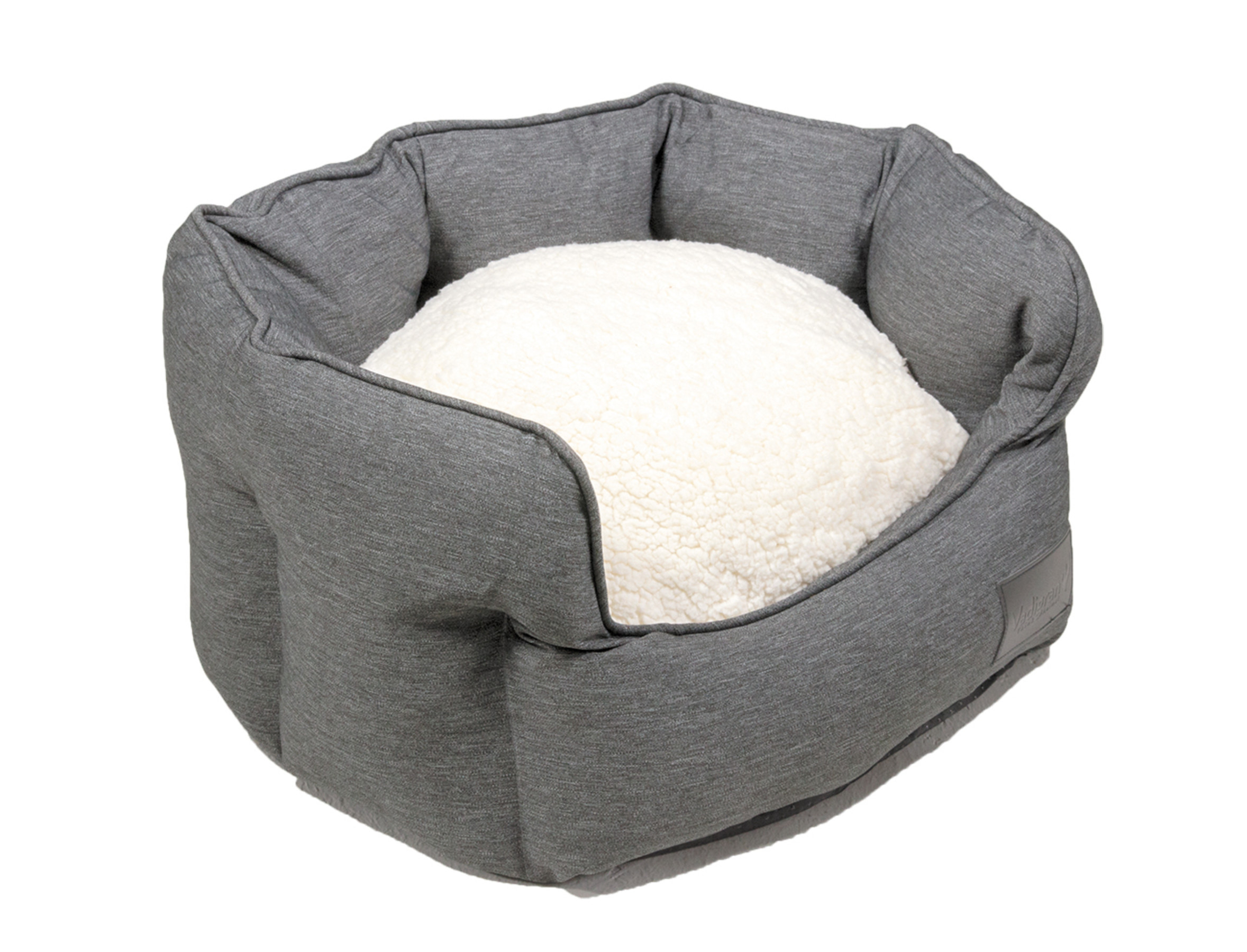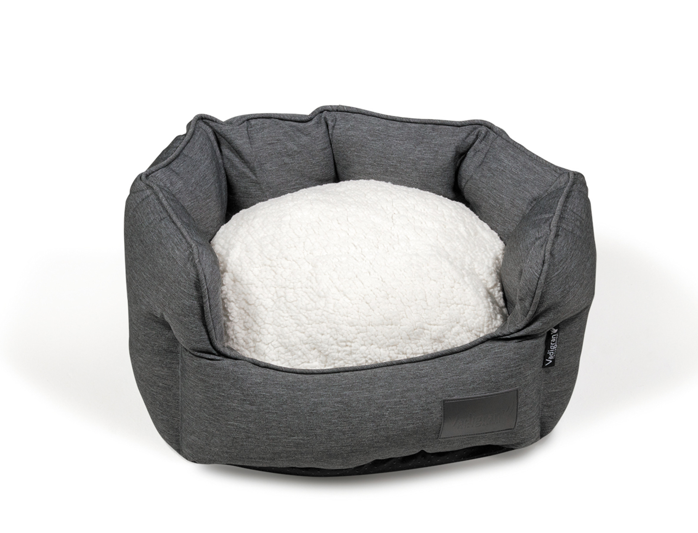 De mand is bekleed met een volledig verwijderbaar kussen, met op elke zijde een stof in een andere kleur en materiaal: een zachte witte fleece aan de ene kant en een robuuste en vuilafstotende antraciet stof aan de andere kant.