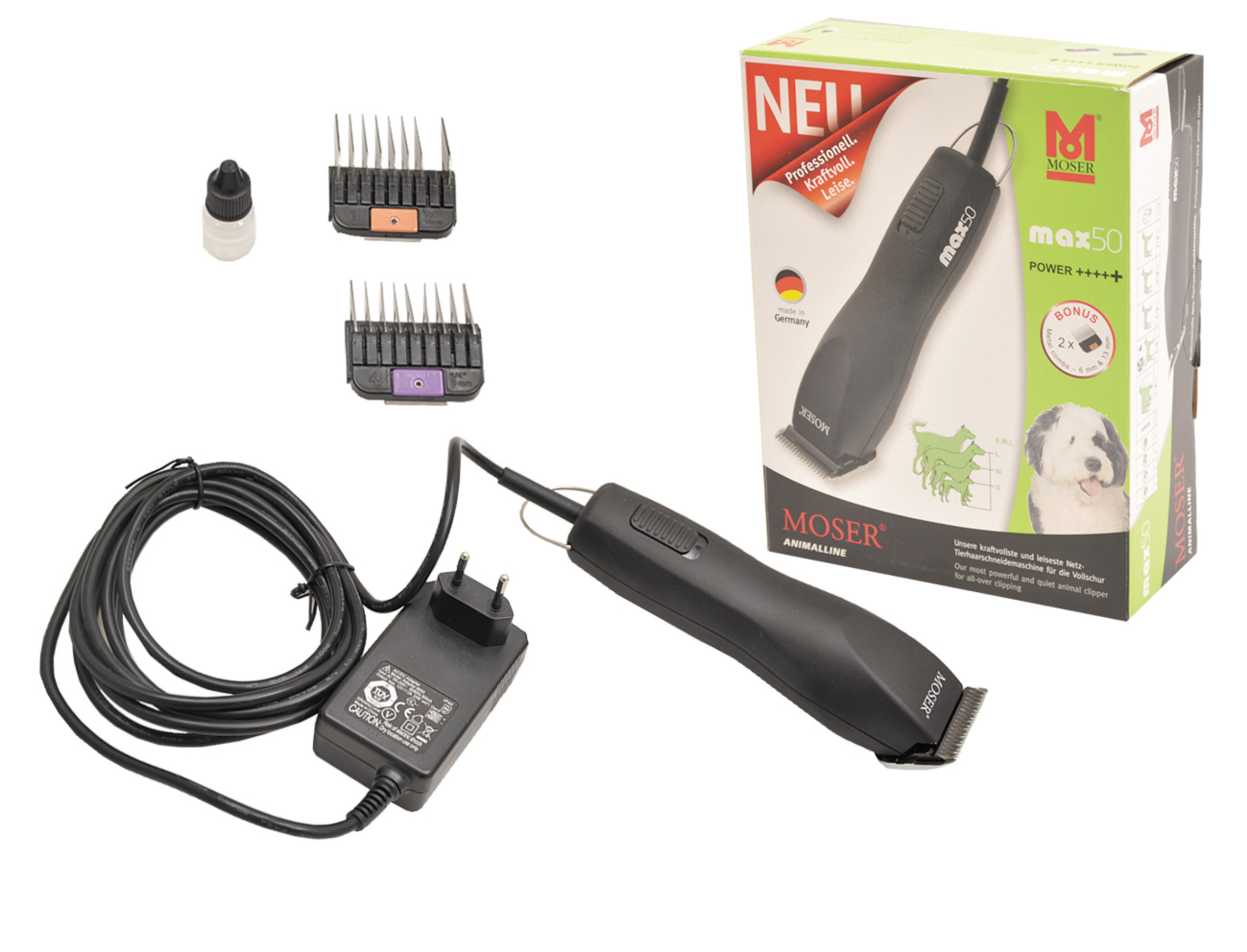 De kit omvat: een mes van 1 mm, twee metalen kammen van 6mm en 13mm, olie en een reinigingsborstel.