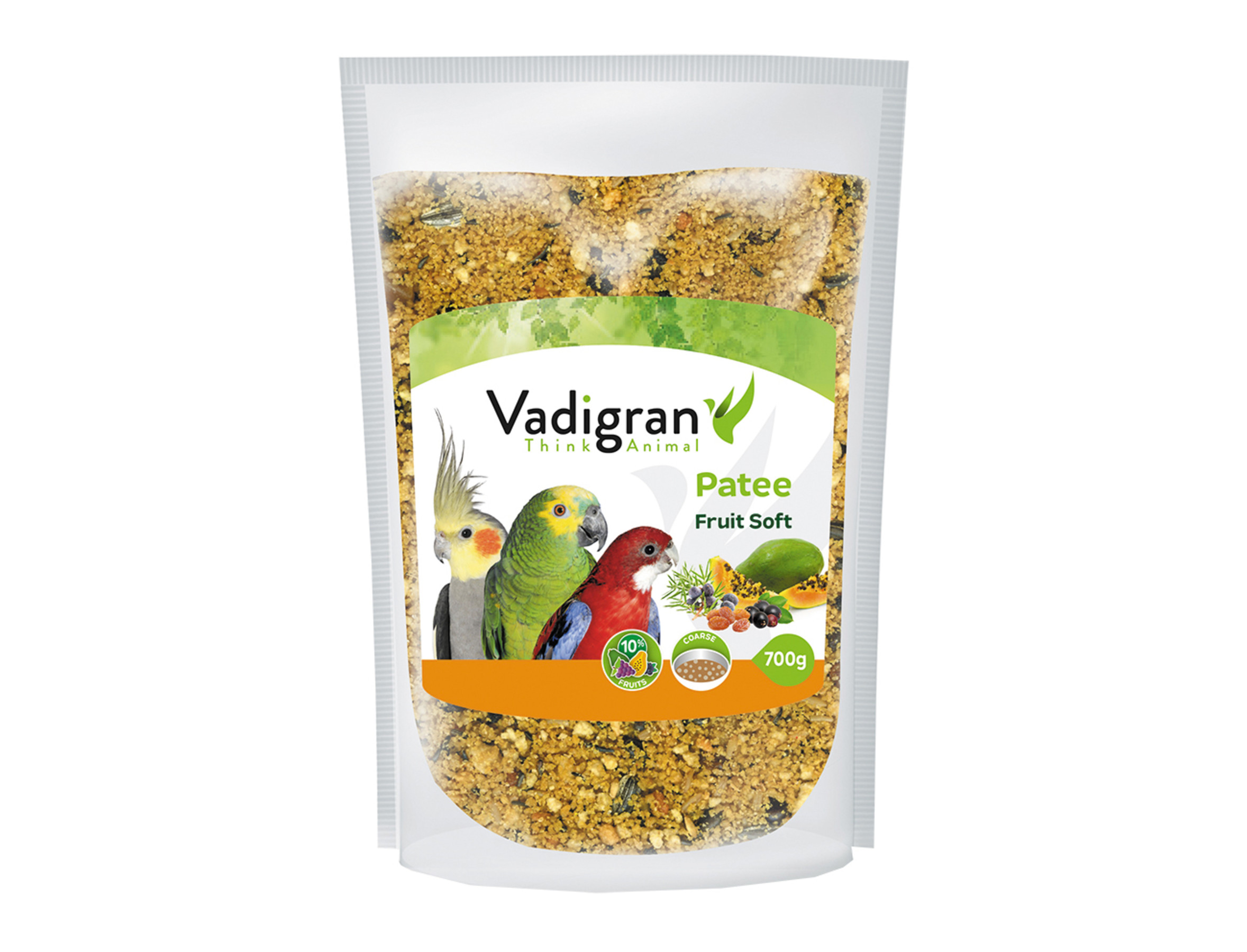 Vadigran Patee Fruit Soft is een semi-rul zachtvoer van excellente kwaliteit dat volledig klaar is voor gebruik. De grovere structuur en de smakelijke mix van verschillende soorten fruit (10%), bessen en zonnebloempitten maken dit product aantrekkelijk voor parkieten en papegaaien.Waarom zou je paté geven aan vogels? Vogels een kwaliteitsvol dieet geven op basis van zaden is essentieel voor hun gezondheid, welzijn en de schoonheid van hun verenkleed. Op bepaalde tijden van het jaar hebben gekweekte vogels echter een supplement nodig van vitaminen, mineralen en eiwitten. De patés bieden hen dit kleine surplus dat hun dieet op deze meest delicate momenten geschikt en evenwichtig maakt. Ze bevatten een grote verscheidenheid aan vitaminen, mineralen en eiwitten die elk hun functie en dus hun specifieke bijdrage zullen hebben. De eiwitten leveren de essentiële aminozuren voor het goed functioneren van het metabolisme van de vogel. Daarom bevatten de patés van Vadigran hoogwaardige eiwitten met 29 aminozuren.