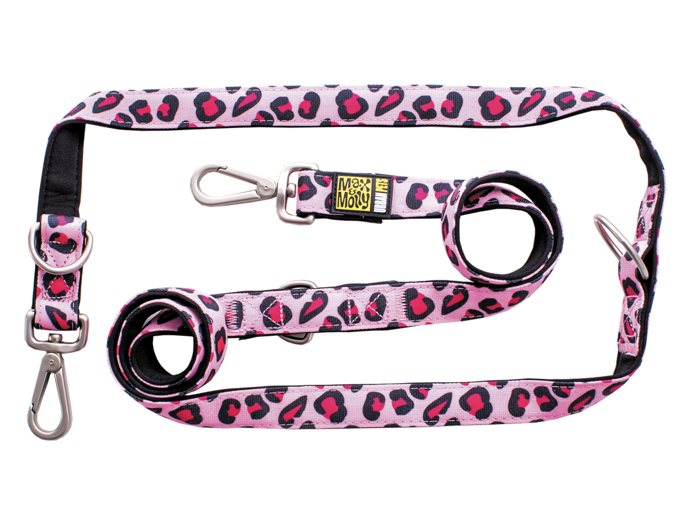 Multifunctionele hondenleiband die zich aan elke situatie aanpast tijdens een wandeling. Hier zijn 7 opties: 1m korte afstand; 1,3m medium afstand; 1,6m lange afstand, heupleiband, schouderleiband, dubbele leiband en tijdelijke aanlegketting.Kan ook om de borst of schouder geknoopt worden voor een handenvrije wandeling.Je hond zal genieten van deze unieke, 3-delige sandwich structuur : een dikke laag ultra sterk polyester aan de buitenkant, een zachte vulling binnenin en een moderne, anti-allergische neoprene laag die snel opdroogt aan de nek van de hond.Het blijft comfortabel, ongeacht het aantal keren dat je het om je hand wikkelt. Na onze veiligheidstesten te hebben doorstaan bewijst deze leiband dat je hond niet zal kunnen ontsnappen.Alle metalen onderdelen zijn mooi glad gemaakt. De haak is makkelijk vast te hechten zonder dat je vingers of nagels ervan pijn doen.