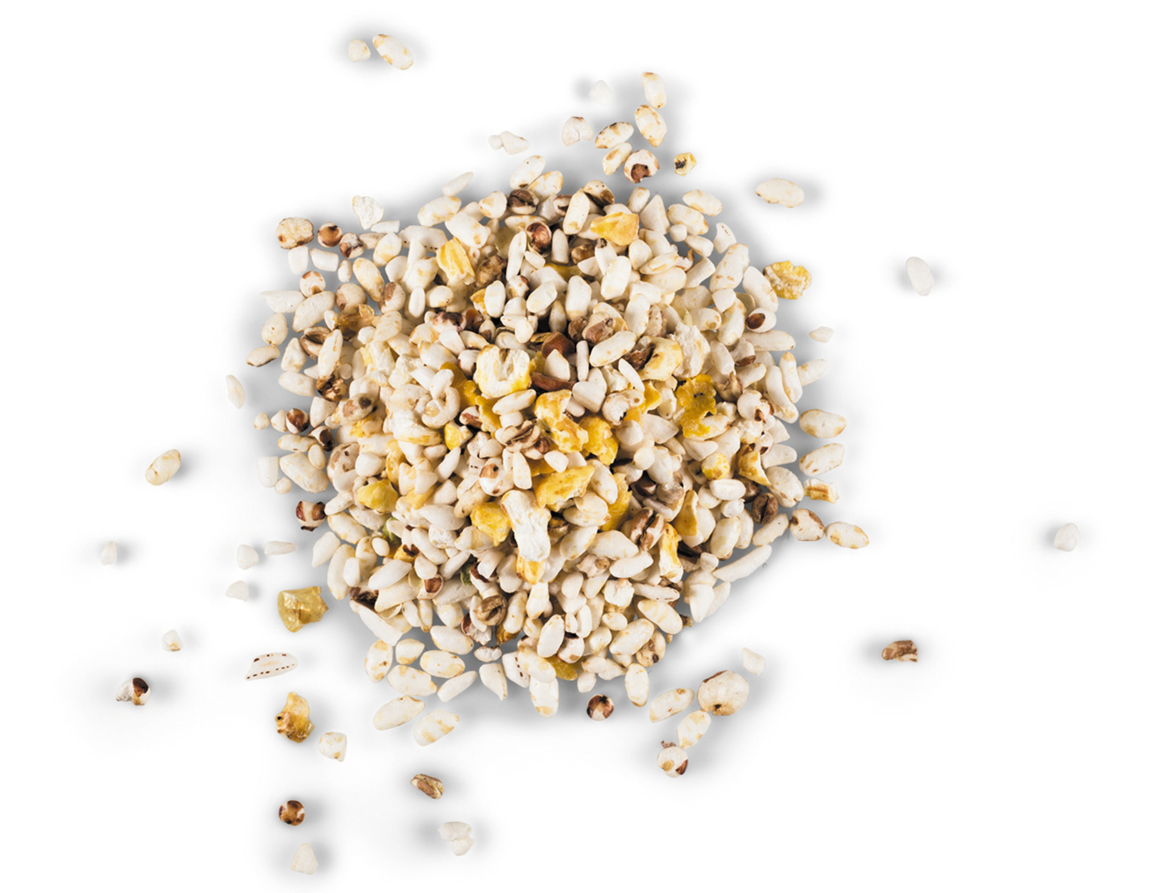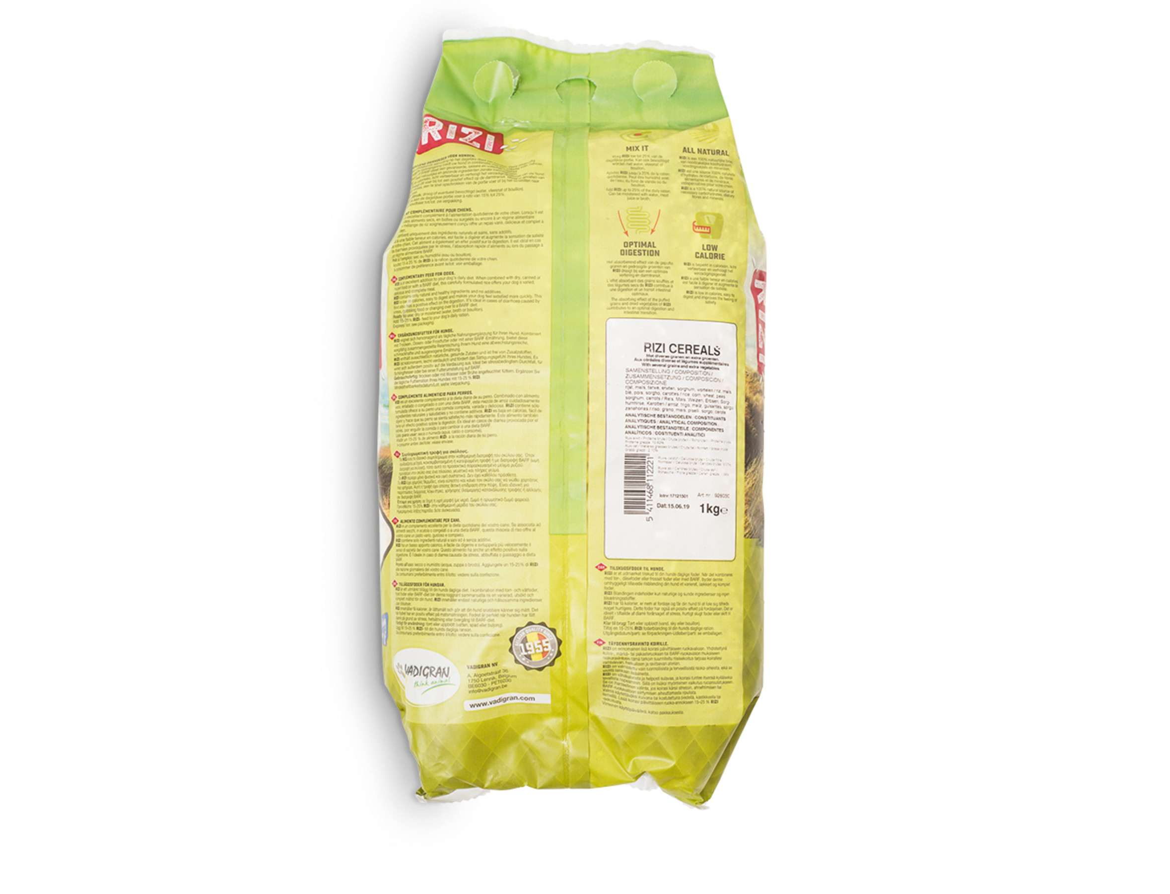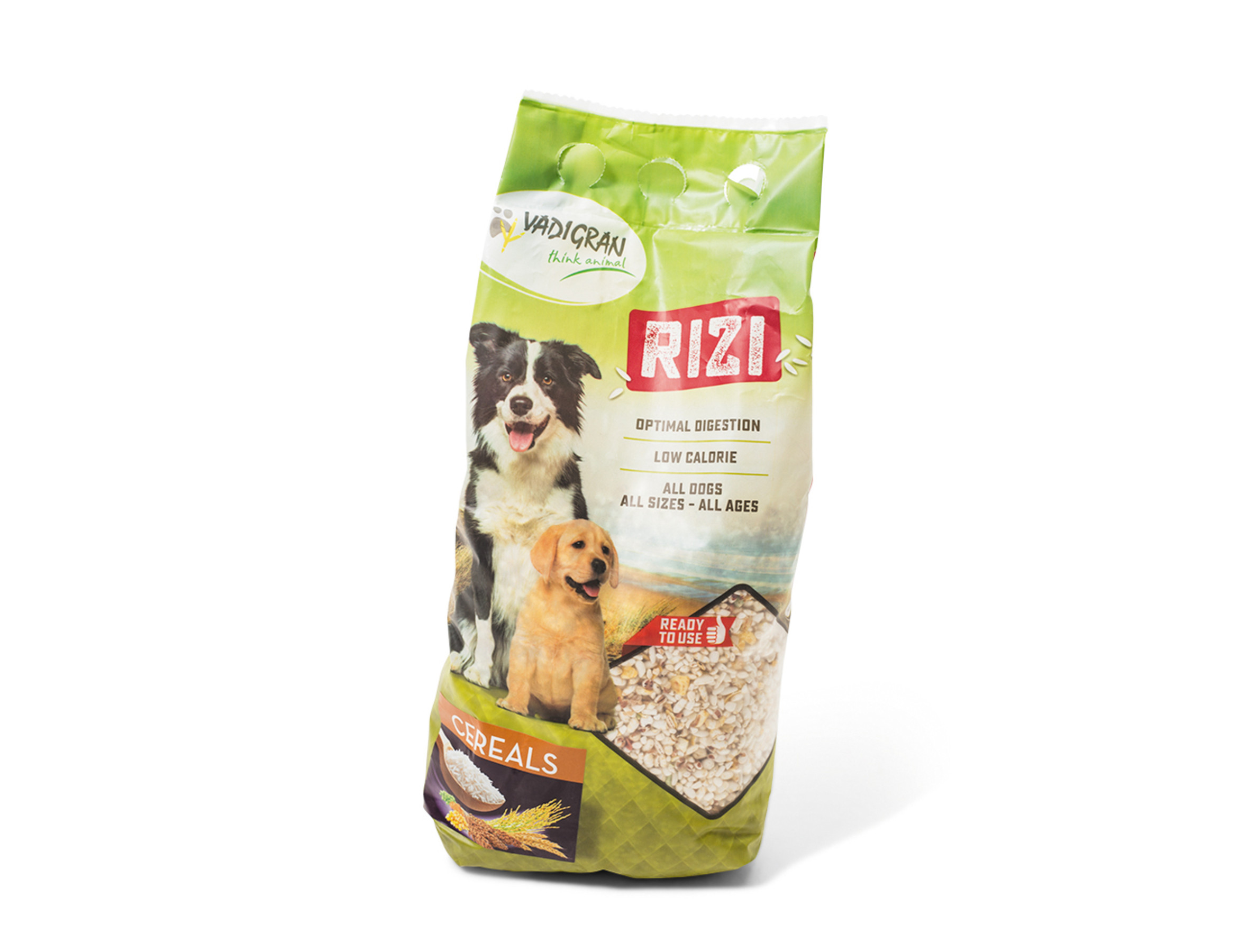 RIZI Cereals bevat voornamelijk granen – rijst, maïs, tarwe en sorghum – en ook groenten – wortelen en erwten.RIZI is een rijstmengeling voor alle honden en bevat enkel natuurlijke, gezonde en herkenbare ingrediënten zonder kunstmatige toevoegingen, is caloriearm en verhoogt het verzadigingsgevoel van de hond.De vezels in de gedroogde groenten en het absorberende effect van de gepofte granen dragen positief bij tot een optimale darmtransit en een makkelijke vertering.RIZI is een waardevolle en essentiële bron van koolhydraten, voedingsvezels, vitamines en mineralen; kan in combinatie met droogvoer, natvoer, diepvriesvoer of BARF gegeven worden.