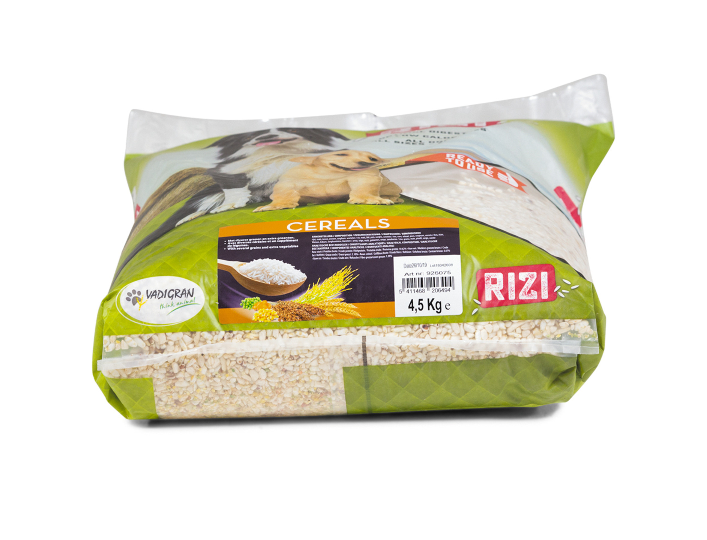RIZI Cereals bevat voornamelijk granen – rijst, maïs, tarwe en sorghum – en ook groenten – wortelen en erwten.RIZI is een rijstmengeling voor alle honden en bevat enkel natuurlijke, gezonde en herkenbare ingrediënten zonder kunstmatige toevoegingen, is caloriearm en verhoogt het verzadigingsgevoel van de hond.De vezels in de gedroogde groenten en het absorberende effect van de gepofte granen dragen positief bij tot een optimale darmtransit en een makkelijke vertering.RIZI is een waardevolle en essentiële bron van koolhydraten, voedingsvezels, vitamines en mineralen; kan in combinatie met droogvoer, natvoer, diepvriesvoer of BARF gegeven worden.